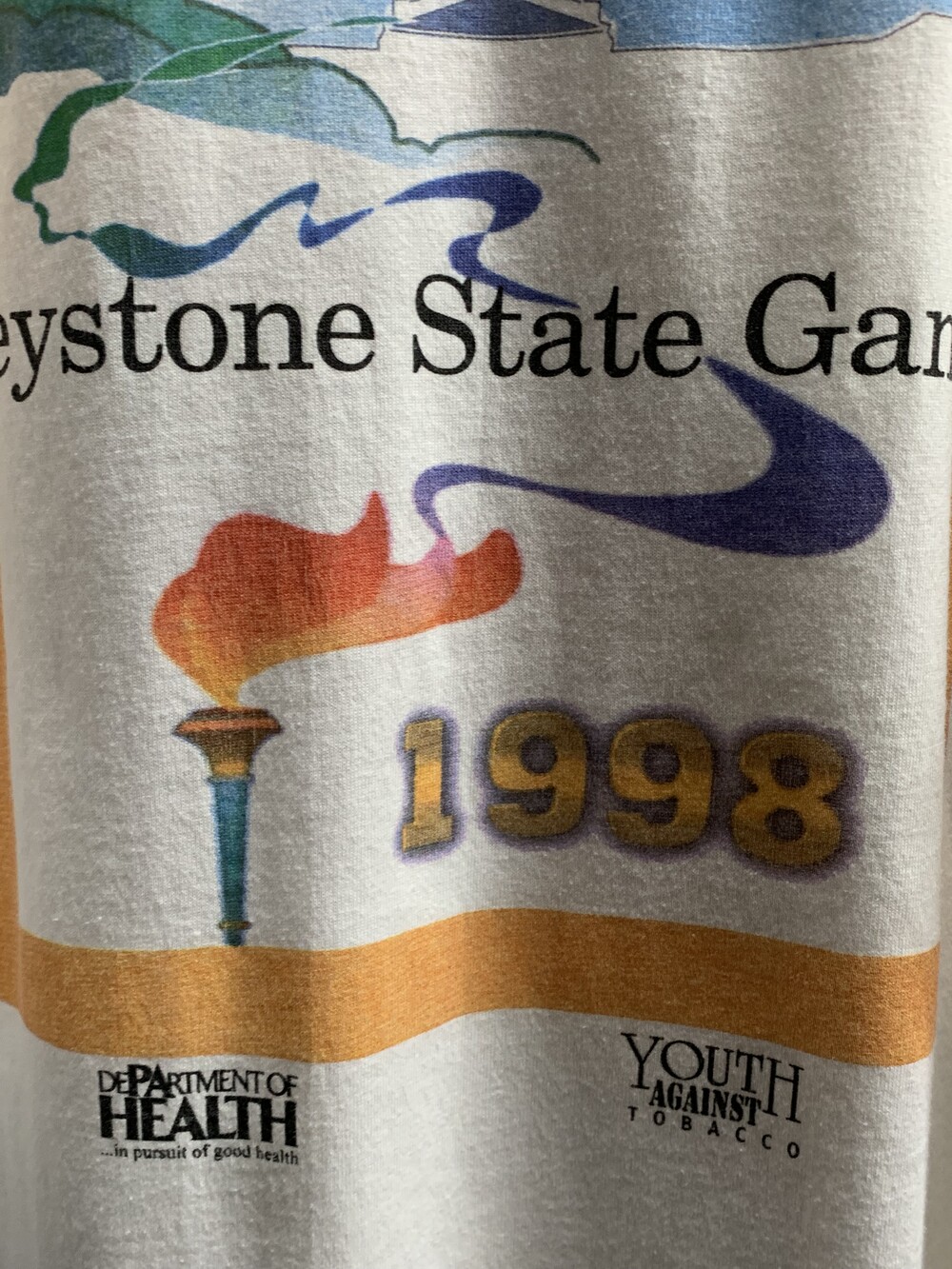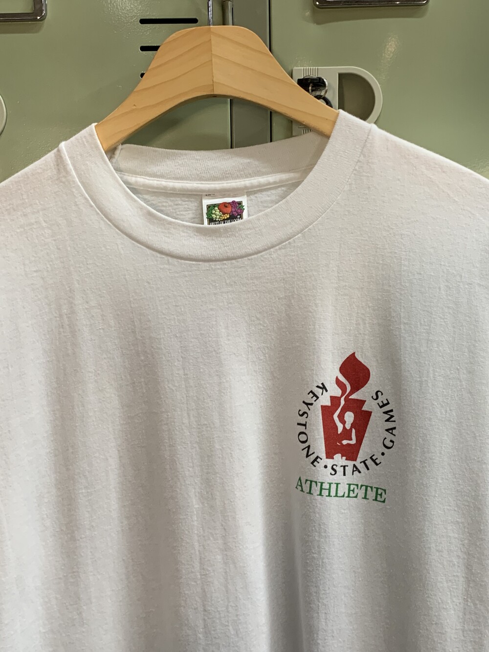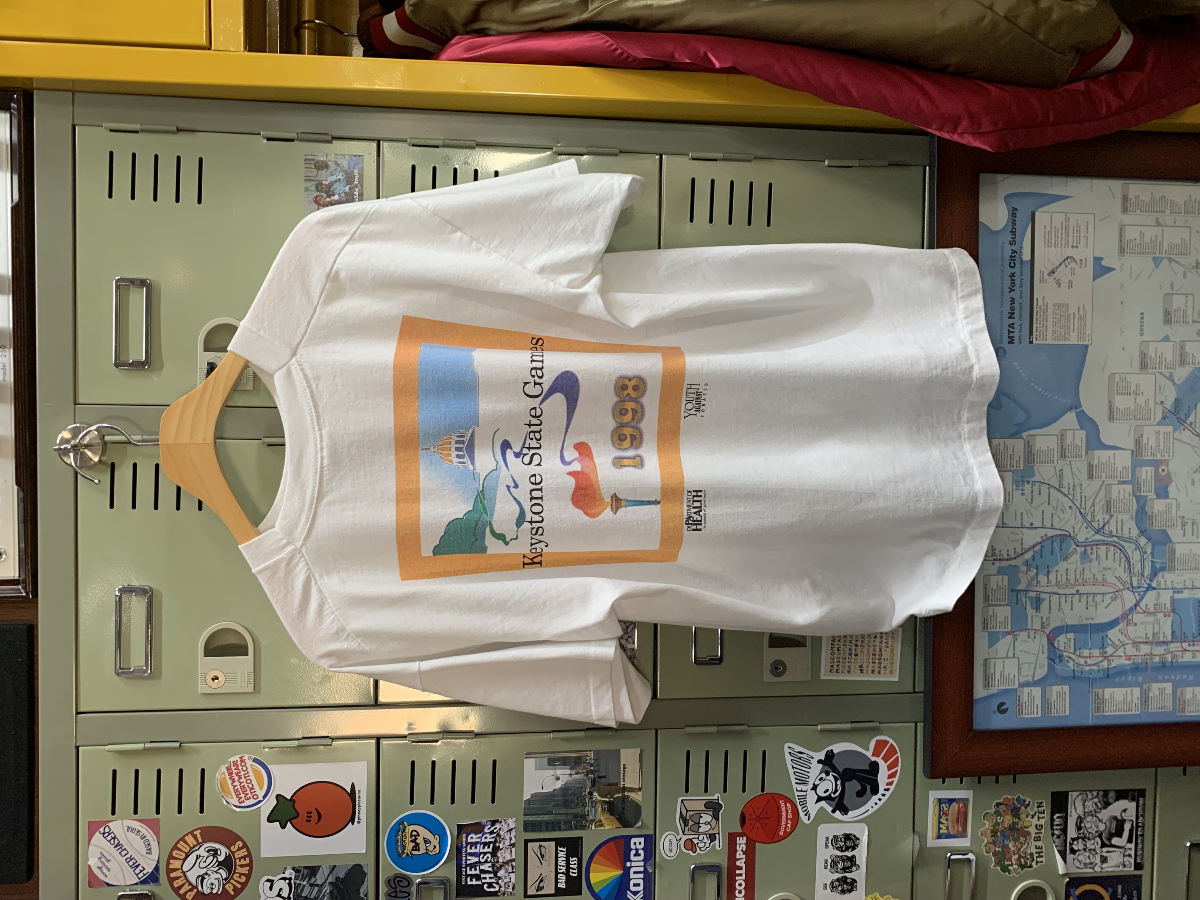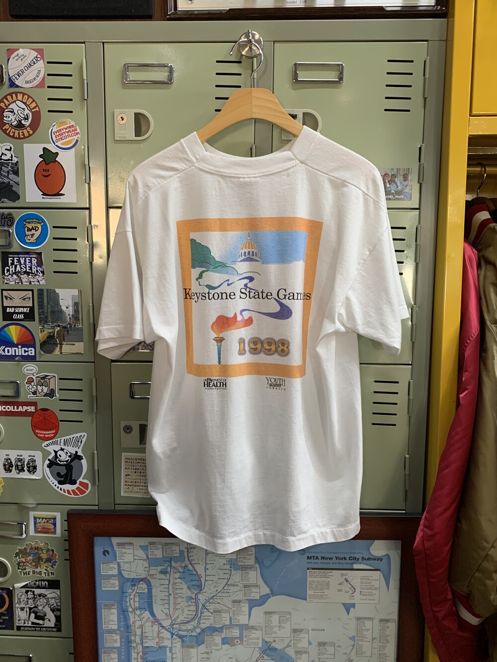 미국 펜실베니아 주에서 모든 연령대를 대상으로 열리는 아마추어 스포츠 대회 키스톤 스테이트 게임즈(Keystone State Games) 프로모션 프린팅이 전후면에 올려진 제품으로, 당시 참가자들에게 지급되었던 티셔츠로 추정되는 제품입니다.