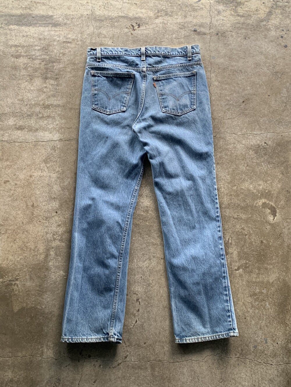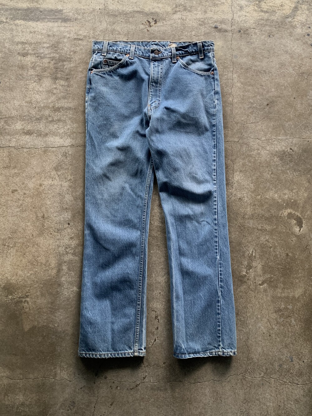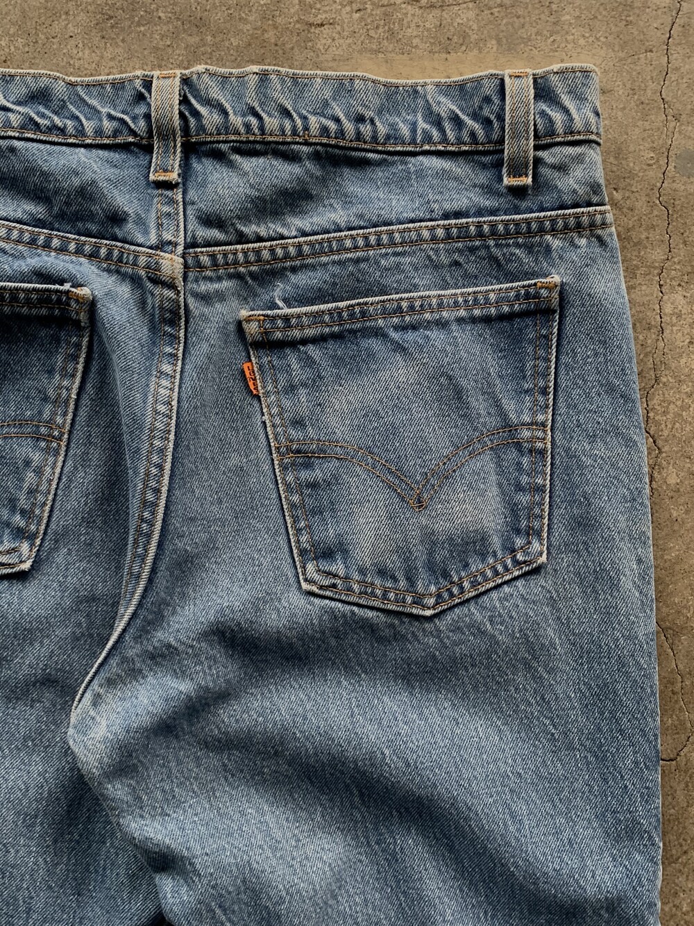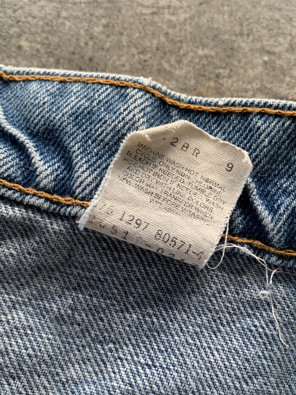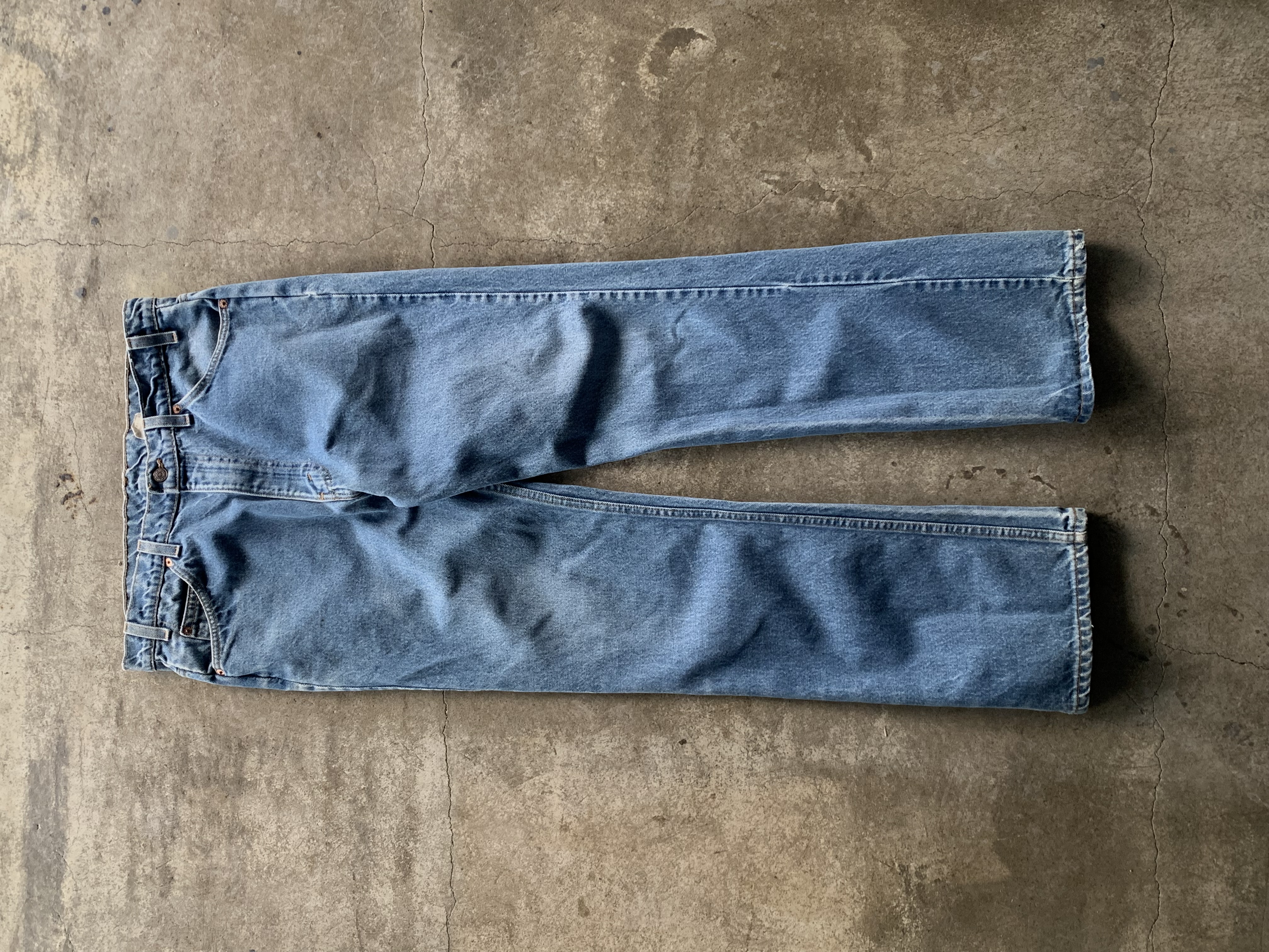 오렌지탭이 붙은 1997년 12월미국 생산 리바이스 517 데님팬츠입니다. 무릎 너비와 밑단 너비의 대비가 크지 않은 완만한 부츠컷 실루엣이 돋보입니다. 비교적 균일하게 빠진 색상과 부츠컷 실루엣다운 슬림한 비례감이 매력적인 제품입니다.