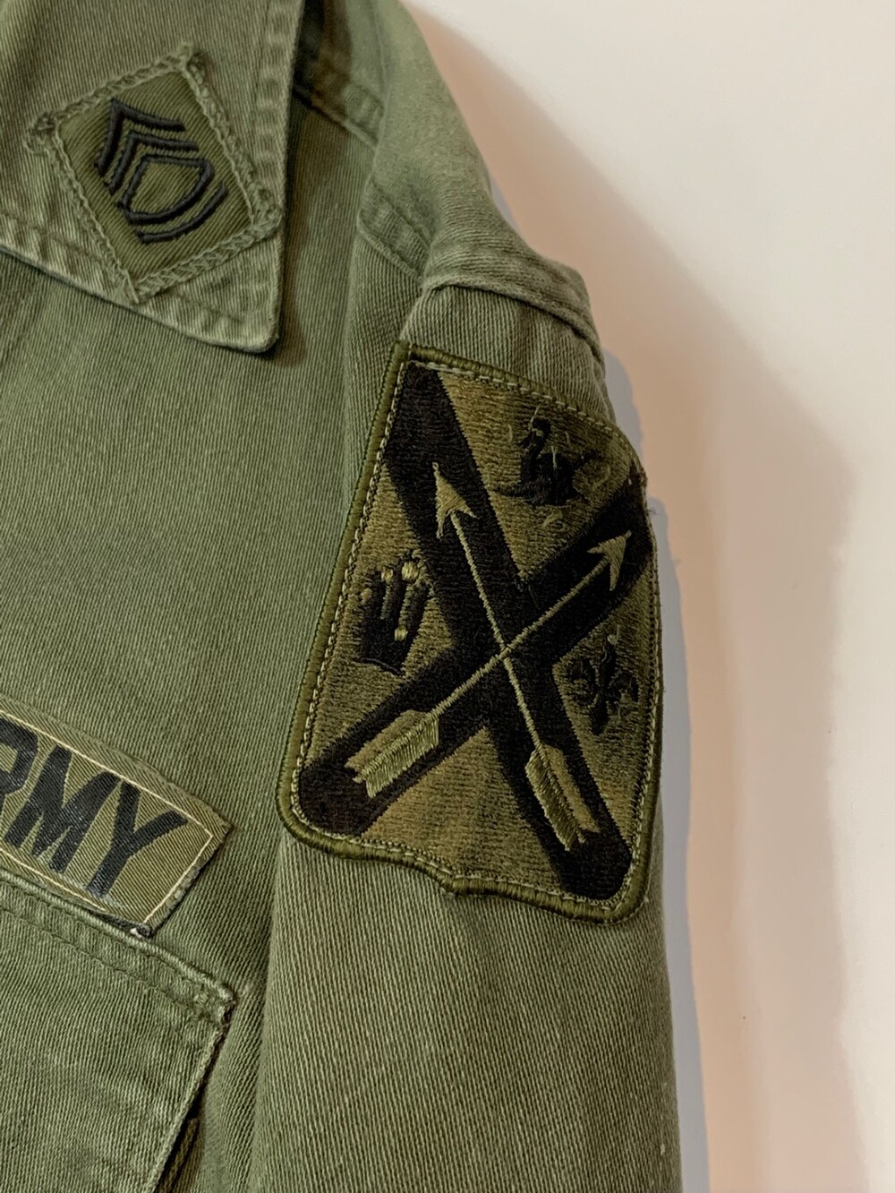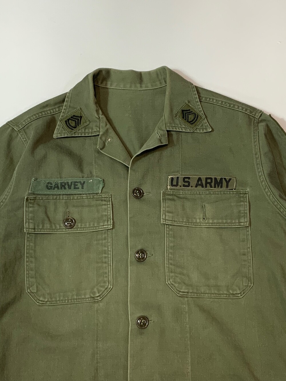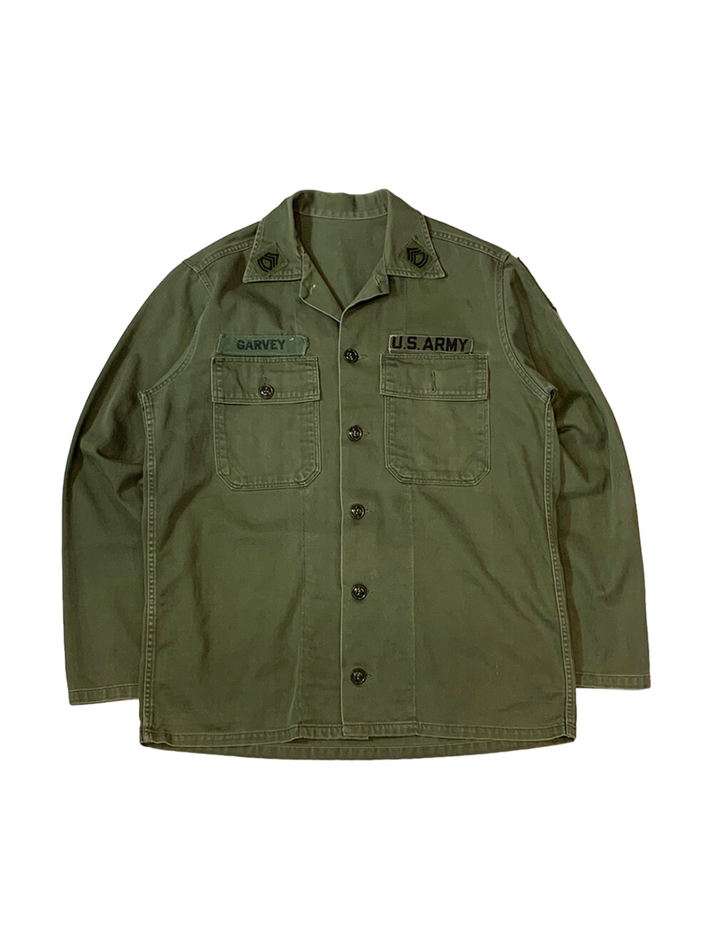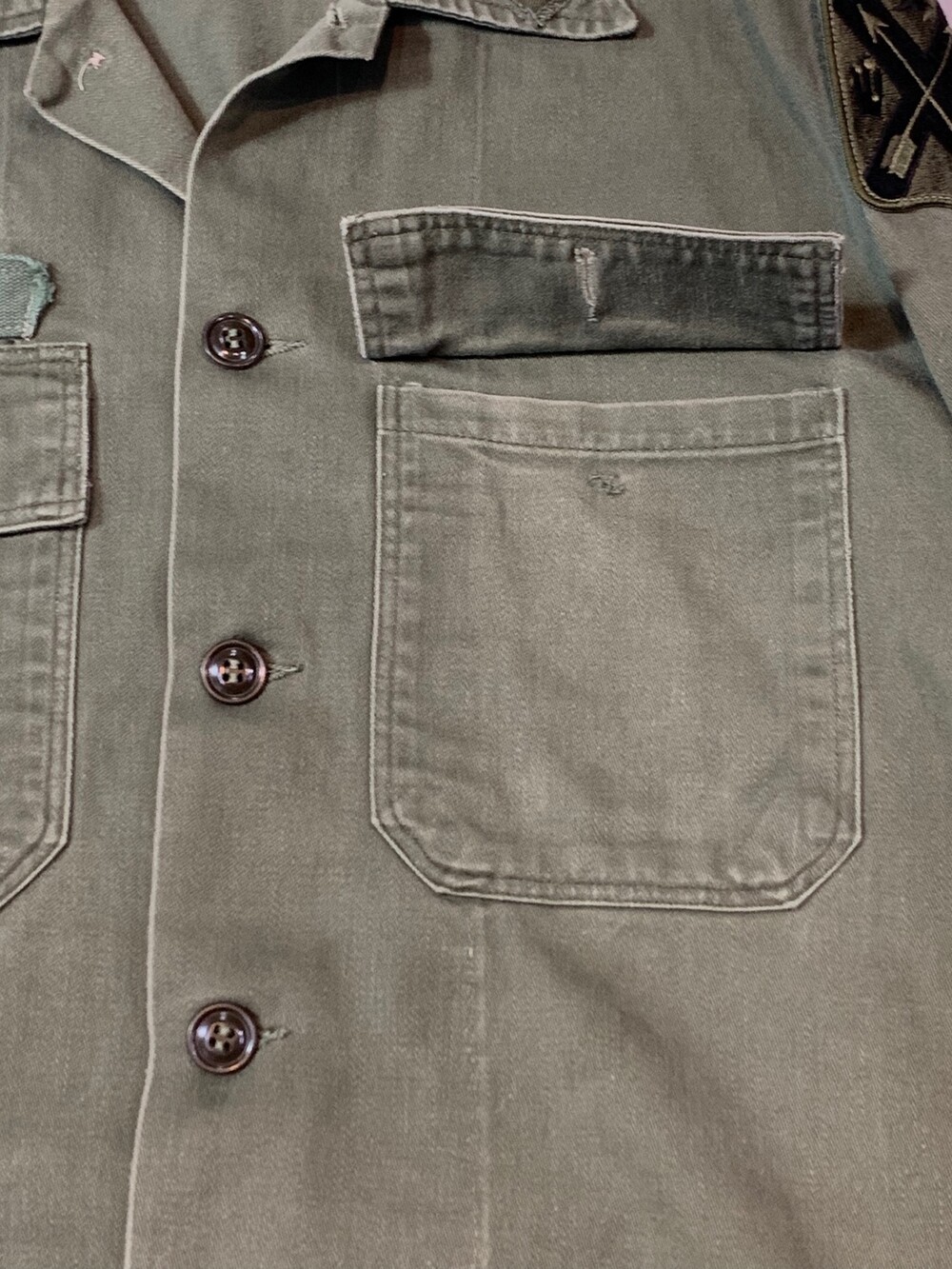 플랩 포켓 간격이 가깝고 전면 절개선이 포켓을 지나는, 별도의 사이즈 표기가 없는 것으로 보아 후면 스탬핑이 지워진 것으로 추정되는 1950-60년대 초반 생산 초기형 OG-107 유틸리티 셔츠입니다.