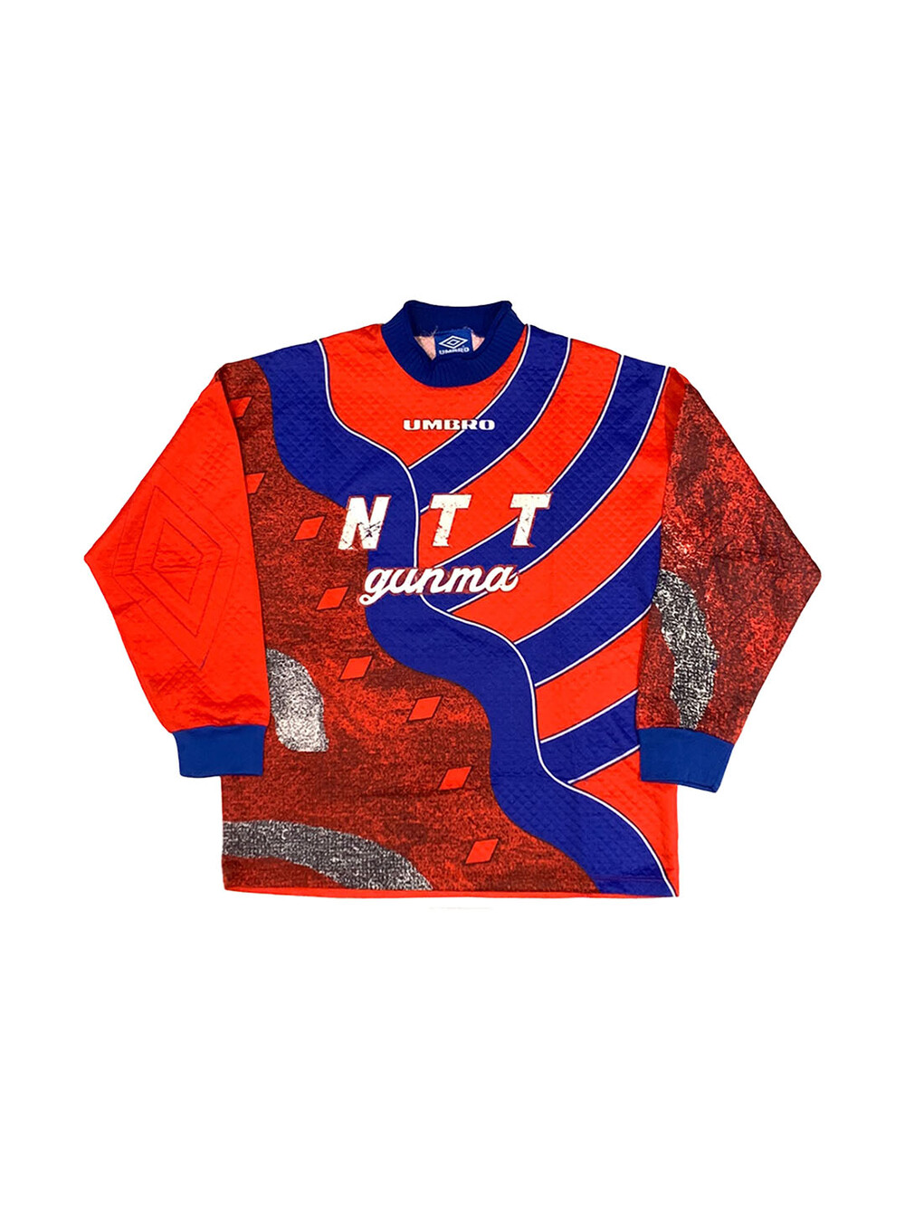 전면에 퀼팅이 들어간 엄브로의 키퍼용 풋볼 셔츠. 일본의 통신 산업 회사 NTT 군마현 지점 직원들의 축구동호회 프린팅이 올려진 것으로 추정.