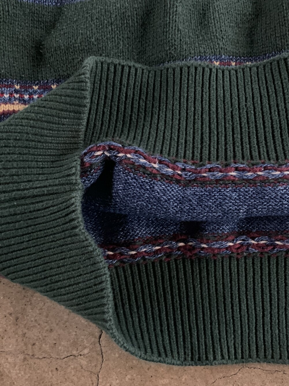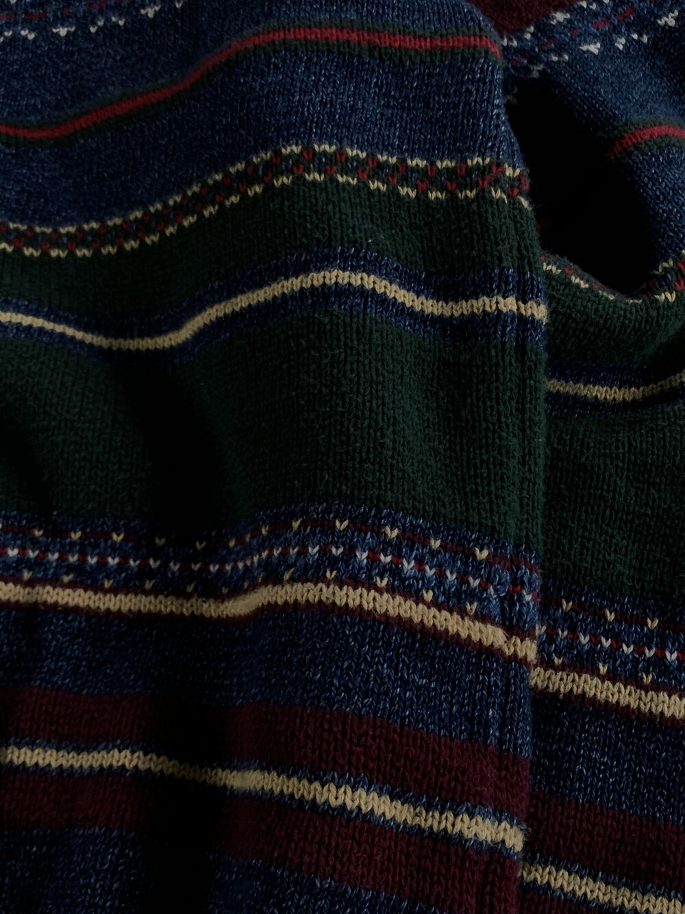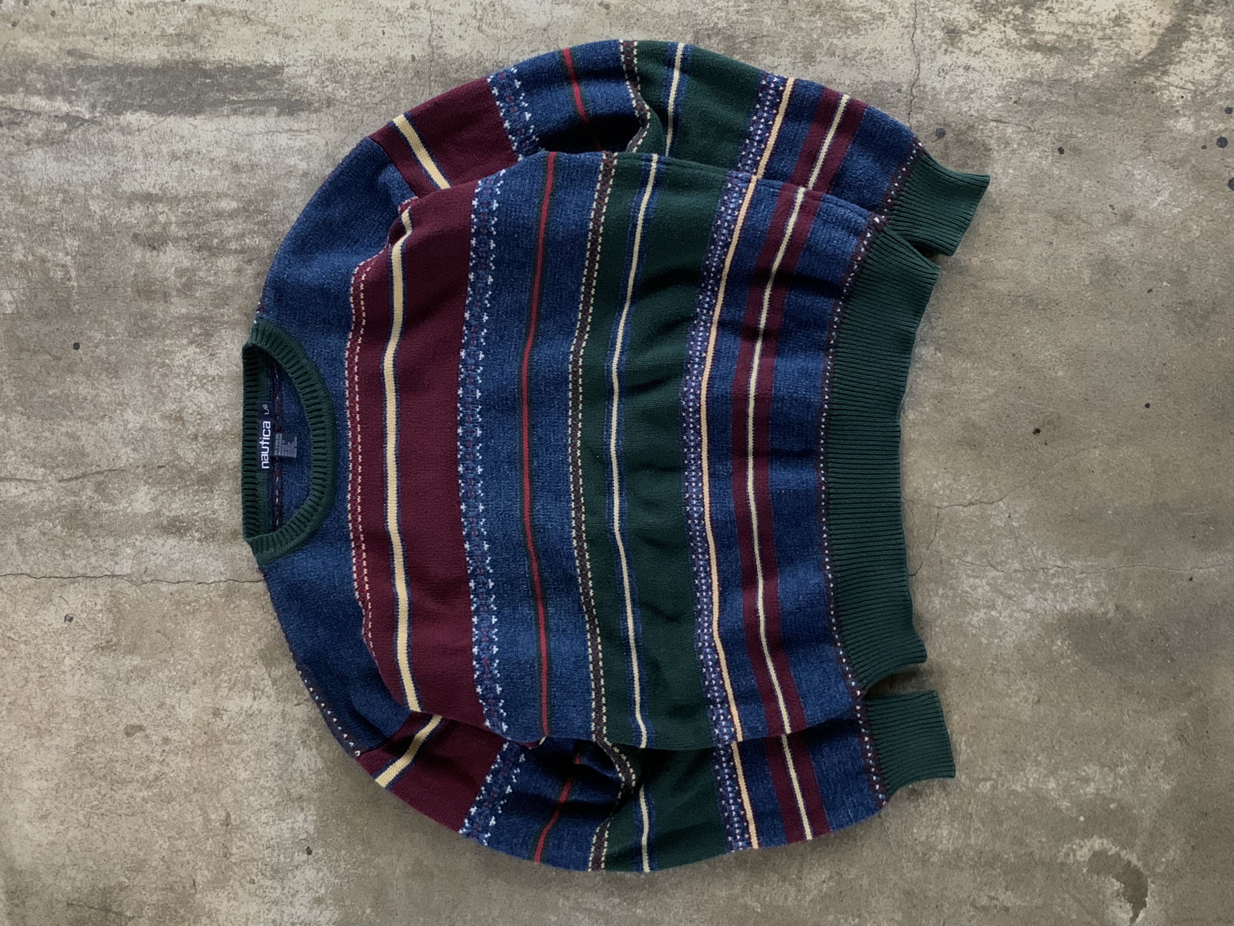 1990년대 생산된 노티카의 코튼 니트 스웨터. 두께가 다른 스트라이프 패턴에 중간중간 버드아이 패턴이 수놓아져 캐주얼하게 즐길 수 있을만한 제품입니다. 코튼 니트 특유의 단단한 프레임을 유지하면서 나머지는 축 처지는듯한 착용감이 돋보이는 제품으로, 스웻후디나 롤넥 티셔츠 등과 함께 매치해도 좋을만한 제품입니다.
