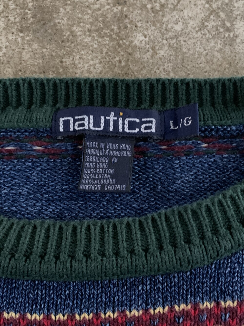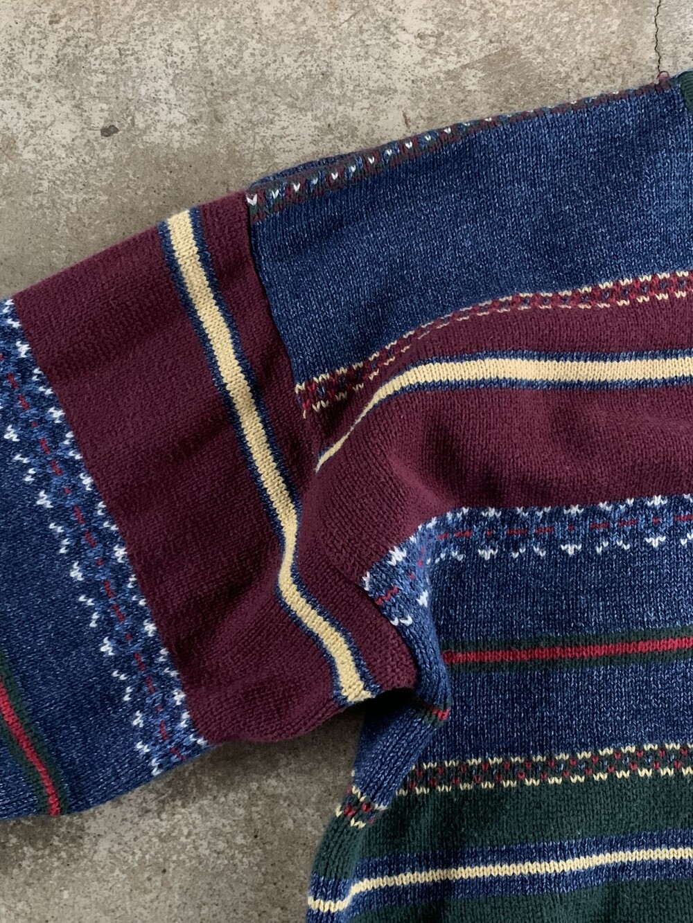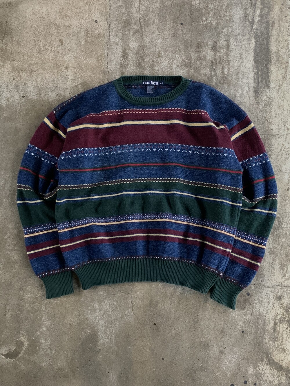 1990년대 생산된 노티카의 코튼 니트 스웨터. 두께가 다른 스트라이프 패턴에 중간중간 버드아이 패턴이 수놓아져 캐주얼하게 즐길 수 있을만한 제품입니다. 코튼 니트 특유의 단단한 프레임을 유지하면서 나머지는 축 처지는듯한 착용감이 돋보이는 제품으로, 스웻후디나 롤넥 티셔츠 등과 함께 매치해도 좋을만한 제품입니다.