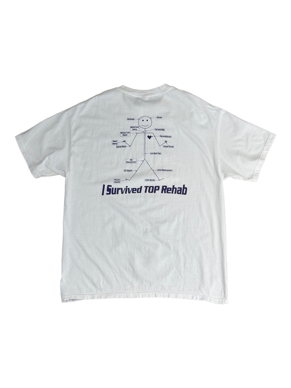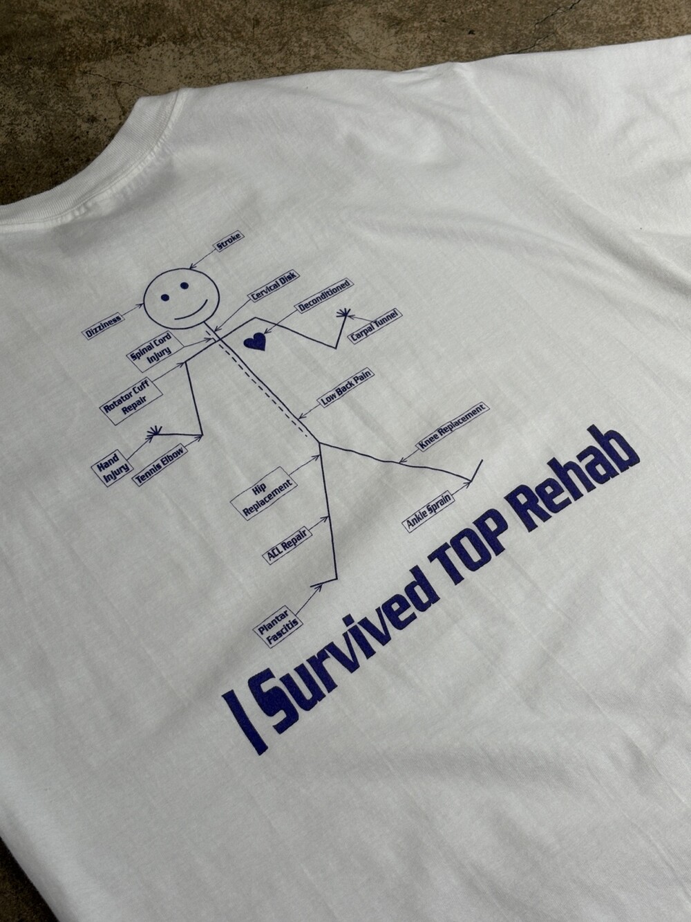 테네시 주에 위치한 재활 센터 TOP REHAB SERVICE 프로모션 티셔츠. 머리부터 발끝까지 재화센터에서 책임질 수 있을만한 부상을 나열한 프린팅이 돋보이는 제품입니다.