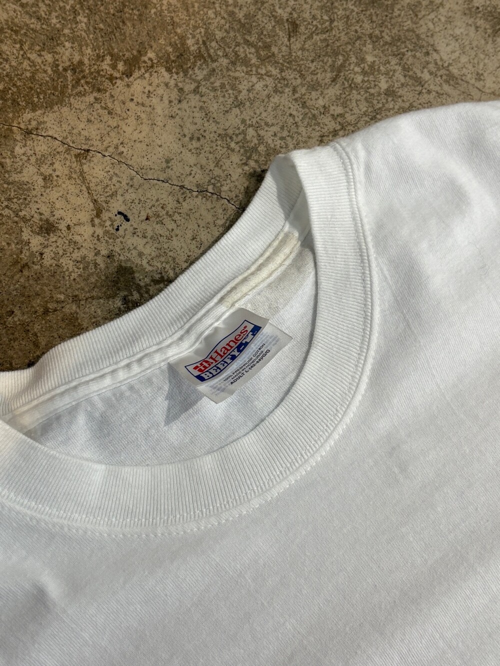 전면 프린팅 위쪽에 얼룩이 있으며 전반적으로 티셔츠 원단이 긁혀 다림질을 해도 접힌듯한 흔적이 잘 사라지지 않는, 사용감 있는 제품.
