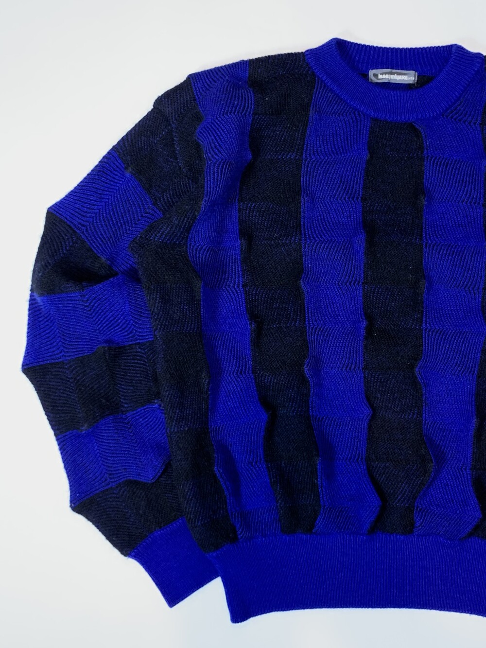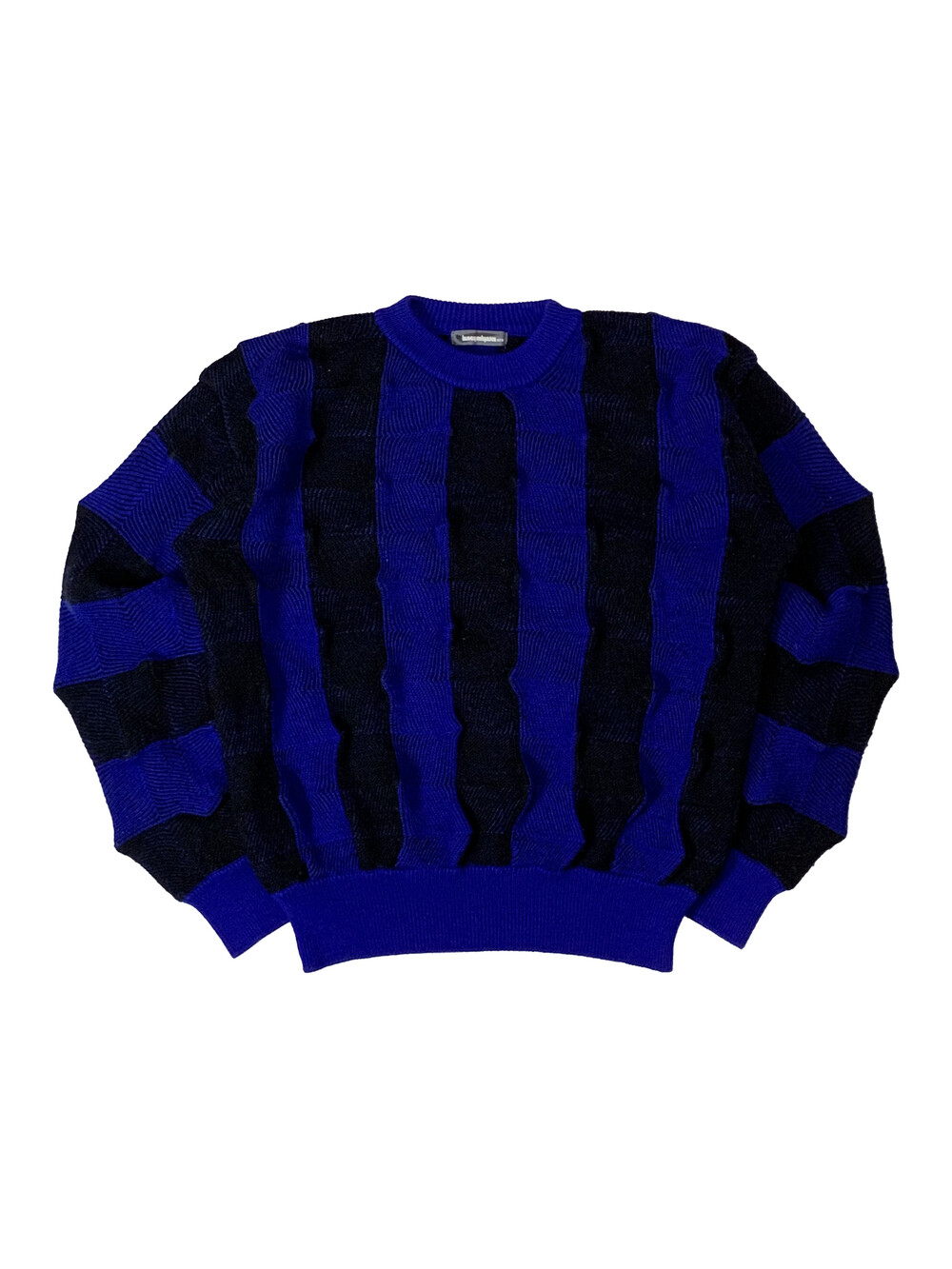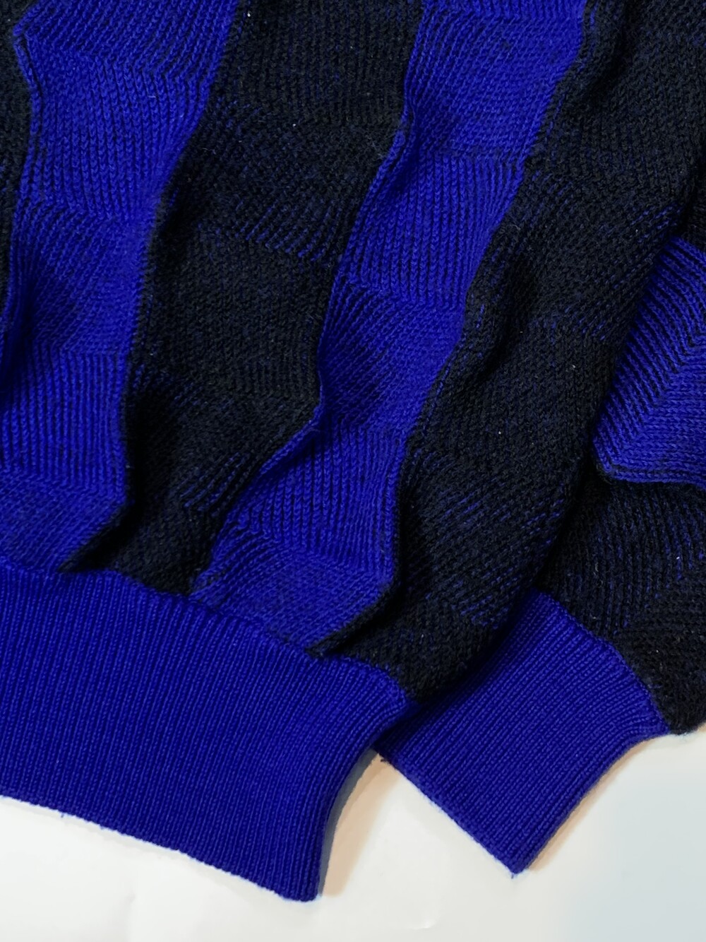1988 AW 시즌에 발매한 입체적인 형태의 니트 스웨터. 각 블록별로 짜임 방향이 달라, 4방향 블록이 한 데 모여 바깥쪽으로 솟아오르는 입체적인 니팅과 블랙&블루 투톤 스트라이프 돋보이는 제품입니다. 표기 대비 여유로운 사이즈로 105호 전후로 추천드립니다!