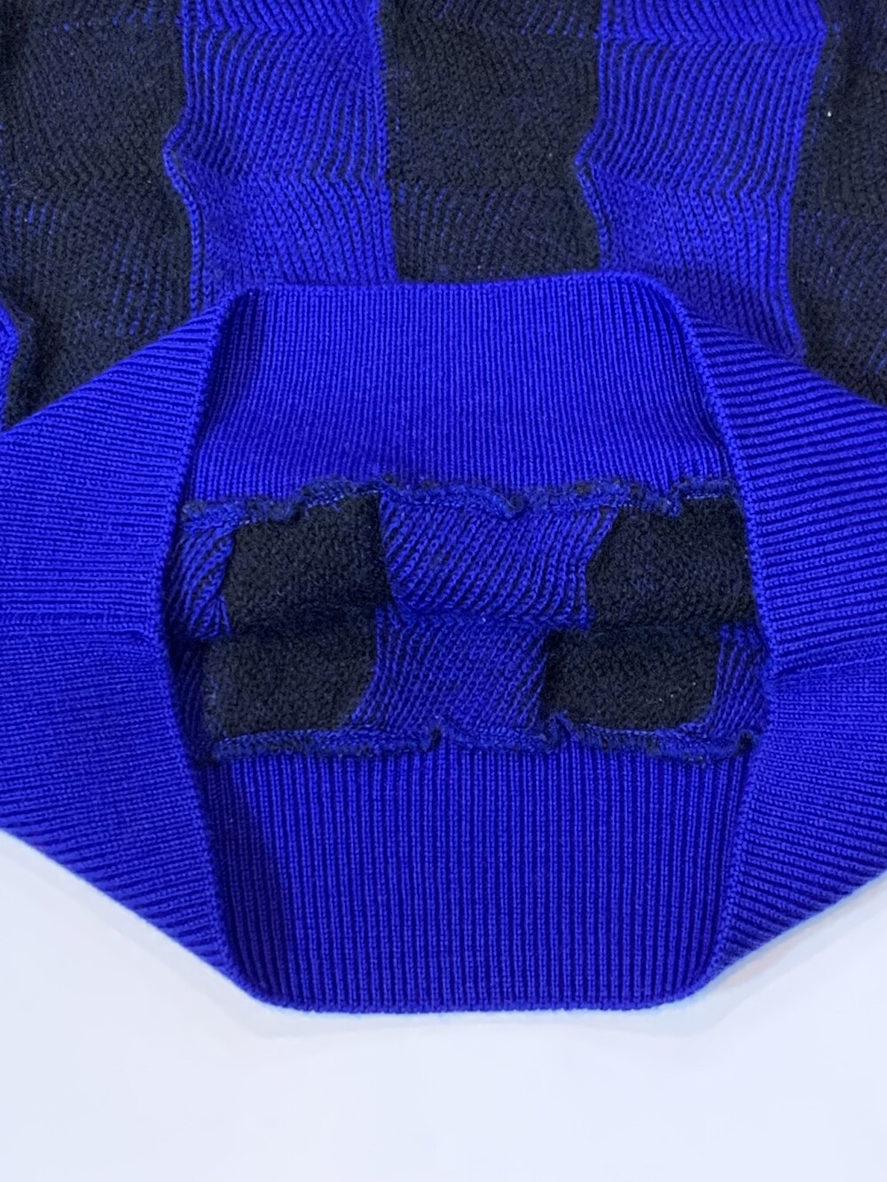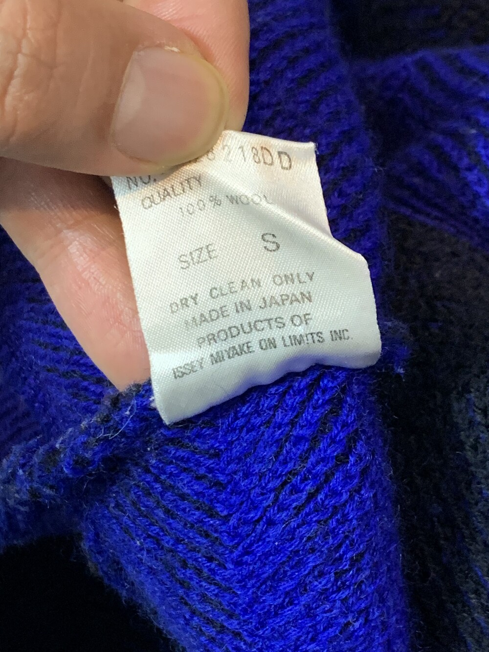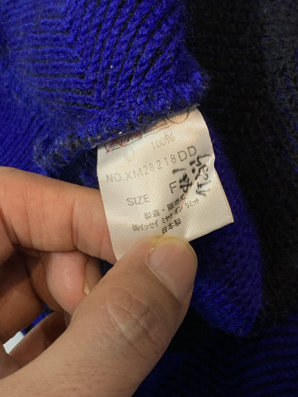 1988 AW 시즌에 발매한 입체적인 형태의 니트 스웨터. 각 블록별로 짜임 방향이 달라, 4방향 블록이 한 데 모여 바깥쪽으로 솟아오르는 입체적인 니팅과 블랙&블루 투톤 스트라이프 돋보이는 제품입니다. 표기 대비 여유로운 사이즈로 105호 전후로 추천드립니다!
