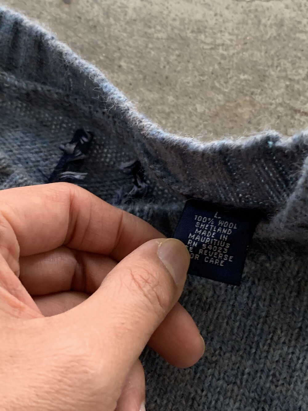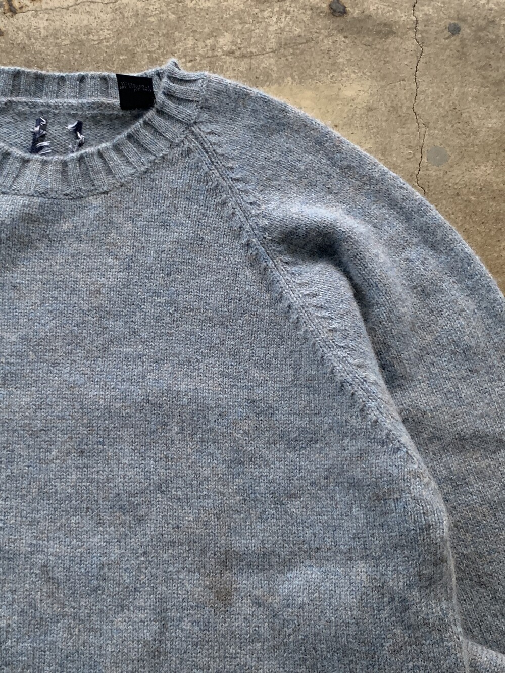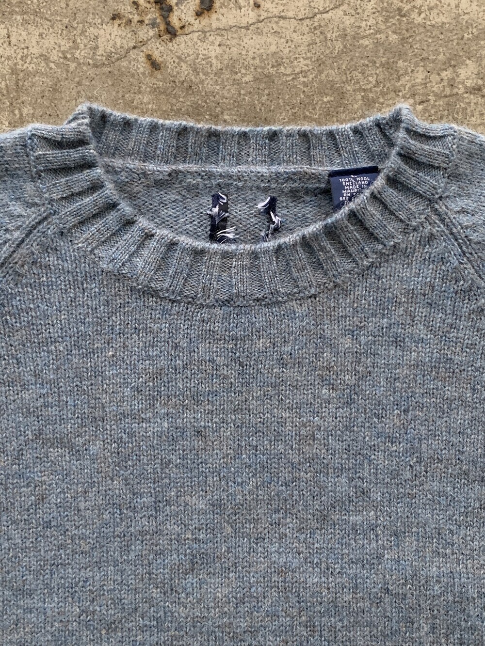 옅은 스카이블루 컬러 바탕에 그레이,브라운 컬러 실이 섞인듯한 살짝 거친 촉감에 짧게 헤어리하게 올라오는 셔틀랜드 울 특유의 오묘한 색감을 보이는 올드 갭 스웨터. 모리셔스(MAURITIUS)는 영 연방 일원으로, 같은 영 연방 스코틀랜드에서 셔틀랜드 울을 공급받아 모리셔스에서 생산된 제품으로 추정됩니다. 심플한 크루넥 디자인으로 러프하게 티셔츠를 받쳐입어 레이어드 연출하면 좋을만한 제품입니다.