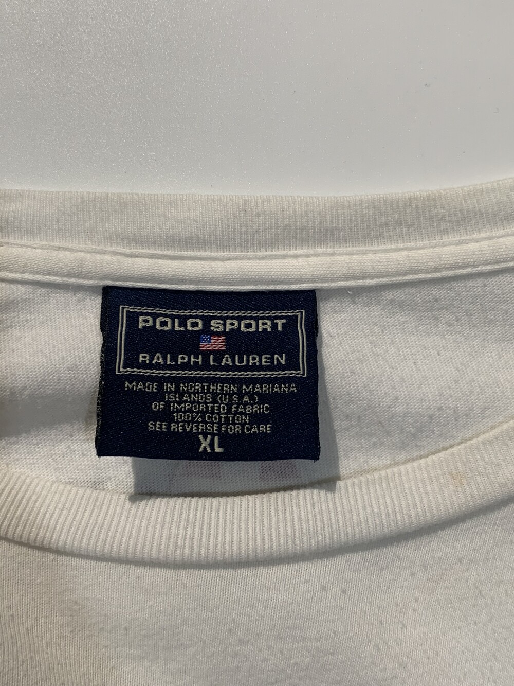 전면 넥라인 립 부분과 그 아래에 미세하게 붉은 얼룩이 있는, 사용감 있는 제품.