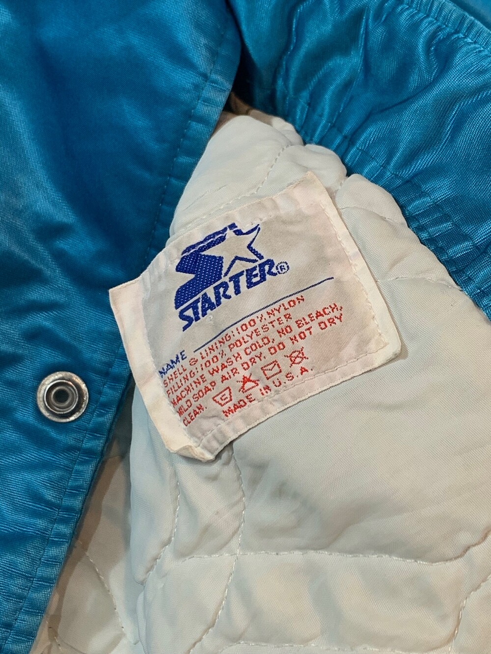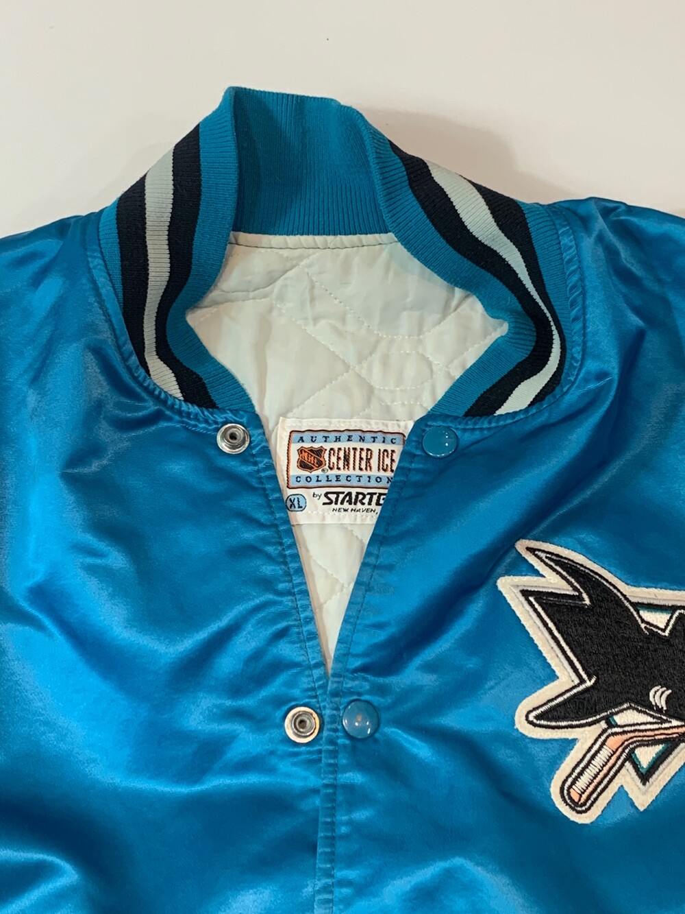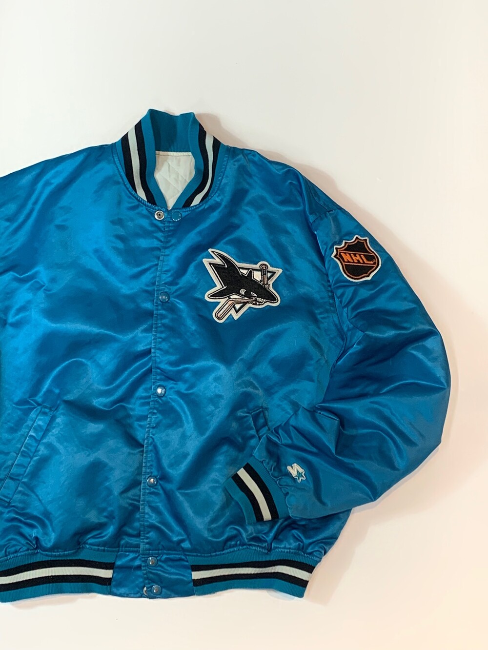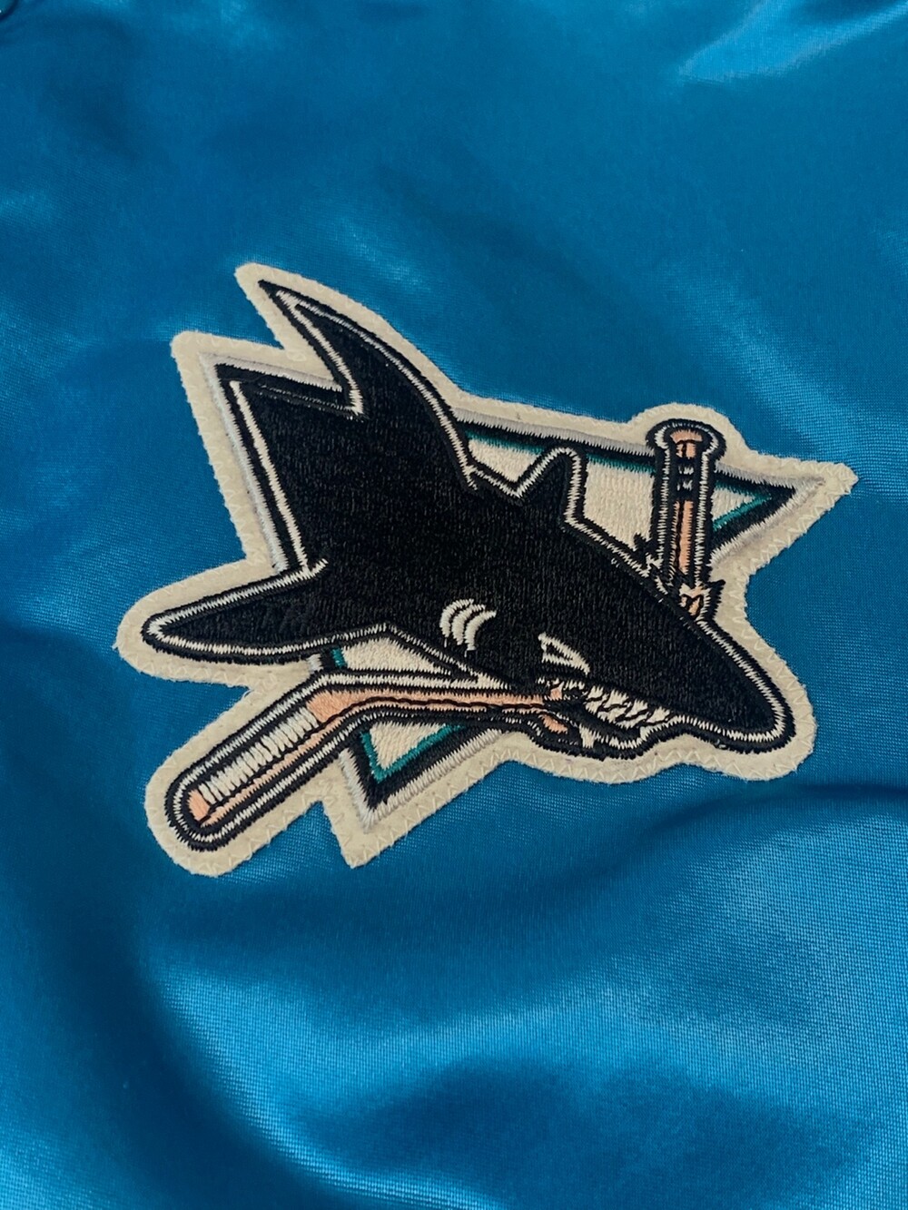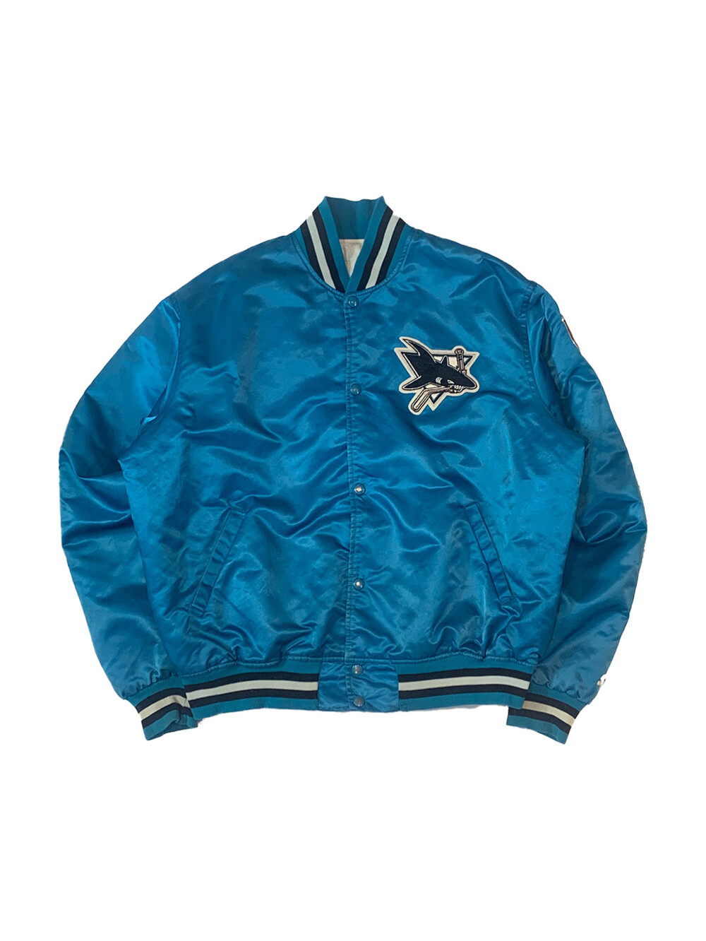 NHL 서부 컨퍼런스 소속 산 호세 샤크스(San Jose Sharks) 의 팀 컬러 바디에 리그와 구단 로고 패치가 붙은 스타터의 팀 자켓입니다. 미국의 4대리그 중에서도 1980년도 후반에서 1990년도 초반에 창단한 구단인 샬럿 호네츠, 마이애미 말린스, 캐롤라이나 팬서스, 그리고 산 호세 샤크스 이렇게 네 신생 팀은 기존 팀과는 겹치지 않는 컬러를 선정하고자 그간 잘 쓰이지 않던 밝은 틸 컬러를 채택했습니다. 컬러의 희소성 때문인지 짧은 역사에 비해 높은 매물가격을 자랑하는 팀 자켓이기도 합니다.
