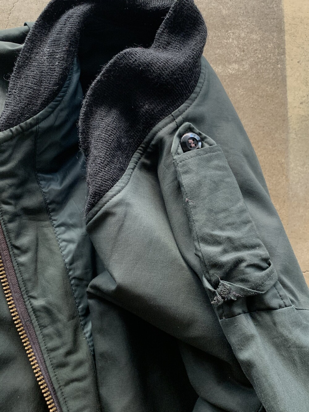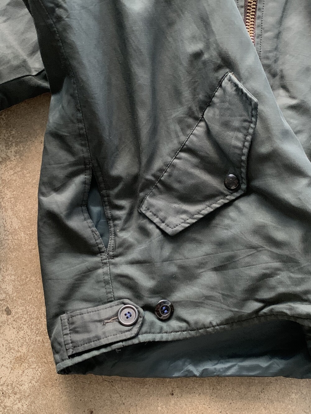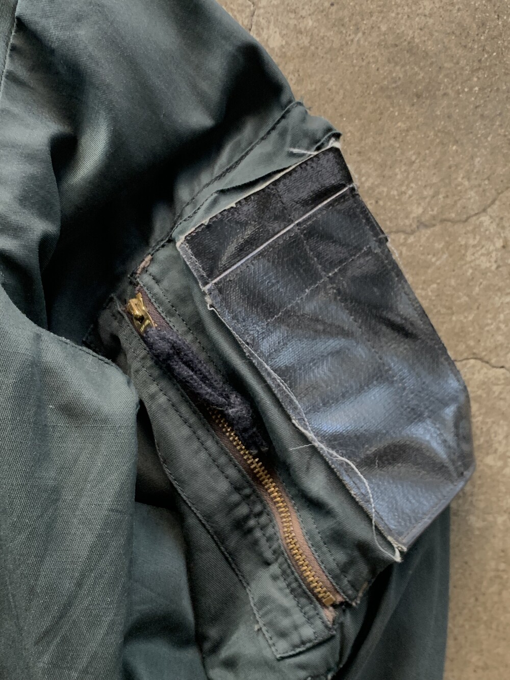 🚩Detail Type Ⅲ 초기형과 유사한 형태를 보이나 조종사가 조난 시 자신의 위치를 알리기 위해 사용하는 비상용 섬광등을 고정하는 데 쓰이는 웨빙 스트랩이 붙은, 심지어 코튼 캔버스 원단이 아닌 가죽 패치가 붙은 초기형 Type II 사양의 왕립 캐나다 공군 플라이트 자켓입니다. 그 외에도 소매 부분 포켓이 대칭형이 아니며 하단부 버튼으로 고정하는 플랩 타입의 어드저스터와 플라이트 팬츠와 결합하는 슬릿 디테일이 배치된 차이점도 눈에 띄는 부분입니다.
