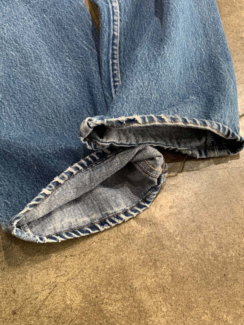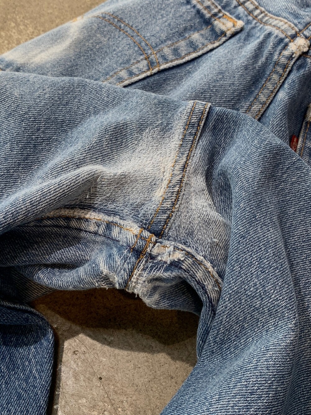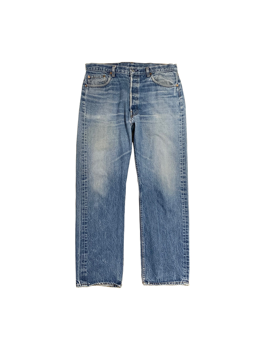 🚩Detail 클래식한 슬림 스트레이트 실루엣이 돋보이는 리바이스 501 데님팬츠입니다. 1985년부터 1988년까지 비슷한 사양으로 생산되던 시기의 제품으로, 해당 시기의 제품들에서는 힘을 받지 않는 부분이 자잘하게 깨지는듯한 페이딩 양상을 보입니다. 힘을 받는 주요 부위는 잦은 착용으로 페이딩이 진행되었으며, 닳아 헤진 부분은 심지를 안쪽에 덧대 수선을 완료했습니다.