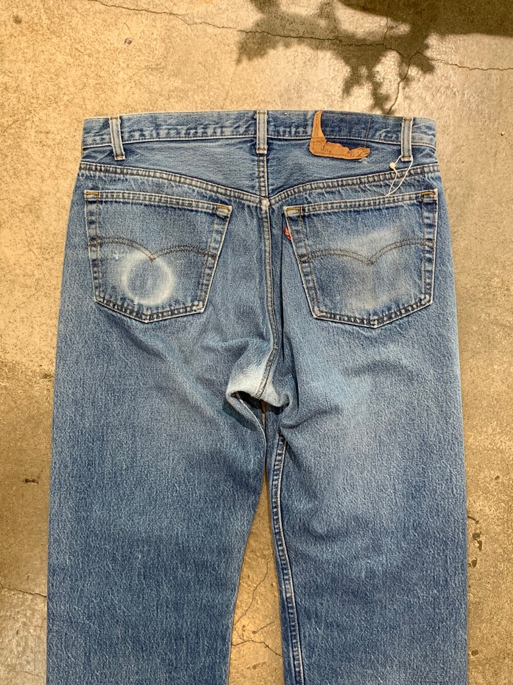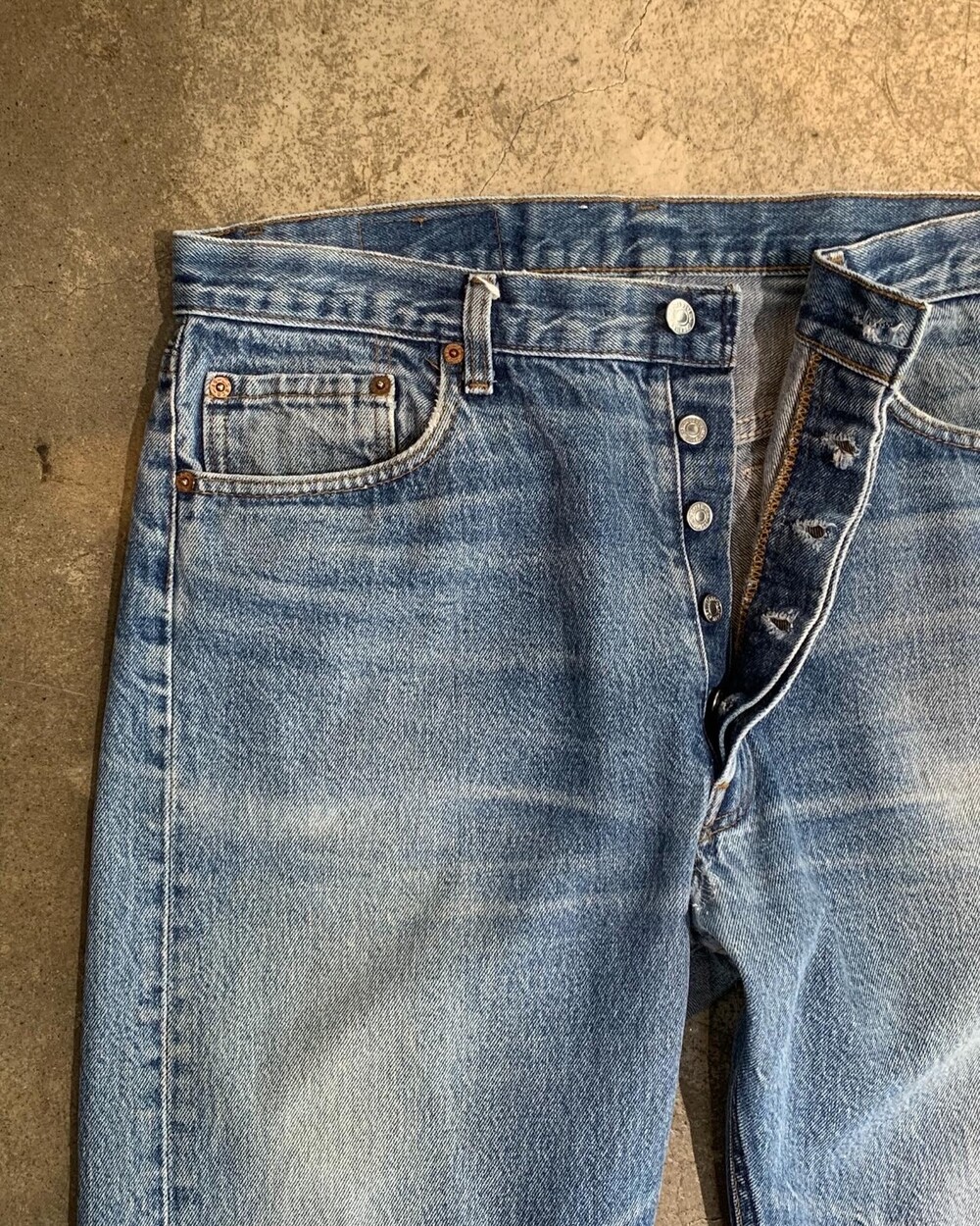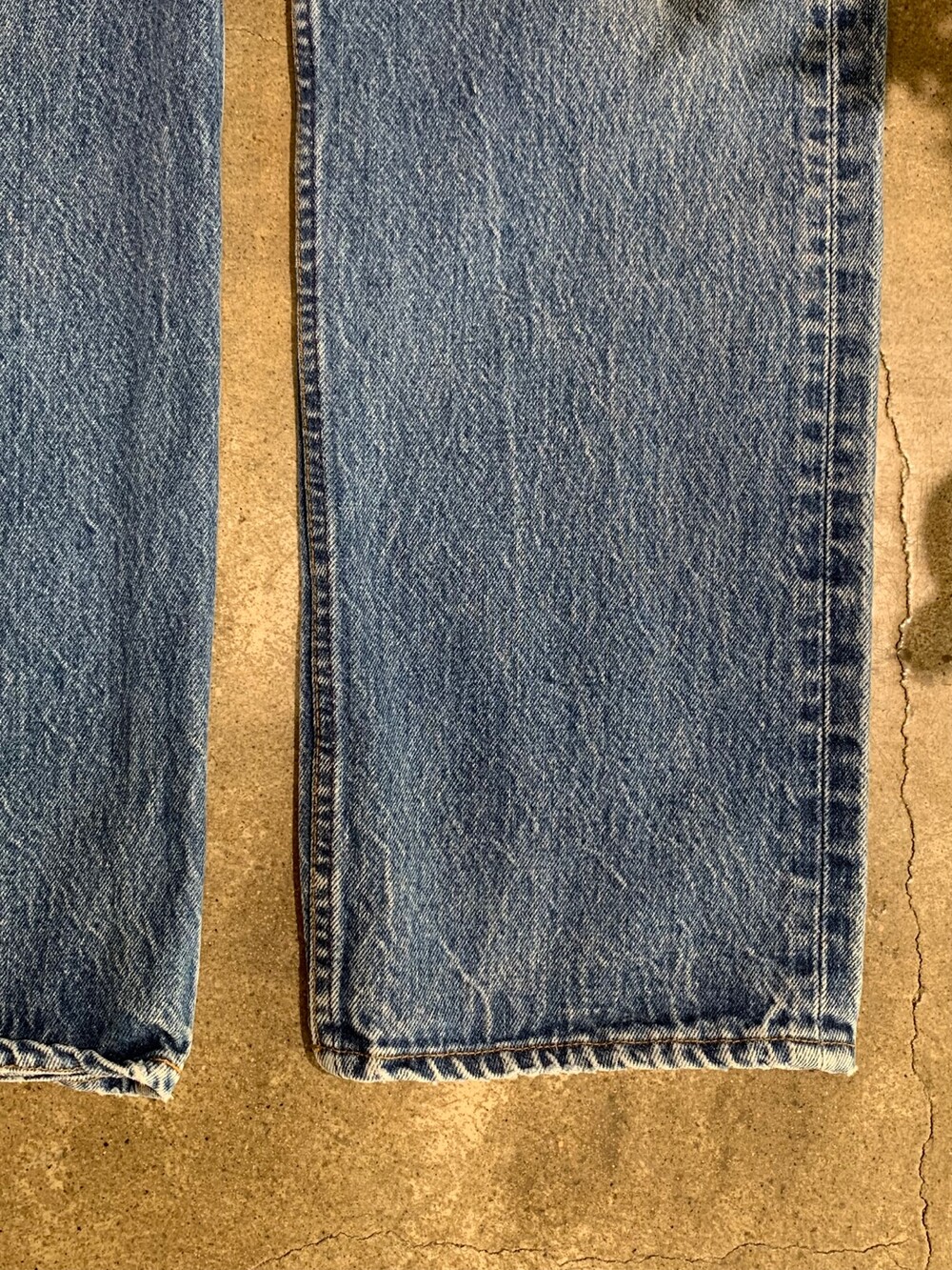 🚩Detail 클래식한 슬림 스트레이트 실루엣이 돋보이는 리바이스 501 데님팬츠입니다. 1985년부터 1988년까지 비슷한 사양으로 생산되던 시기의 제품으로, 해당 시기의 제품들에서는 힘을 받지 않는 부분이 자잘하게 깨지는듯한 페이딩 양상을 보입니다. 힘을 받는 주요 부위는 잦은 착용으로 페이딩이 진행되었으며, 닳아 헤진 부분은 심지를 안쪽에 덧대 수선을 완료했습니다.