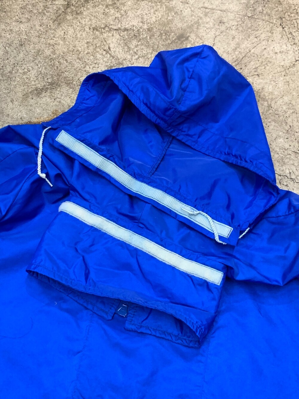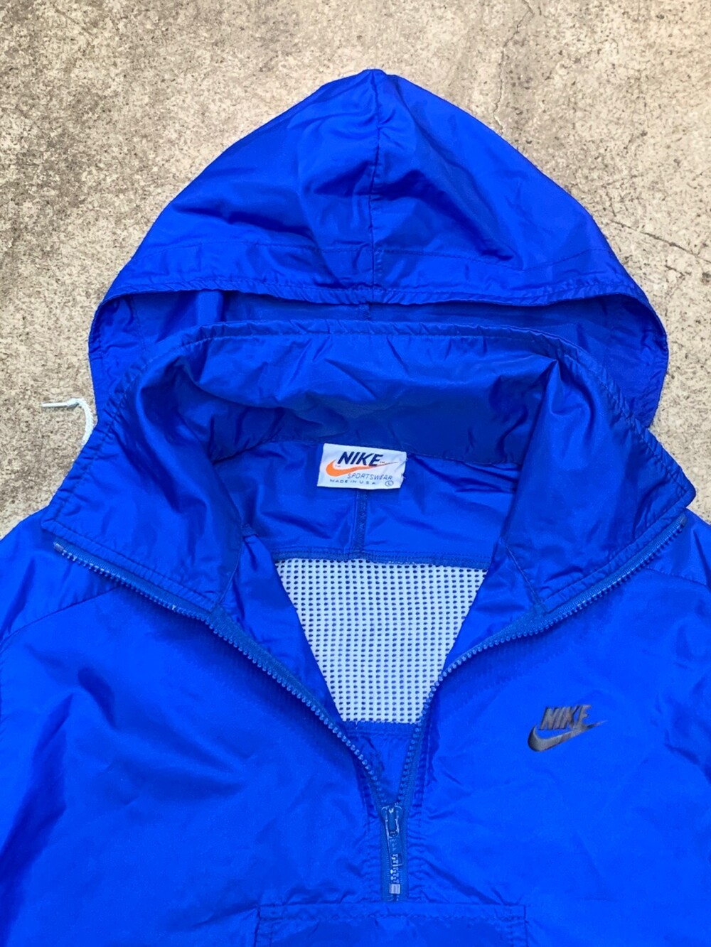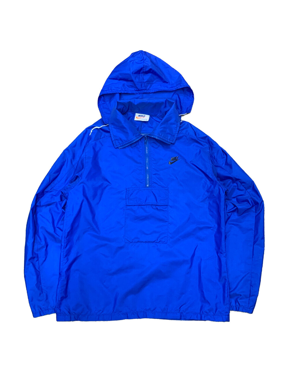 🚩Details 전면 쿼터집과 벨크로로 열고 닫는 포켓, 그리고 후면 통풍용 패널이 적용된 고전적인 형태의 나이키 나일론 풀오버. 전면은 나이키 로고, 후면은 캔자스(KANSAS) 프린팅이 올려져있어 중고등학교 혹은 대학교 바시티 팀에 지급되었던 풀오버타입 윈드브레이커로 추정됩니다. 밑단은 별도의 스토퍼가 없으나 폭이 좁으며, 후드 스트링, 전면 지퍼, 소매 벨크로 등 방풍용 디테일을 갖추고 있어 현 시점에도 충분히 윈드브레이커로 활용할 수 있을만한 제품입니다.