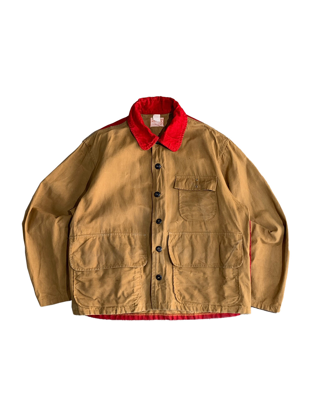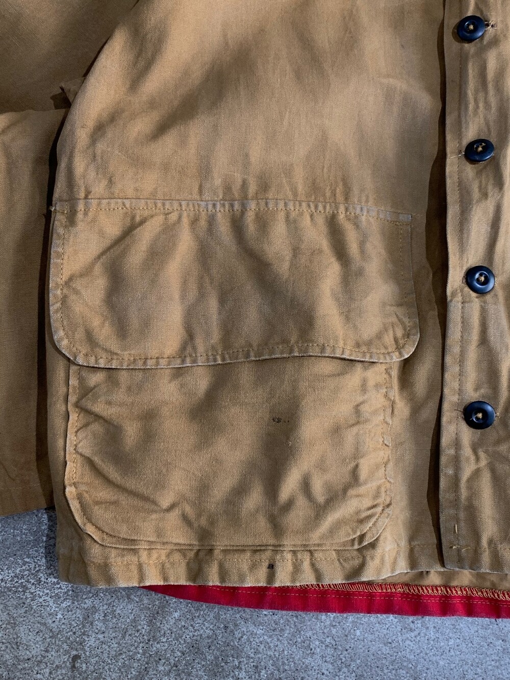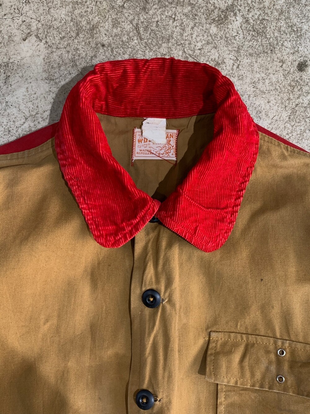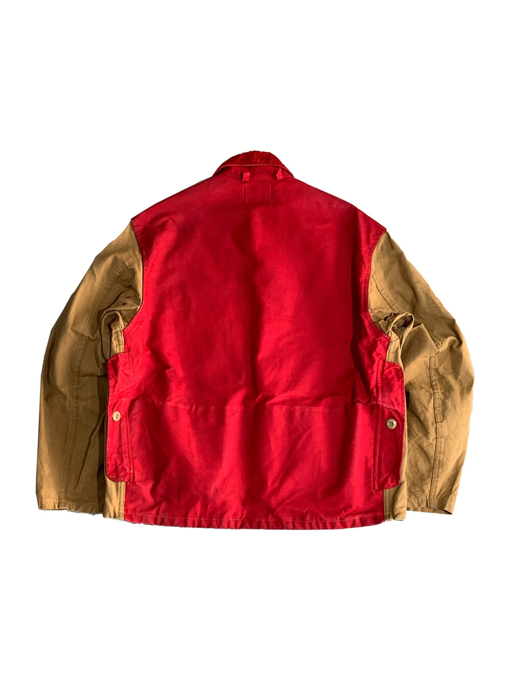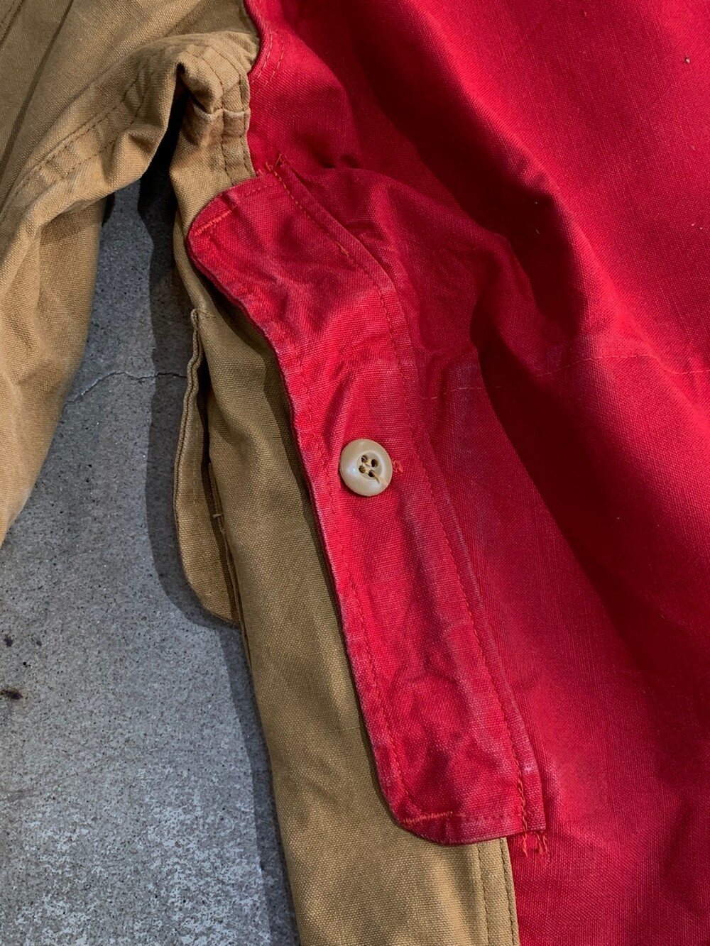 두껍지 않은 덕캔버스 원단, 그리고 헌팅자켓치고는 비교적 짧은 기장감을 보이는 투톤 사양의 헌팅 자켓입니다. 전면은 브라운 뒷면 몸판과 칼라는 레드 컬러의 클래식한 배색으로 빨간색 부분이 영 부담스럽다면 패치나 자수를 놓아 커스텀해도 좋을만한 제품입니다.