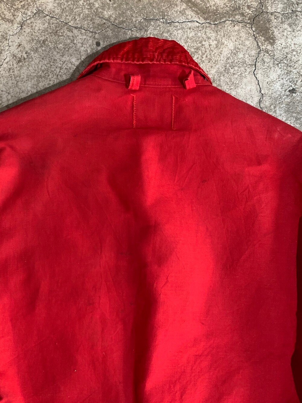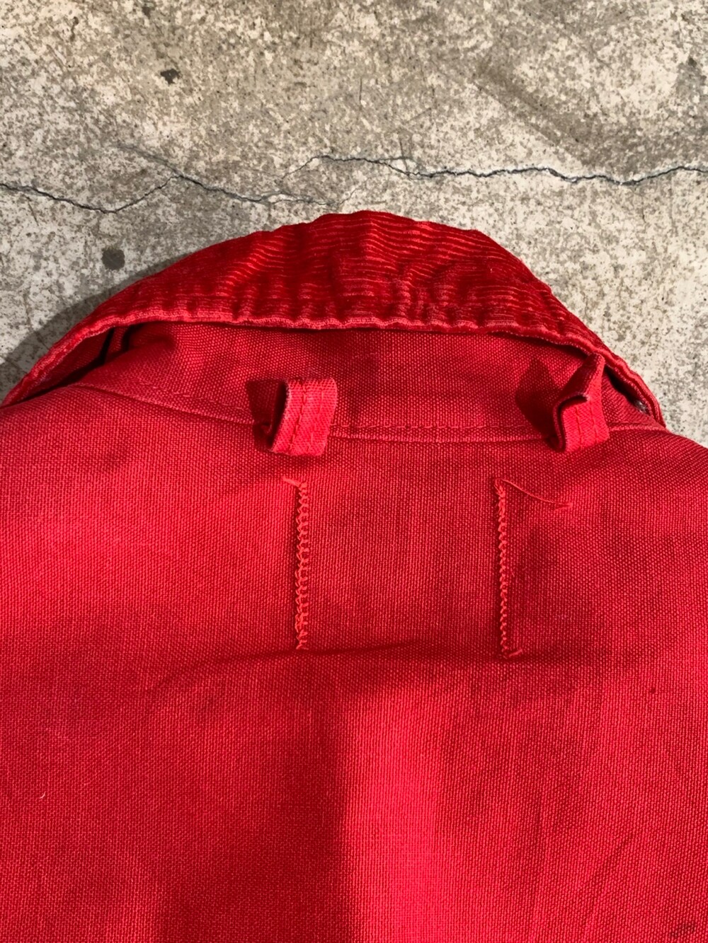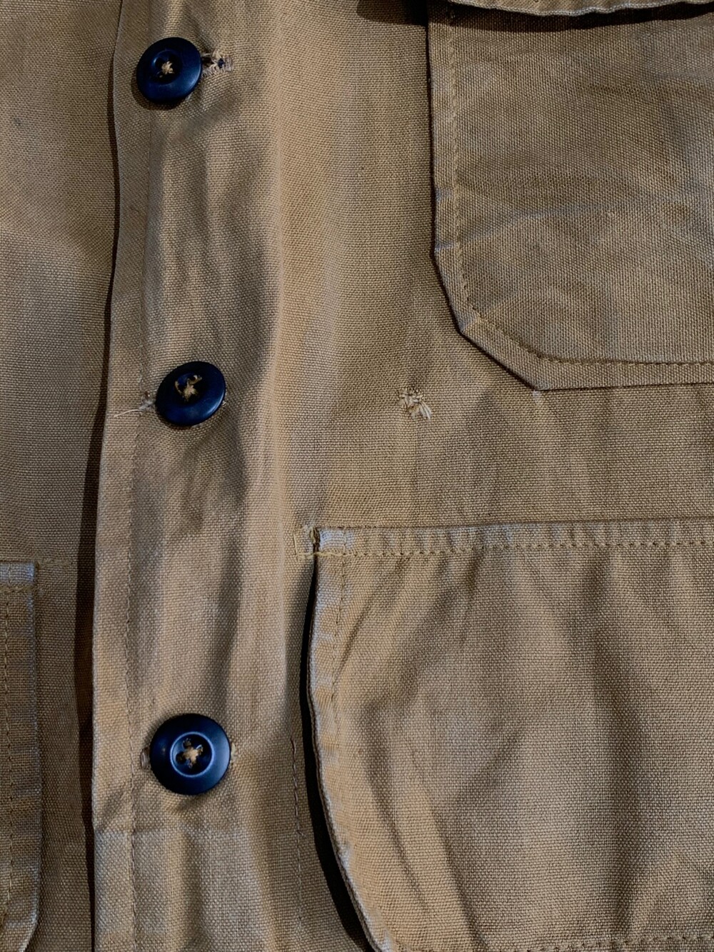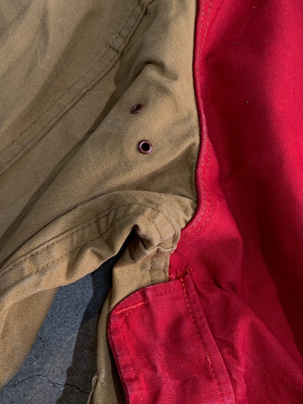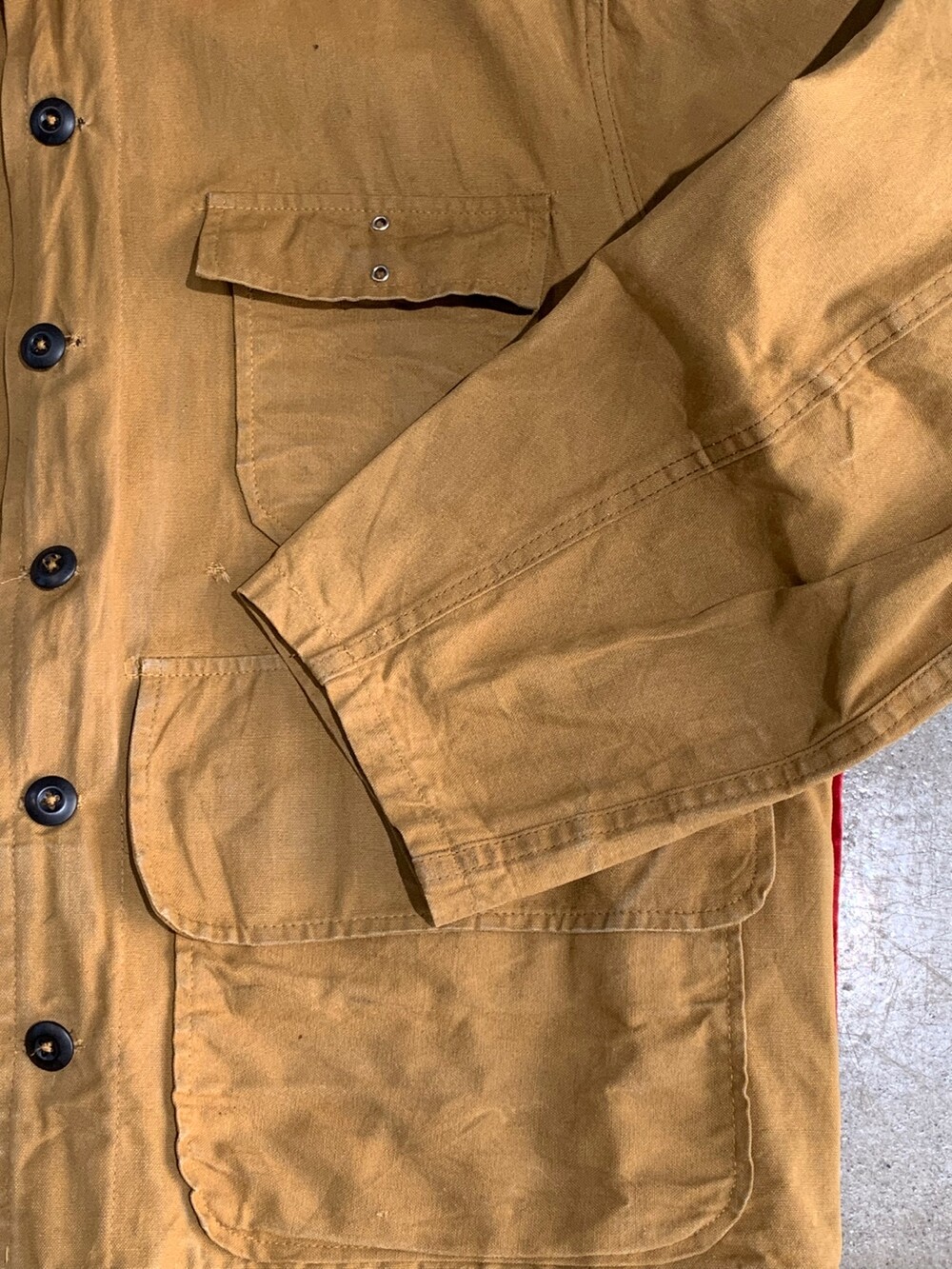 두껍지 않은 덕캔버스 원단, 그리고 헌팅자켓치고는 비교적 짧은 기장감을 보이는 투톤 사양의 헌팅 자켓입니다. 전면은 브라운 뒷면 몸판과 칼라는 레드 컬러의 클래식한 배색으로 빨간색 부분이 영 부담스럽다면 패치나 자수를 놓아 커스텀해도 좋을만한 제품입니다.