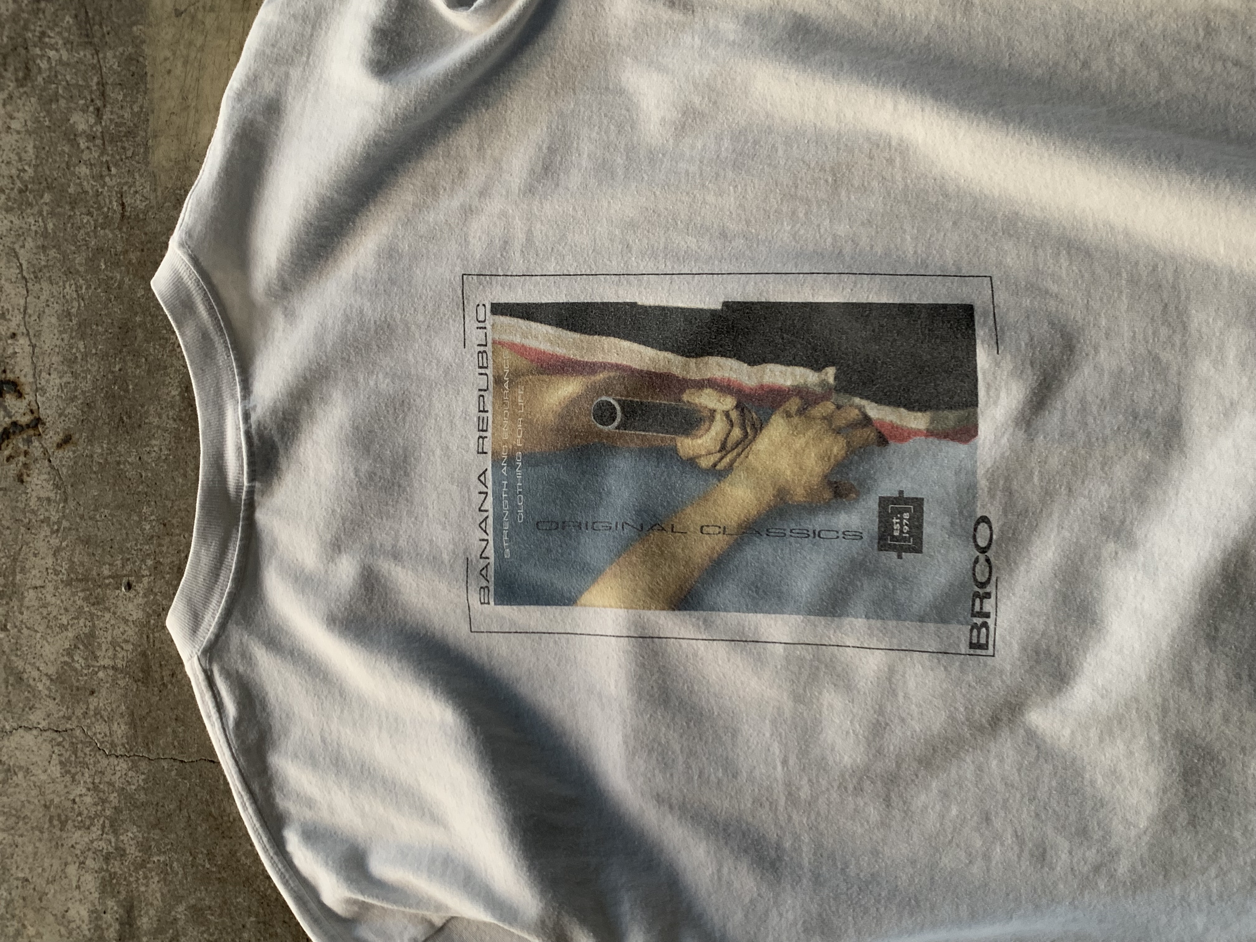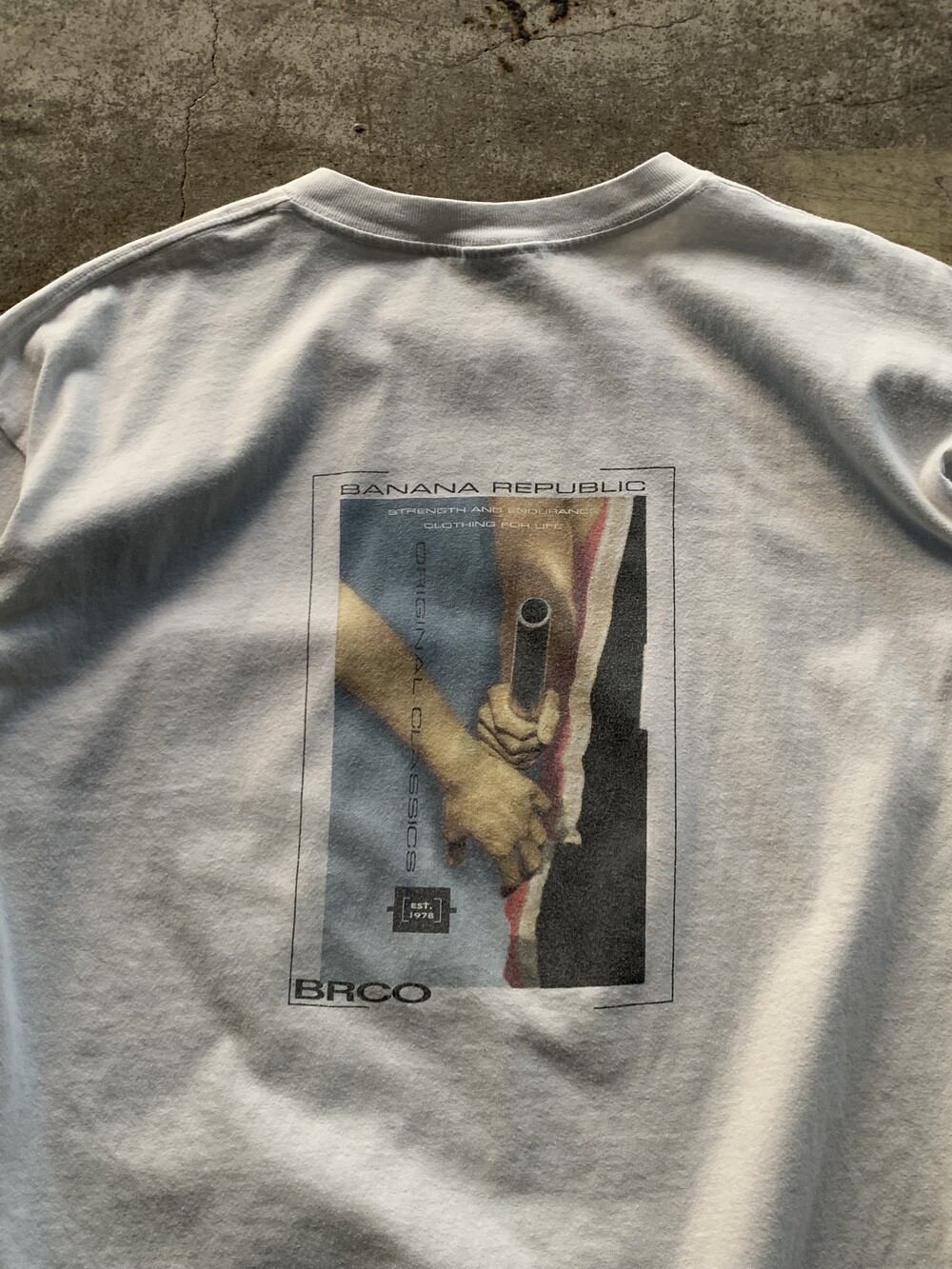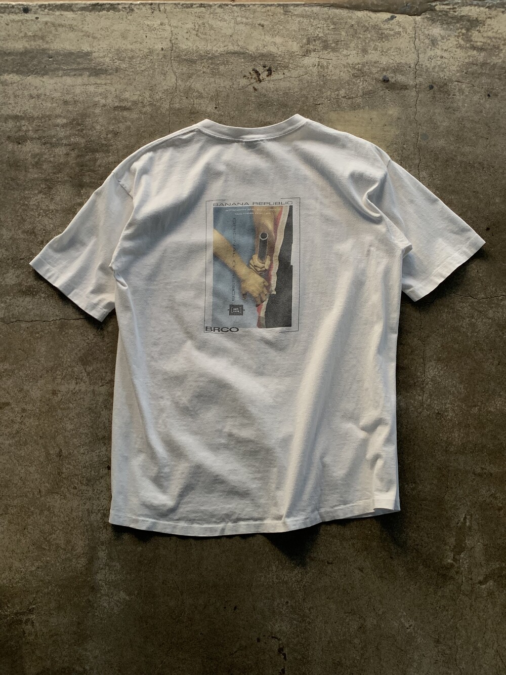 🚩Detail 1980년대 당시 유행하던 사파리웨어를 중심으로 아메리칸 캐주얼 장르의 클래식웨어를 곁들여 소개하던 바나나 리퍼블릭은 1990년대 들어 사파리 워드롭 컨셉을 지우고 모던 클래식웨어로 브랜드 리뉴얼을 시도합니다. 그 과정의 산물이라 할 수 있는 Original Classcis 라인 티셔츠는 기존 동물이나 와일드라이프 등의 동물 프린팅 대신 아틀라스 맵이나 낚시용 루어와 같은 이전에 비해 간접적인 이미지나 조금은 뜬금없다 느껴질만한 구기종목이나 스포츠 관련 프린팅을 배치하기도 합니다.