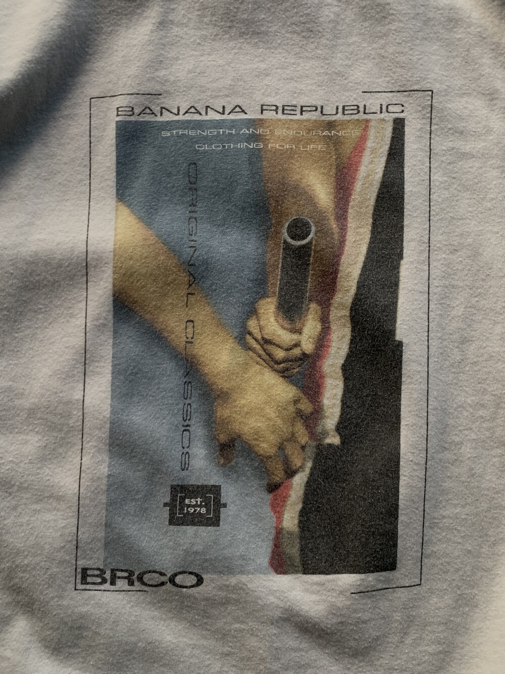 후자에 속하는, 배턴을 넘겨받는 프린팅이 뒷면에 배치되어 올드 바나나 리퍼블릭 프린팅 티셔츠에서 기대할만한 이미지와는 결이 다른 포켓 티셔츠입니다. 모던하면서도 오래 입을 수 있을만한 클래식한 옷을 선보이겠다 하는 브랜드 나름의 각오가 돋보입니다. 표기 L로 100호보다 조금 더 크게 입는 분들에게 권장드립니다.