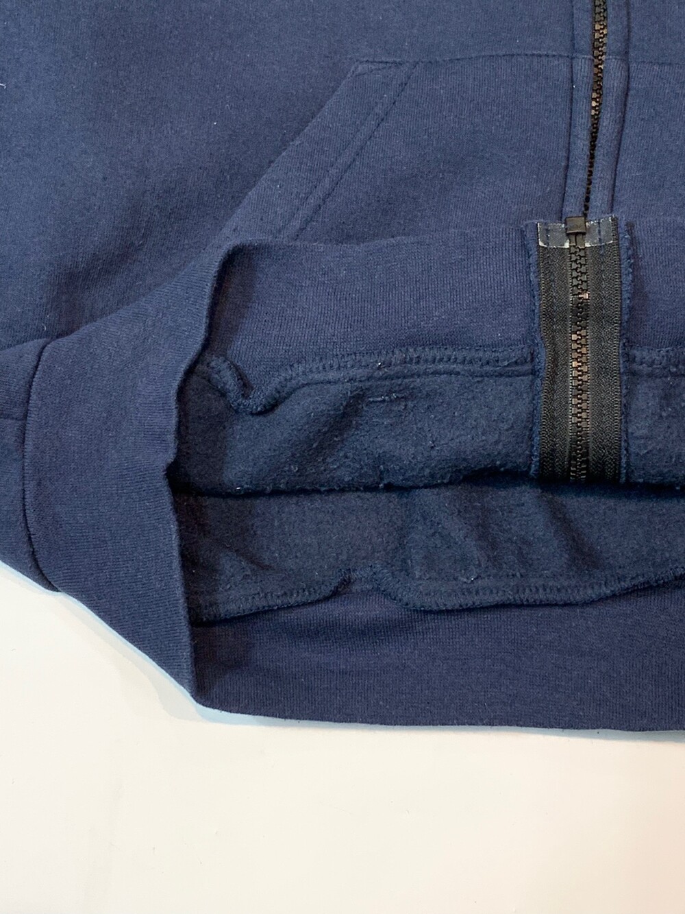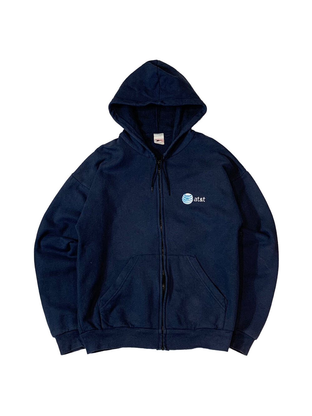 코튼 함량이 높은 다소 얇은 두께감과 단단한 질감의 원단, 투박한 끈과 지퍼 때문에 스웻파카로 표현하는 게 어울릴법한 유니온 라인(Union Line)의 스웻후디입니다. 전면에는 미국의 대표적인 통신사 AT&T 자수 로고가 올려져 있습니다.
