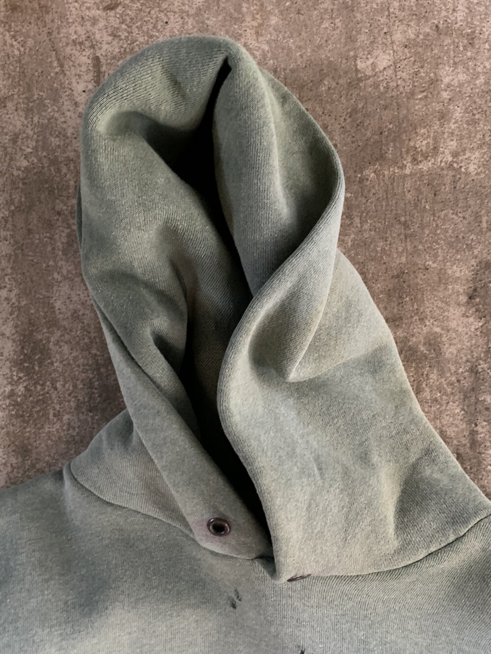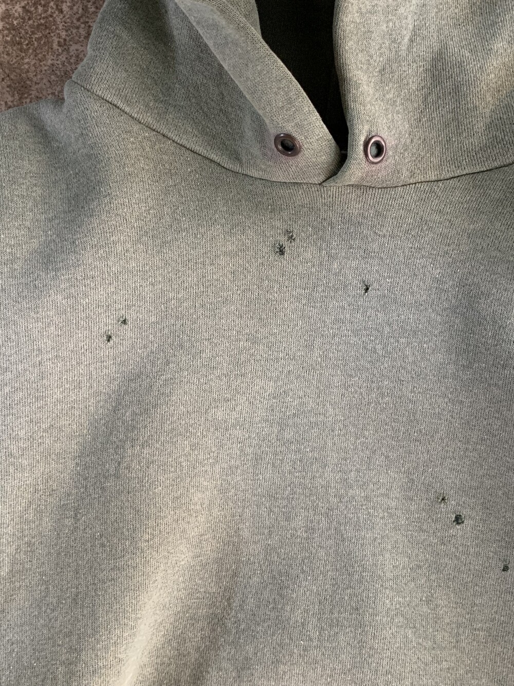 부족하지 않을 정도의 이너플리스 두께로 벌키한 실루엣을 연출하기 좋으며 특히나 선페이드를 거쳐 얼룩덜룩한 색감과 전면에 부분적으로 발생한 핀홀이 잘 어울리는 제품입니다.