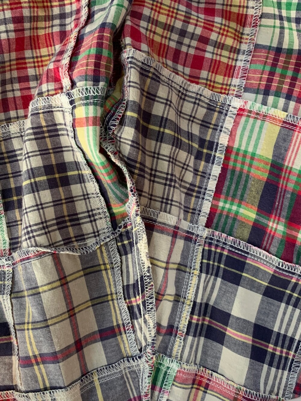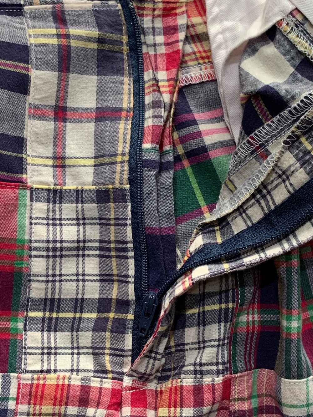 🚩Detail 가벼운 터치감을 자랑하는 평직 원단에 밝은 계열 컬러 배색의 플래드 체크 패턴이 돋보이는 인도산 마드라스 체크 패턴 원단 여러개가 패치워크를 이루는 폴로 랄프로렌의 쇼츠. 바지 안쪽을 보면 여러개의 패치워크로 구성된 원단이 착용 시 몸에 쓸리지 않도록 속옷에 적용되는 플랫심 봉제가 곳곳에 적용되어 있는것을 확인할 수 있습니다.