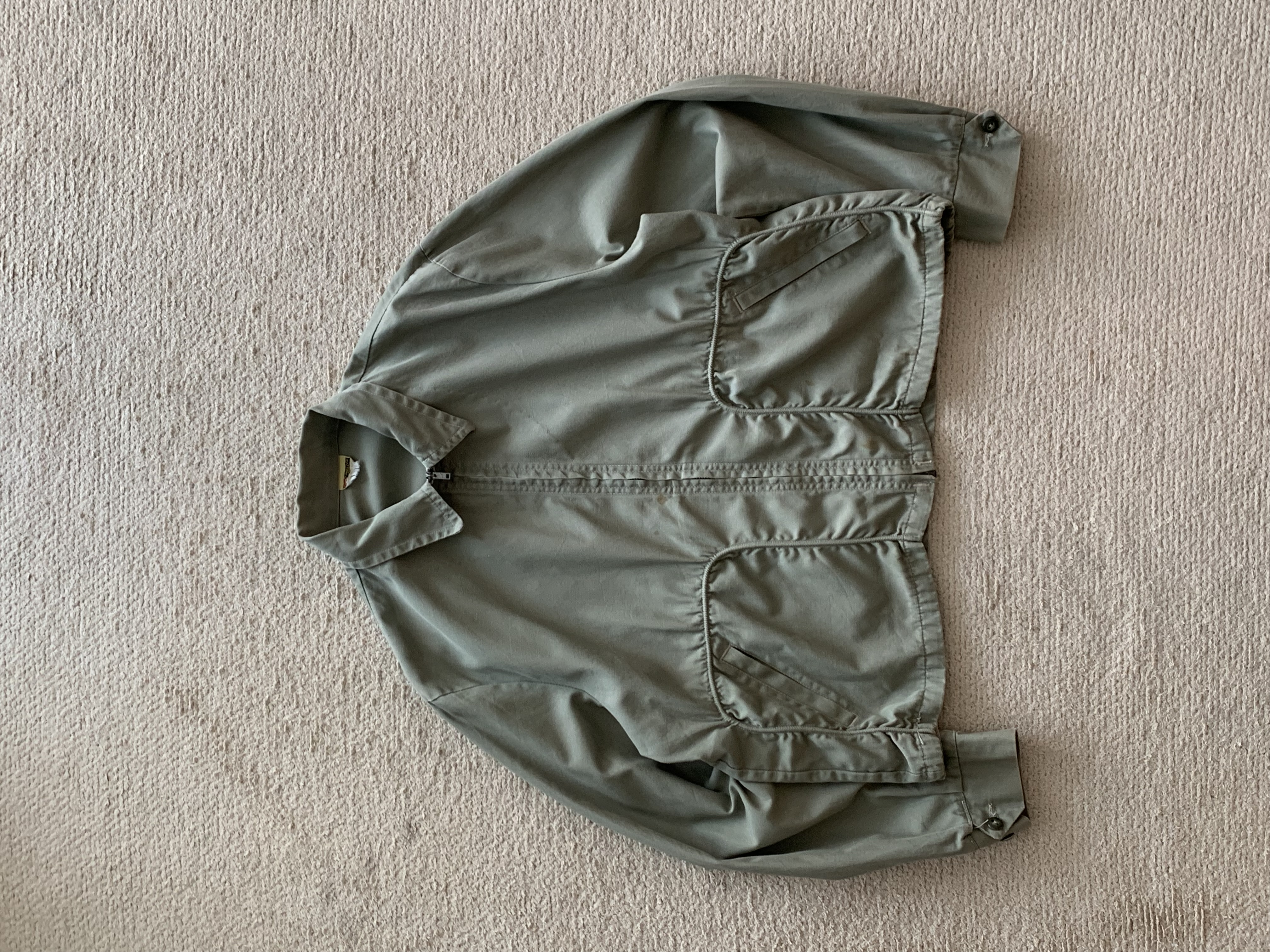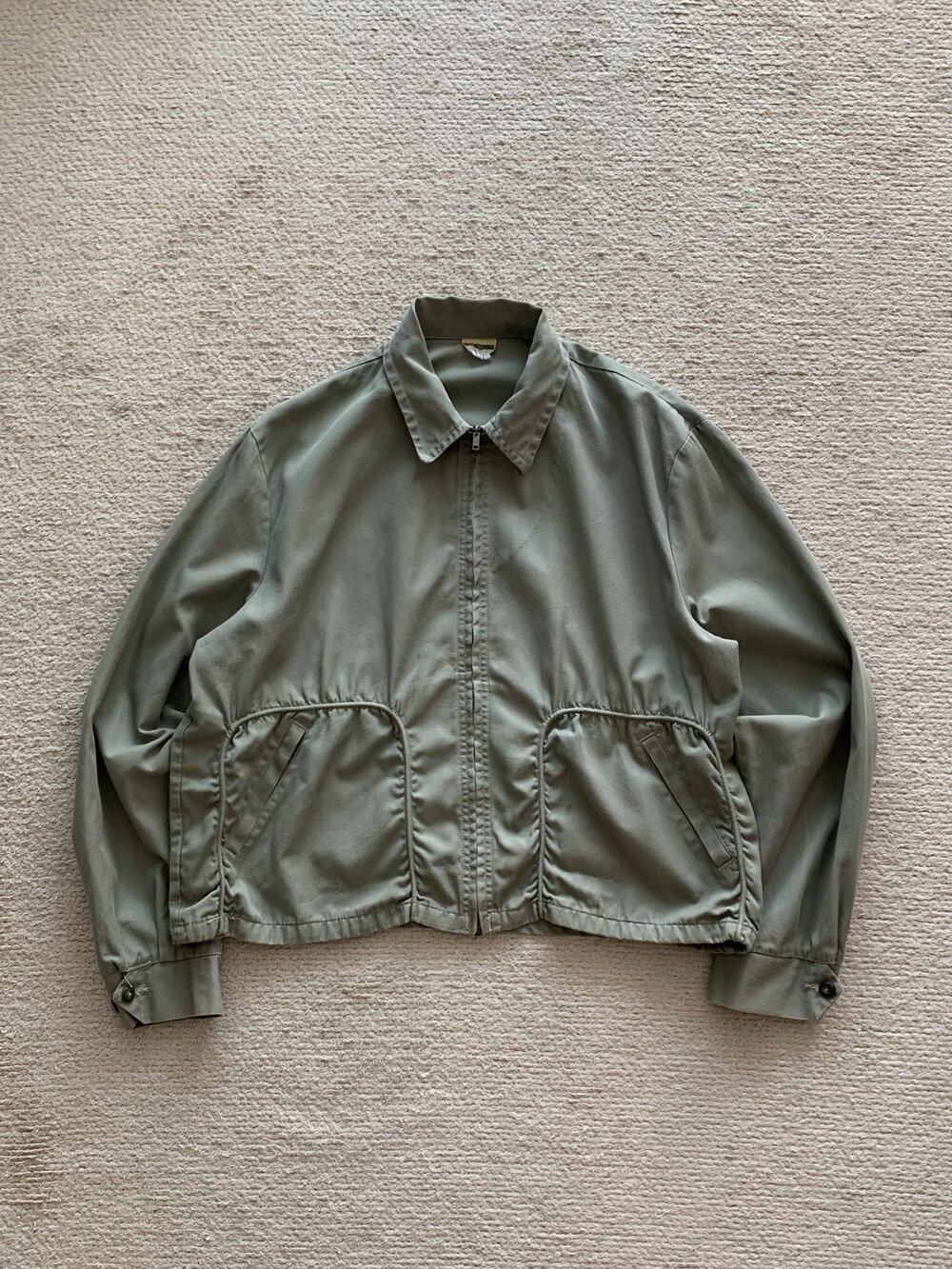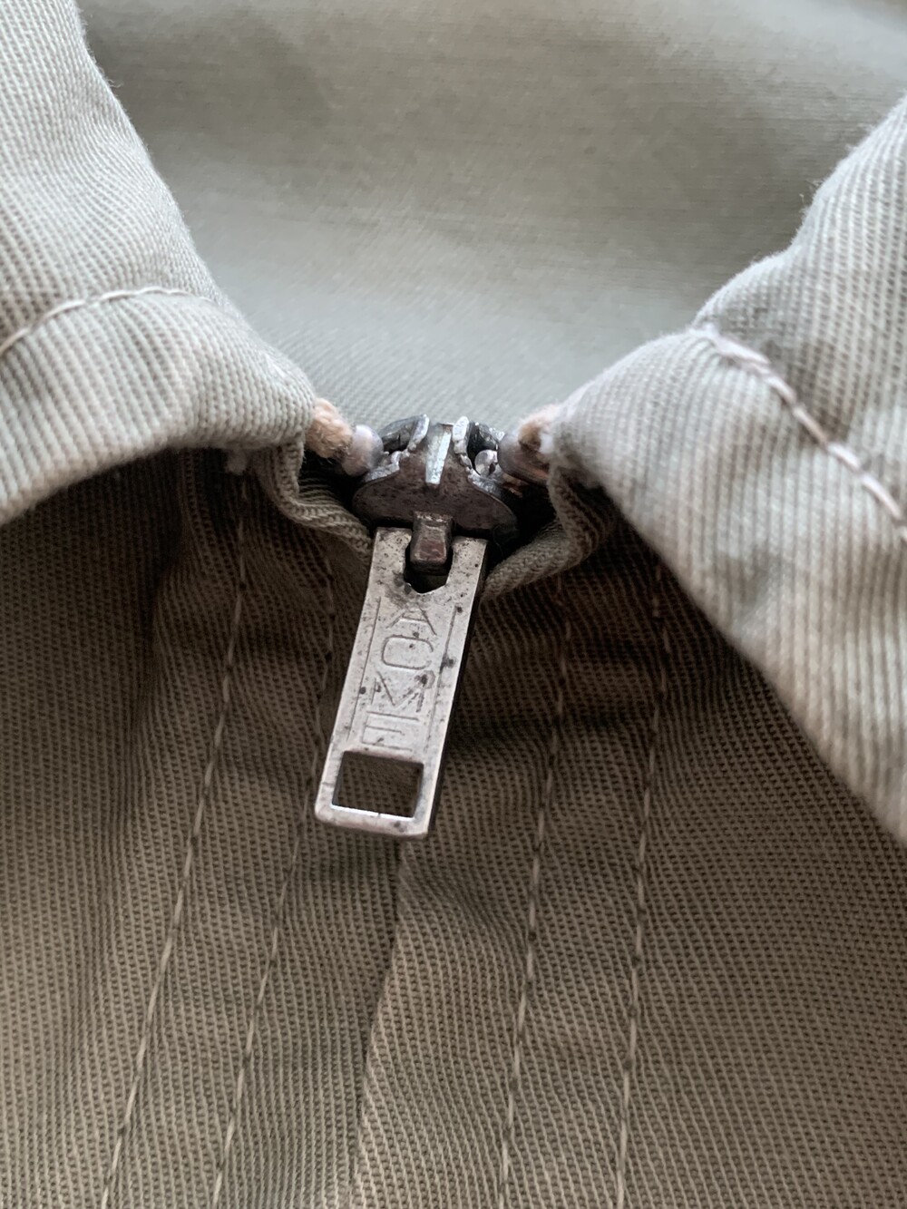 밀도 높은 코튼 트윌 원단, 전면 원단이 맞물려 지퍼 이빨이 보이지 않는 형태, 하단부 포켓을 둘러싸는 파이핑, 포켓 입구를 이중으로 가리는 덮개, 독특한 질감을 보이는 단추 등 여러모로 고전적인 디테일을 갖춘 스윙 자켓.