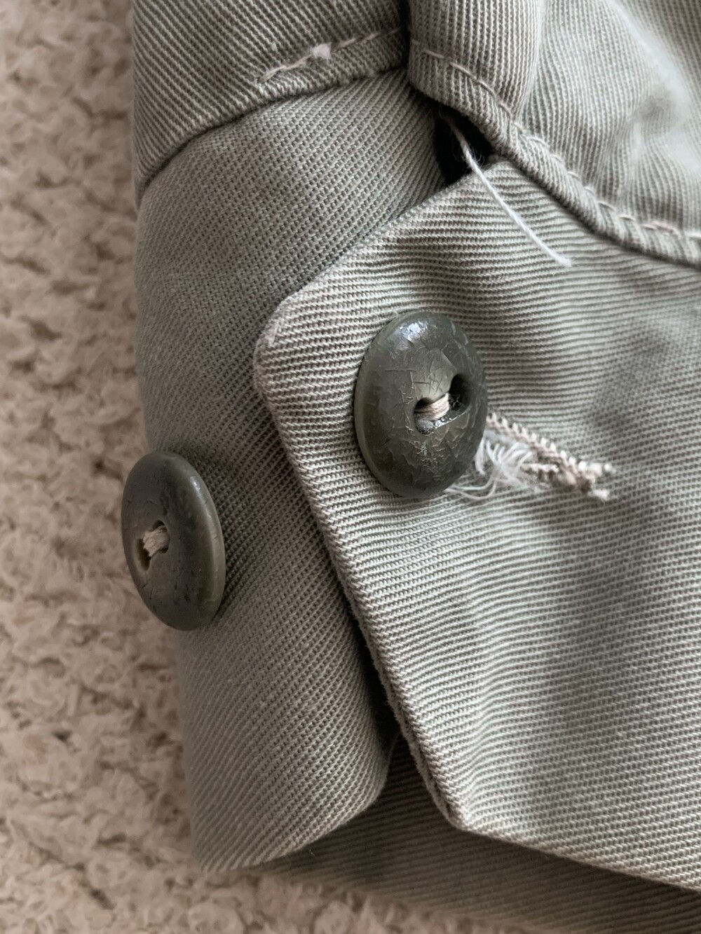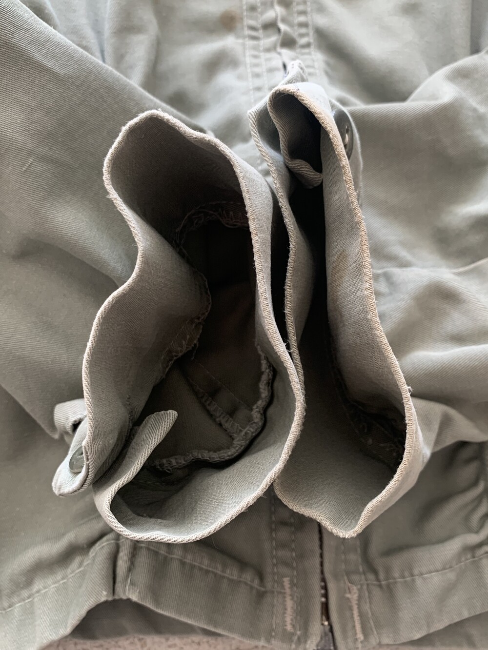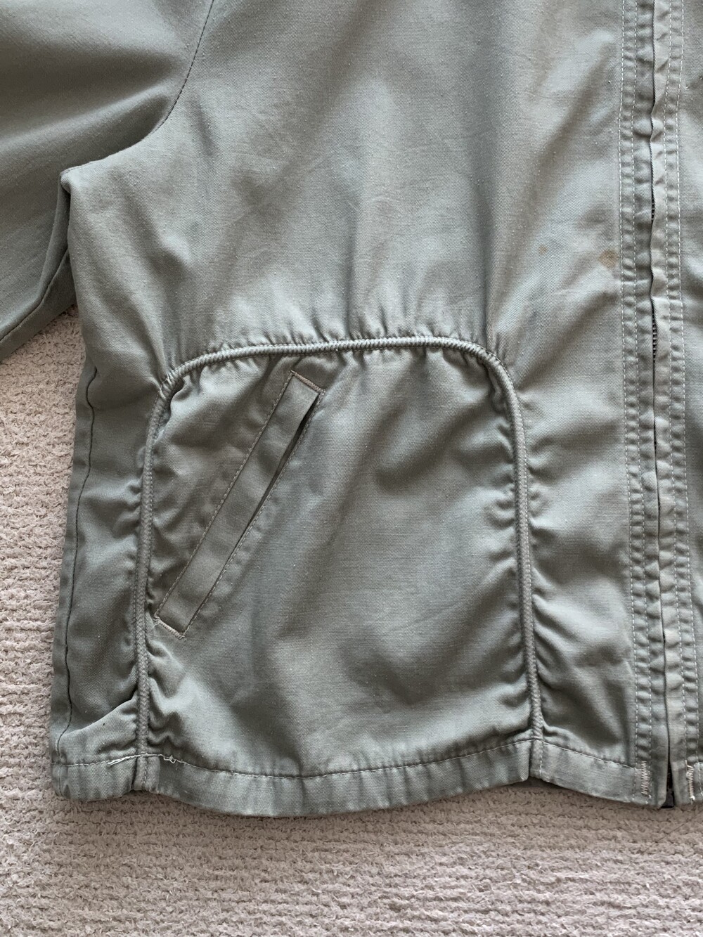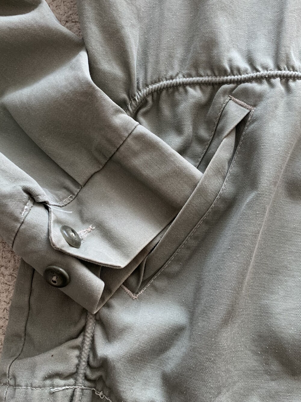 밀도 높은 코튼 트윌 원단, 전면 원단이 맞물려 지퍼 이빨이 보이지 않는 형태, 하단부 포켓을 둘러싸는 파이핑, 포켓 입구를 이중으로 가리는 덮개, 독특한 질감을 보이는 단추 등 여러모로 고전적인 디테일을 갖춘 스윙 자켓.