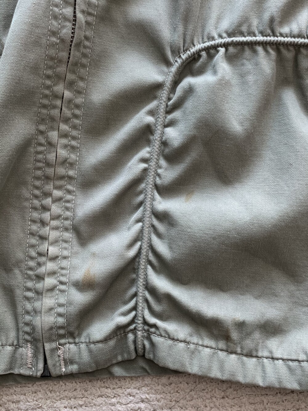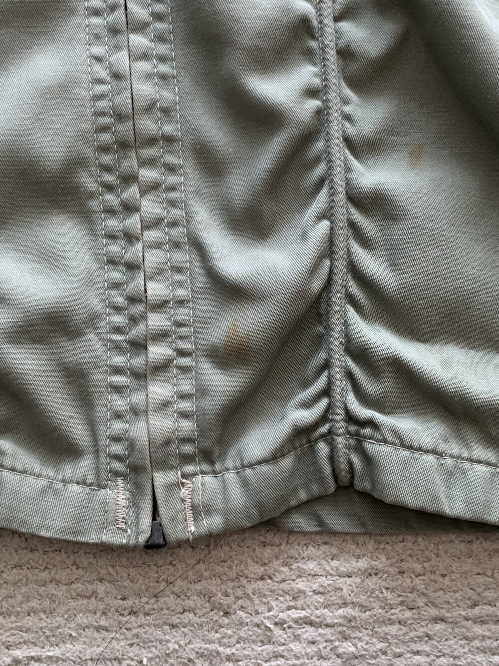 전면 부분과 소매에 얼룩이 있으며 후면부 스티치가 일부 풀린, 전반적으로 사용감 있는 제품.