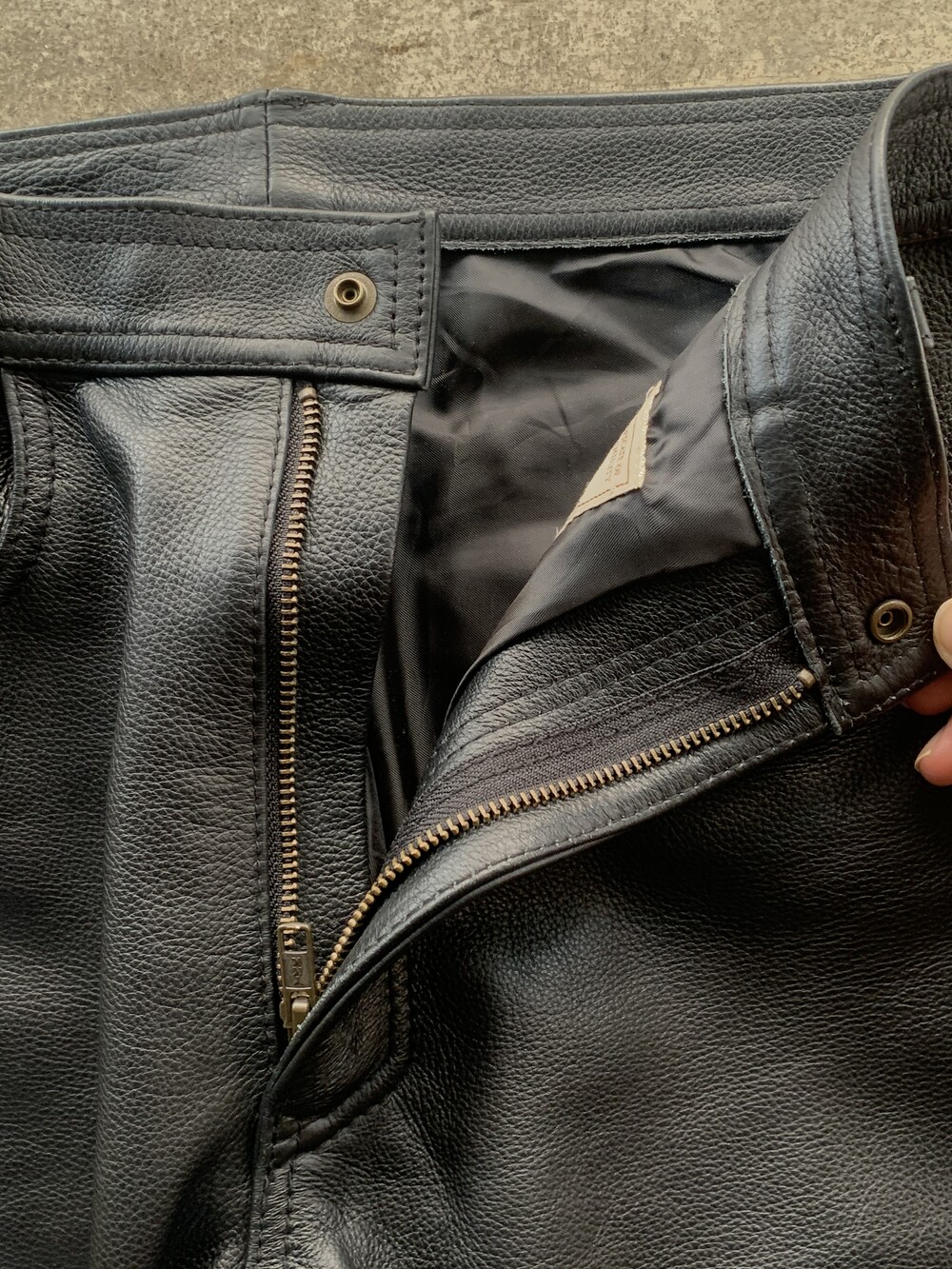 두께감이 있고 묵직한 카우하이드 레더 소재의 팬츠입니다. 데님팬츠에서 흔히 볼 수 있는 5포켓 형태로 뻣뻣하지는 않으며 바지 안쪽에 라이닝이 있어 허리 사이즈만 잘 맞춘다면 크게 불편함 없이 입을 수 있을만한 제품입니다. 리바이스 501을 연상시키는 슬림 스트레이트 실루엣으로 501을 매치하는 착장에 끼워넣어 색다른 분위기를 연출하는 데 좋을만한 제품입니다.