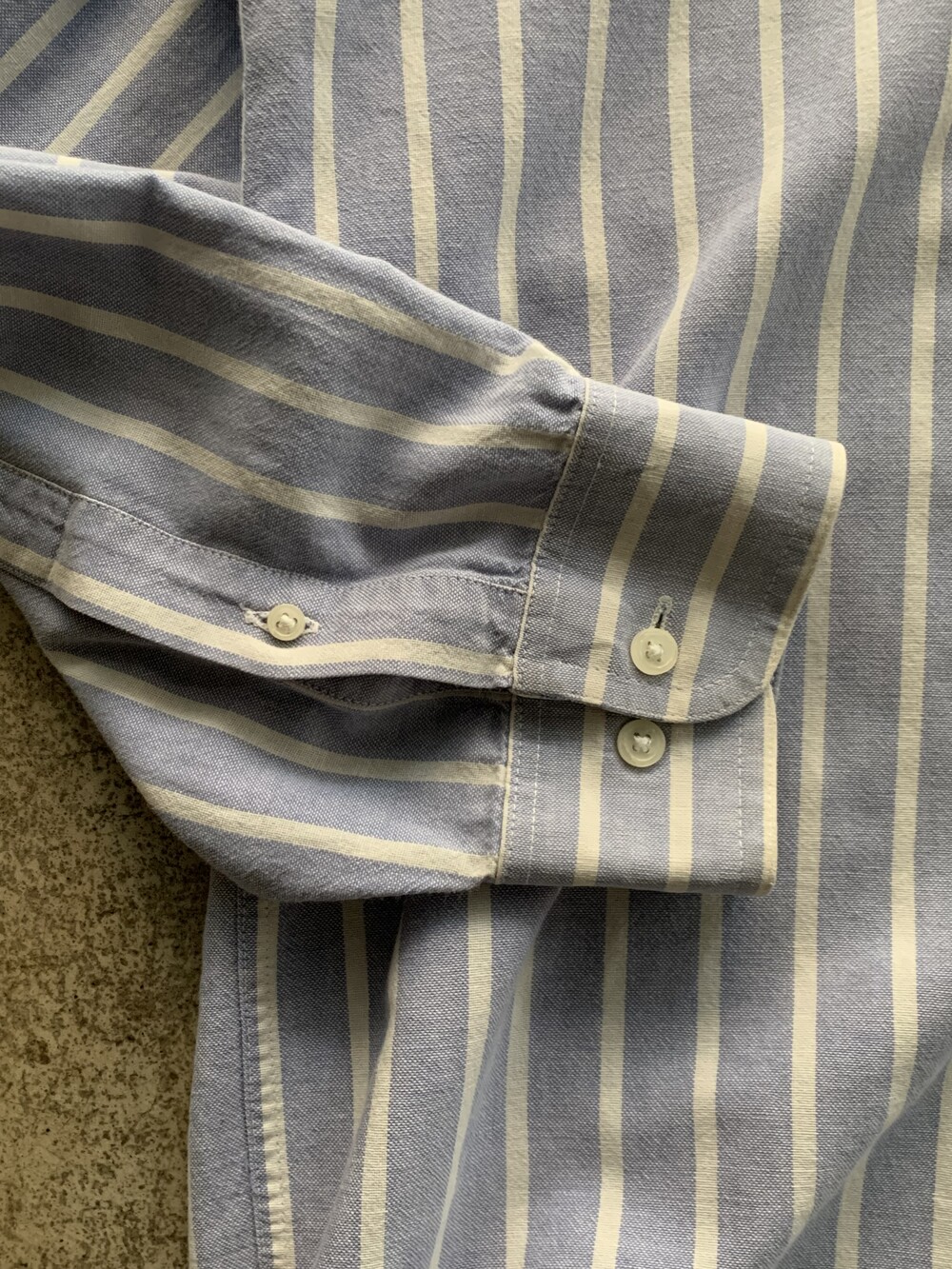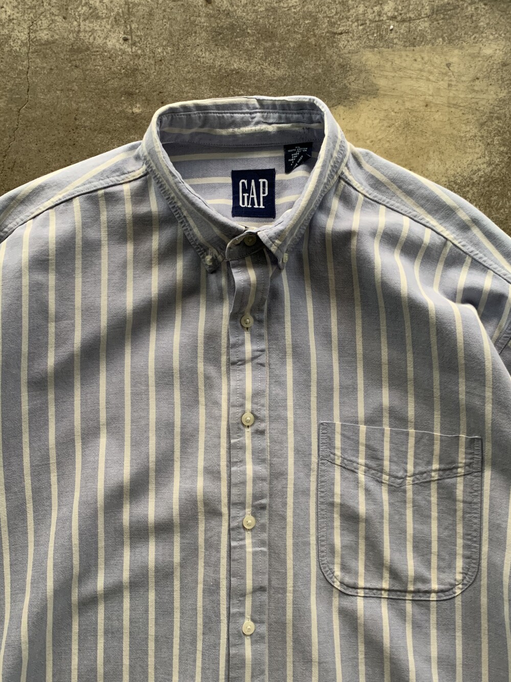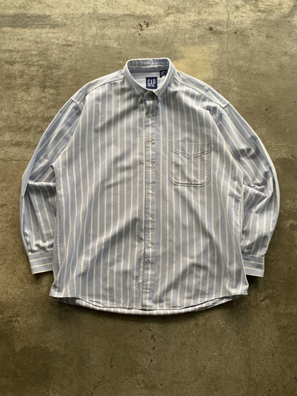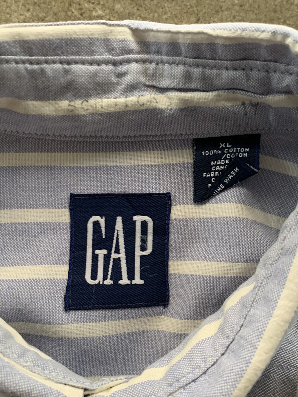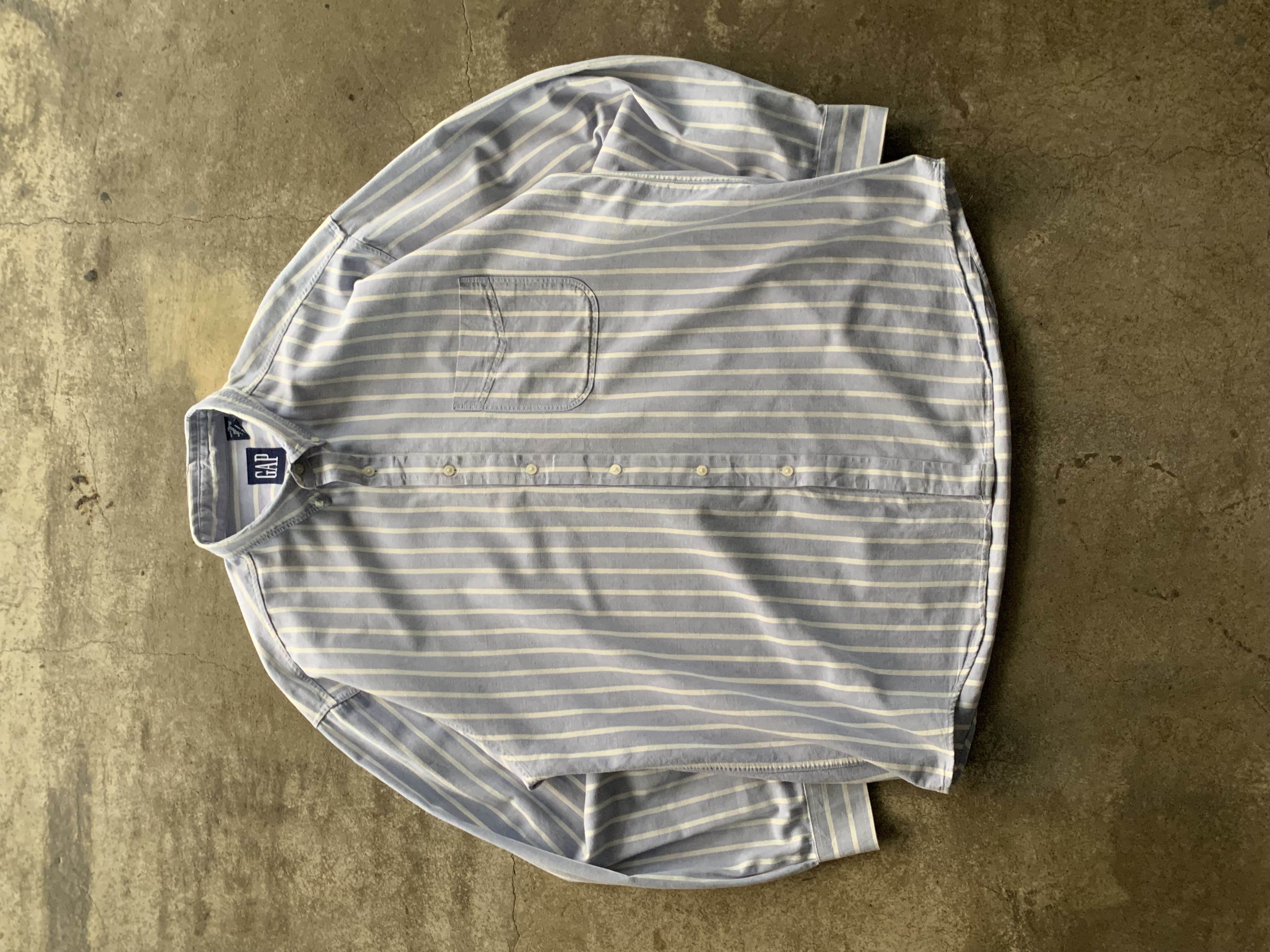 🚩Detail 1990년도에서 2000년도 초반 사이에 생산된 것으로 추정되는 올드 갭의 버튼다운 셔츠. 넥밴드 높이가 낮고 요크도 낮게 자리잡아 있으며 전면 아웃포켓까지 붙어 전반적으로 캐주얼한 분위기의 제품입니다. 굵은 스트라이프 패턴과 두껍지 않은 코튼 소재 트윌 원단으로 온화한 계절에도 쾌적하게 착용하기 좋을만한 제품입니다.