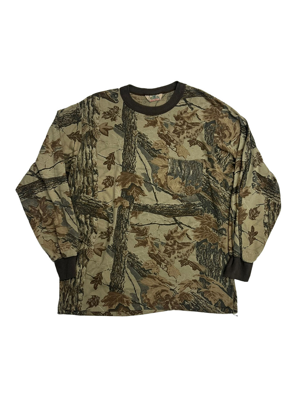 사냥 간 숲 속에서 몸을 숨기기 위해서 나뭇잎, 나뭇가지, 나무껍질 등으로 구성된 카모플라주 패턴인 리얼트리 패턴 프린팅이 전면에 놓여진 아웃도어 브랜드 레드헤드(RED HEAD)의 롱슬리브 티셔츠. 리얼트리(REAL TREE) 브랜드가 디자인한 카모플라주 패턴이 프린팅되어있습니다.