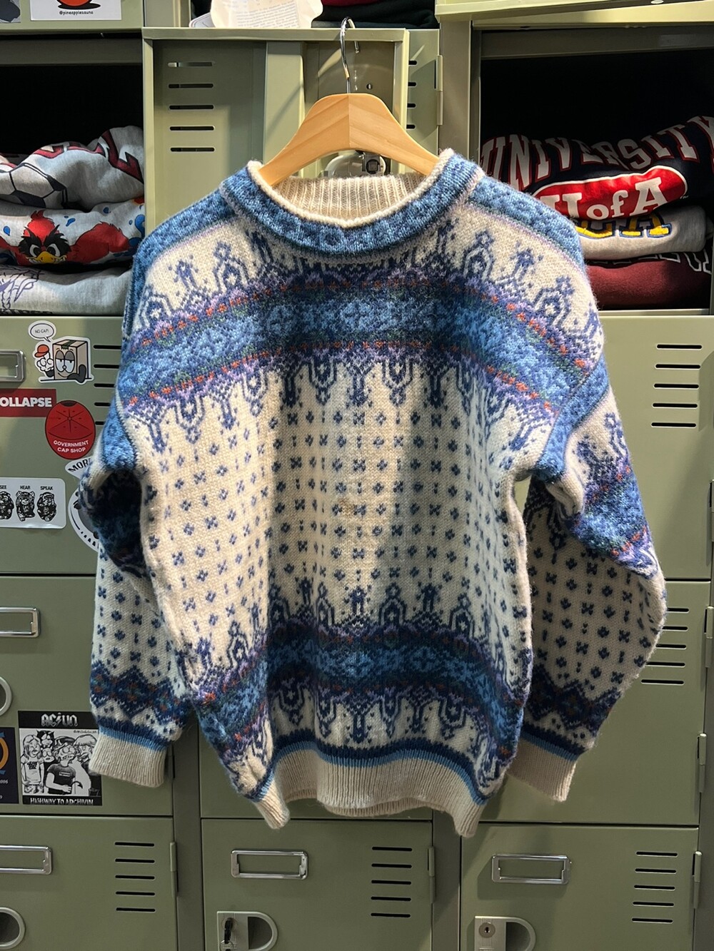 퓨어 울 소재의 단단하고 두께감있는 원단감이 돋보이는 데일 오브 노르웨이의 노르위전 니트 풀오버입니다. 어깨단면이 넓고 소매가 짧은 드롭숄더 타입의 니트 풀오버로, 전면 패턴과 배색이 매력적인 제품입니다.