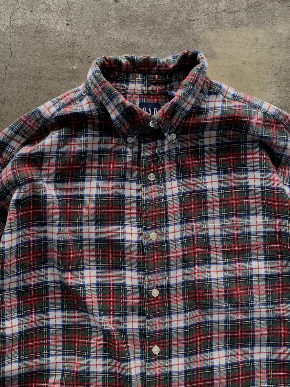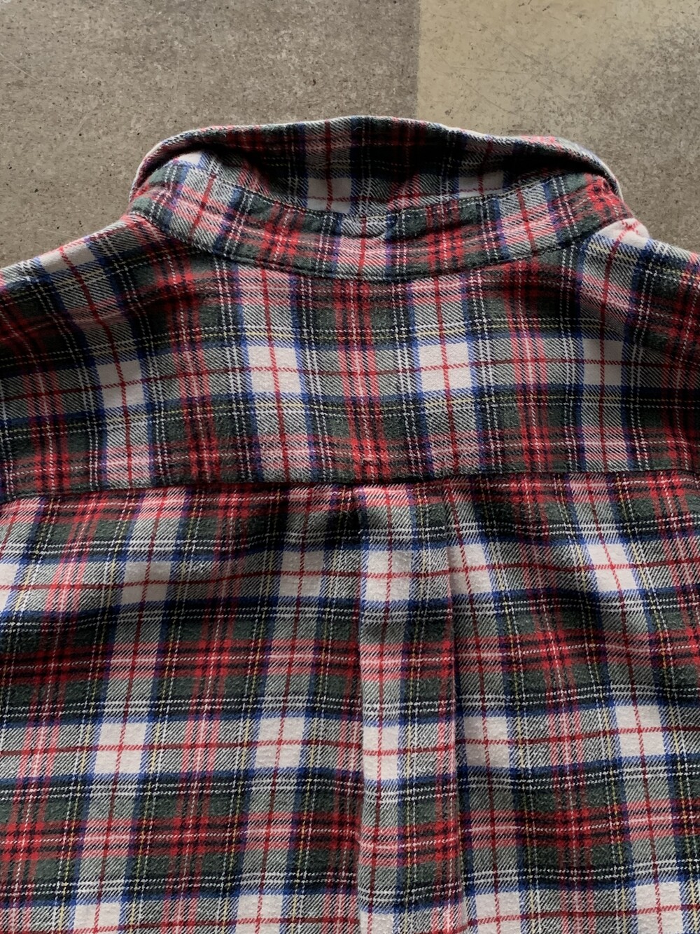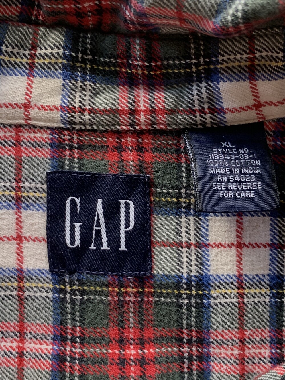1990년도에서 2000년도 초반 사이에 생산된 것으로 추정되는 올드 갭의 플란넬 버튼다운 셔츠. 다양한 배색의 체크 패턴과 겉면에 살짝 기모가 올라오는 터치감의 코튼 원단이 잘 어울리는 제품입니다. 넥밴드가 낮고 칼라가 길지 않은 버튼다운 셔츠로 캐주얼하게 활용하기 좋을만한 제품입니다.