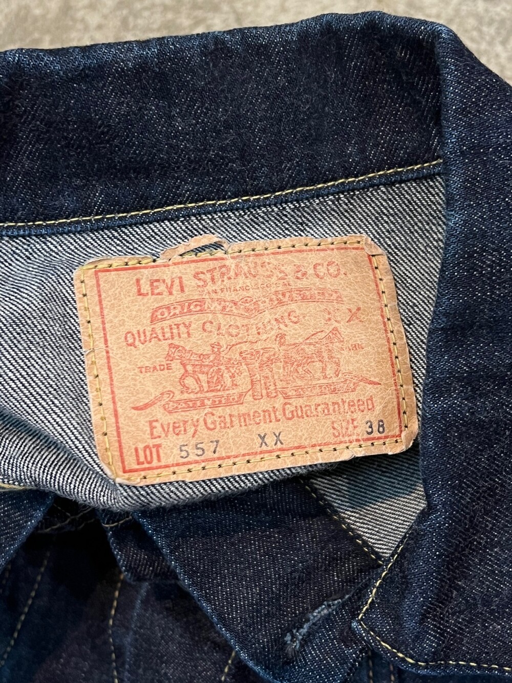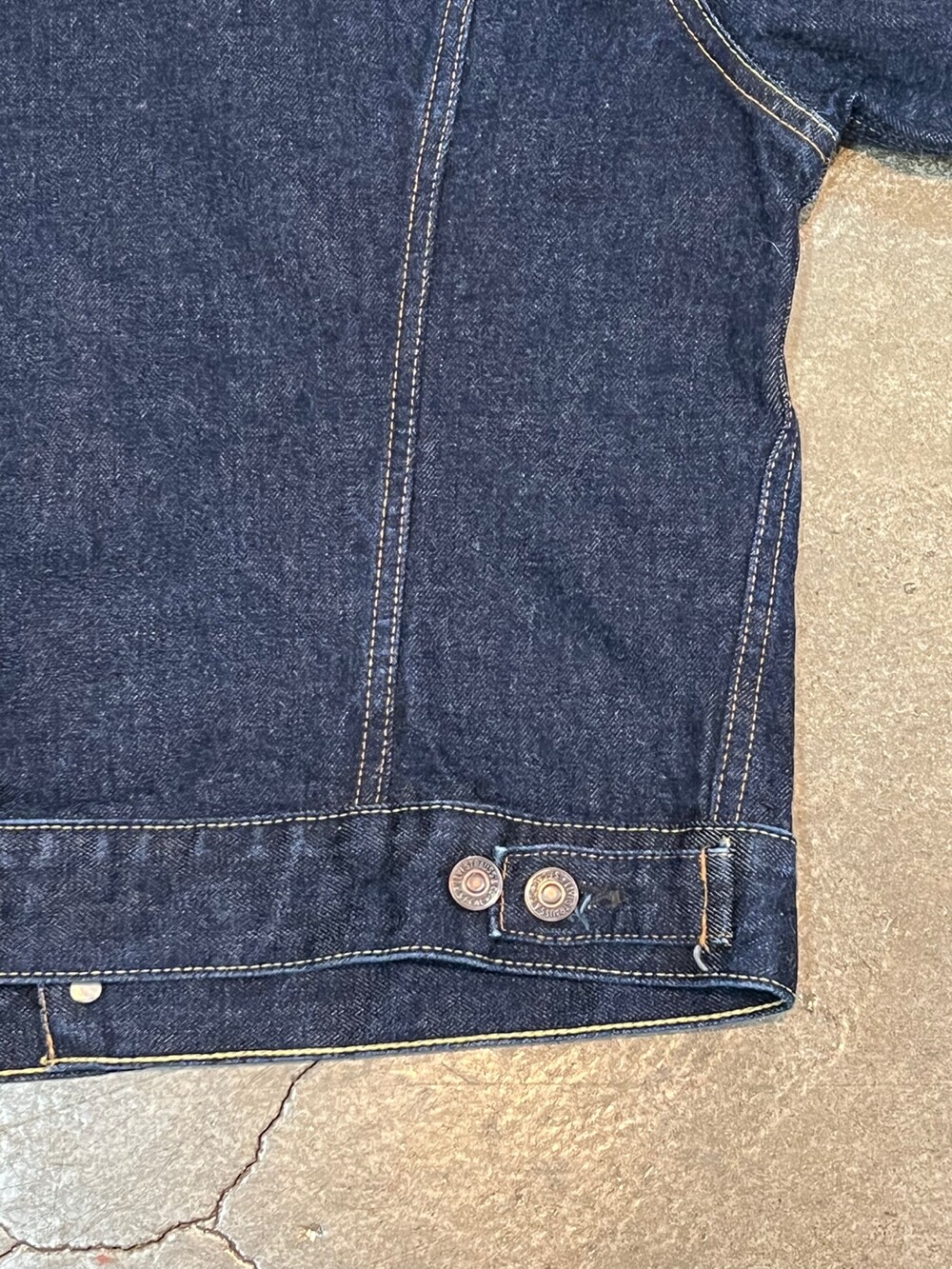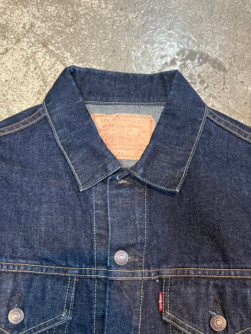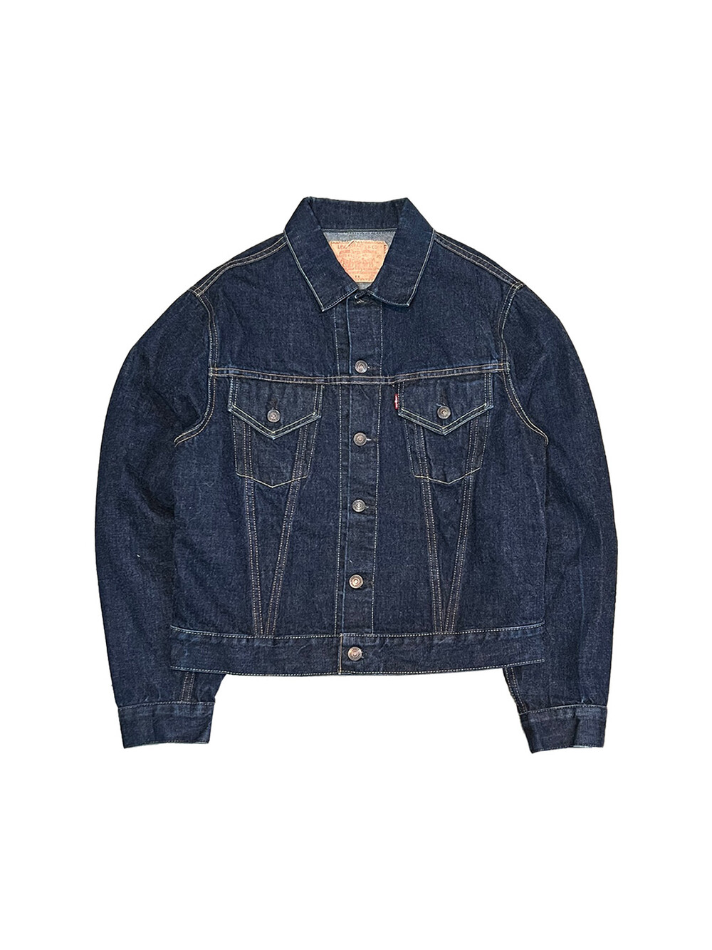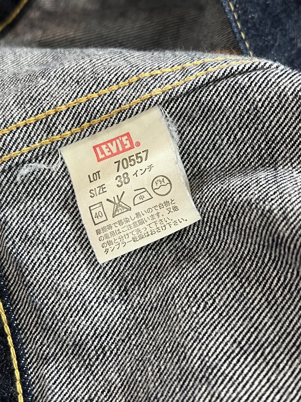 전면 V 스티치가 붙는 서드 타입의 데님 트러커 중에서도 1960년대 생산된 557XX 모델을 복각한 리바이스 빈티지 클로딩, 줄여서 LVC의 2000년대 일본 생산 70557 데님 트러커입니다. 557XX 원판 특유의 스티치 배열과 색상등을 잘 구현한 제품으로, 별다른 빈티지 가공 없이 리지드 상태로 출시되어 착용하면서 차후 페이딩을 기대할만한 제품입니다.