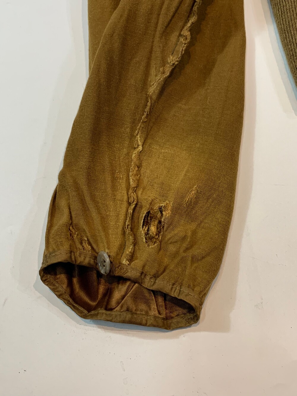 라이너 소매에 닳아 헤진 흔적이 있으면 겉감 전면 및 후면에도 핀홀이 있는, 사용감 있는 제품.