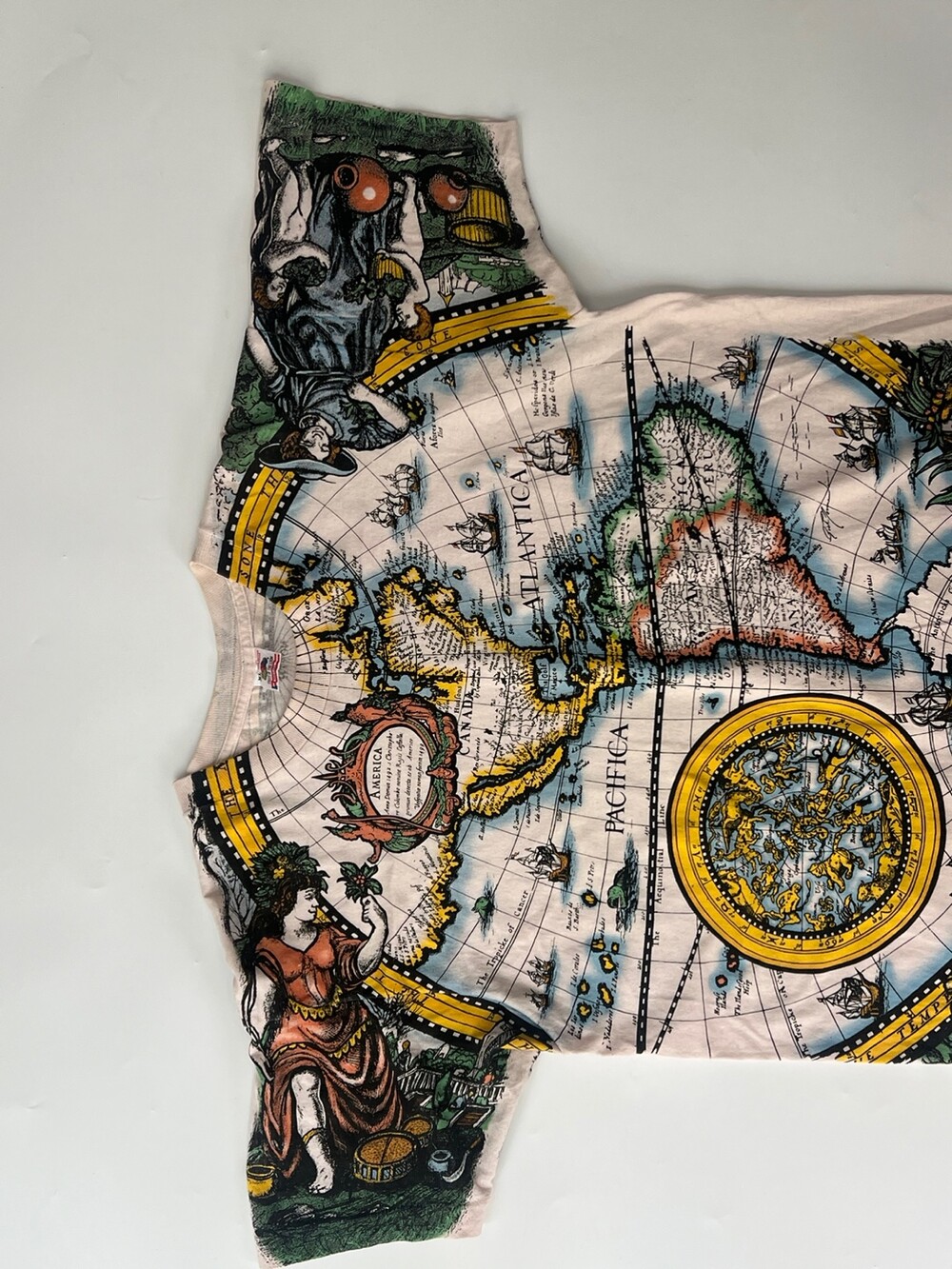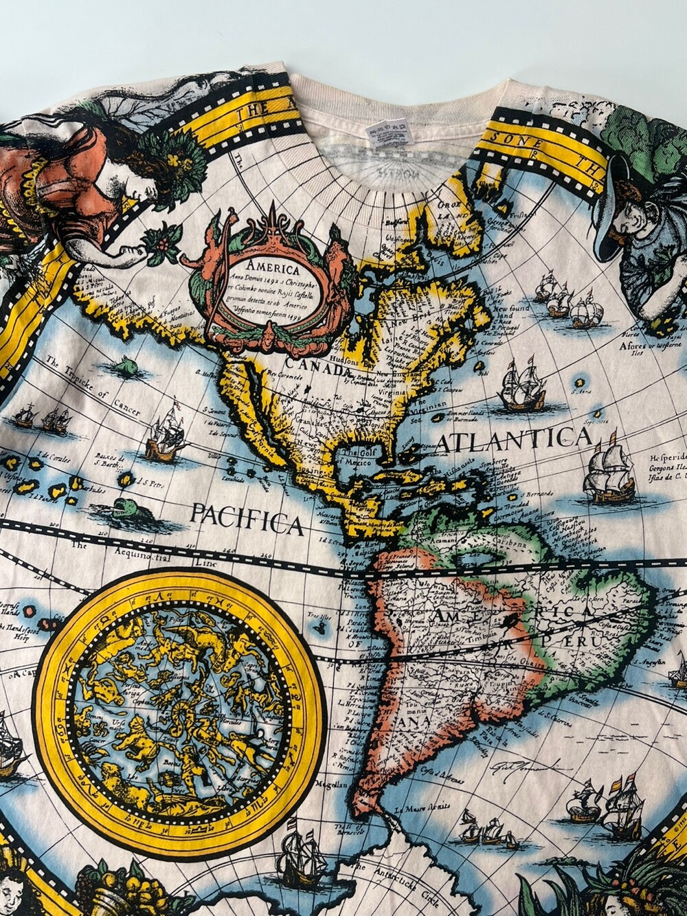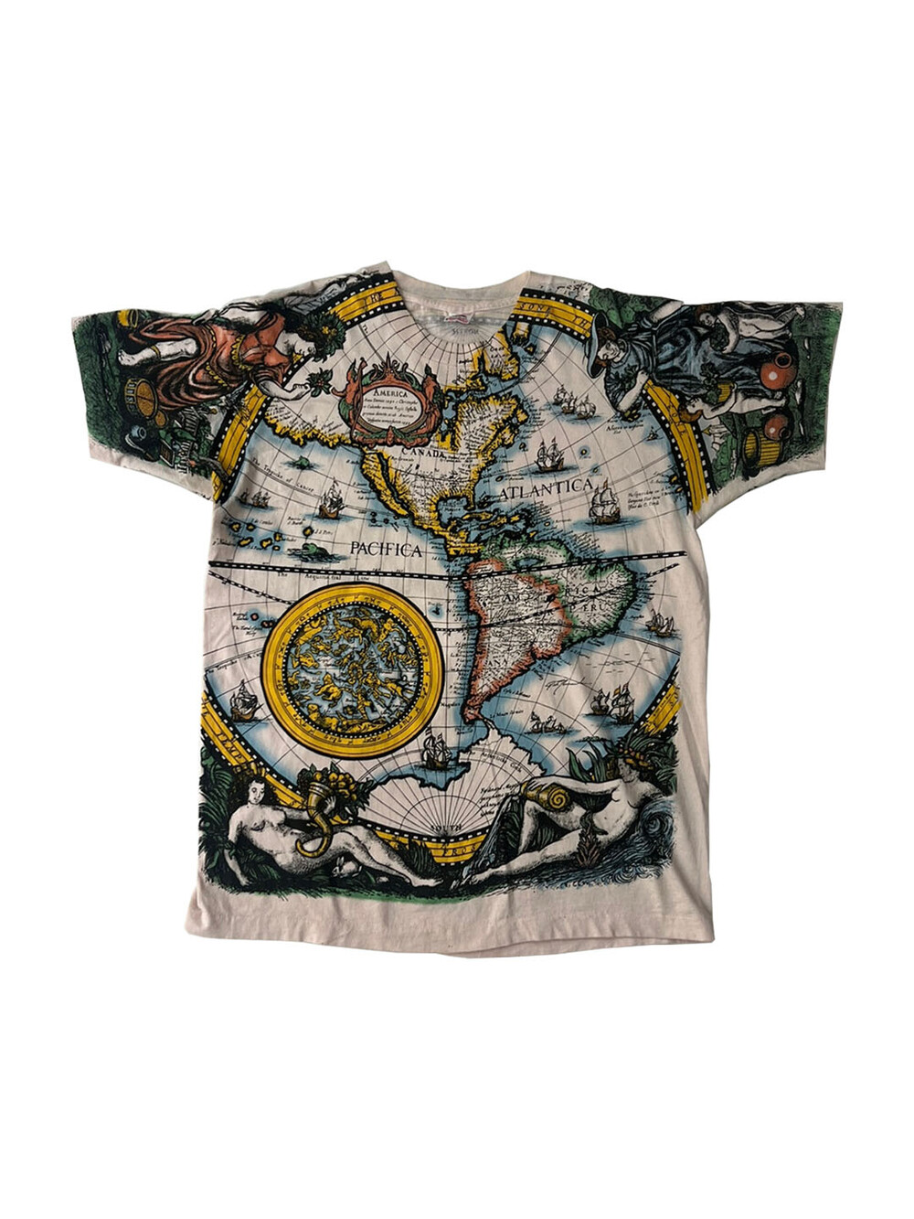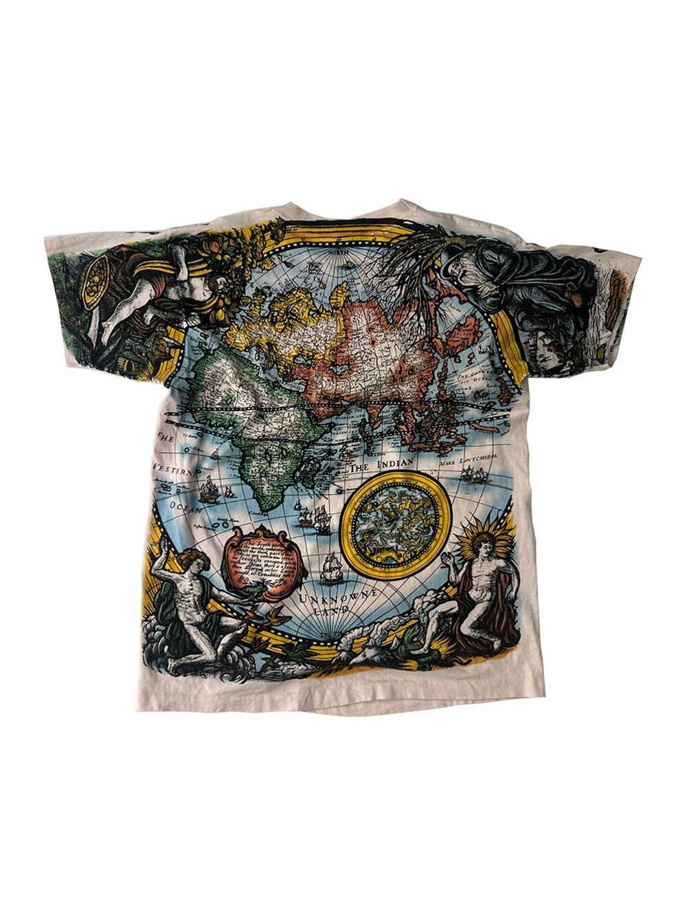 1992년 리퀴드 블루(LIQUID BLUE)의 월드 아틀라스 맵 프린팅이 앞뒤로 배치된 AOP(All Over Printed) 장르의 티셔츠.