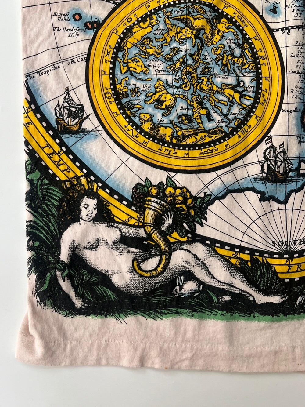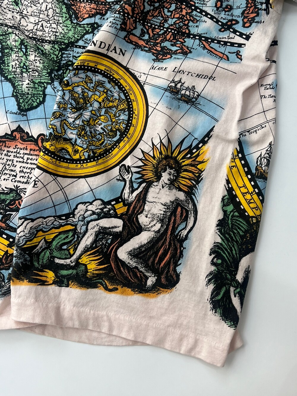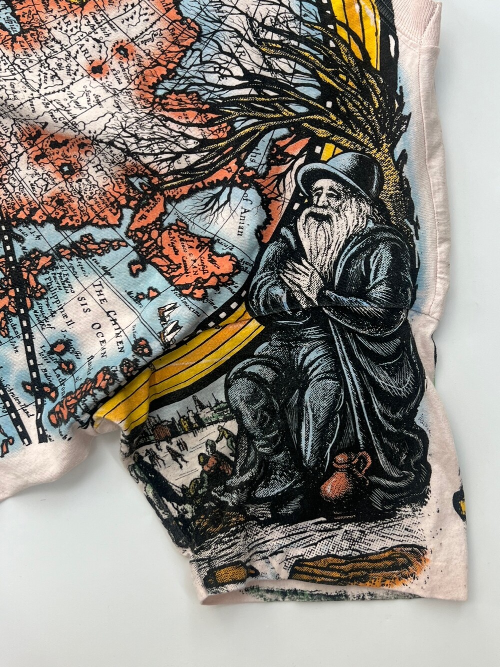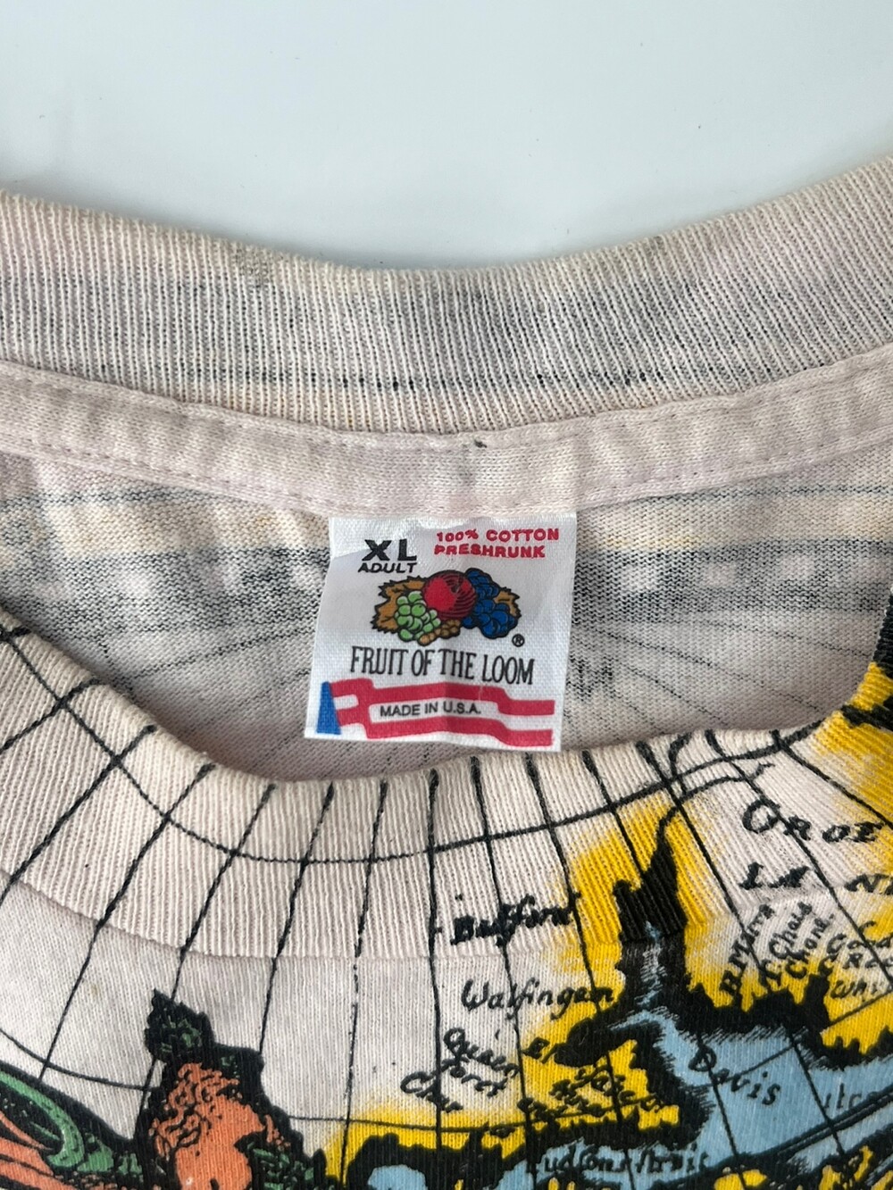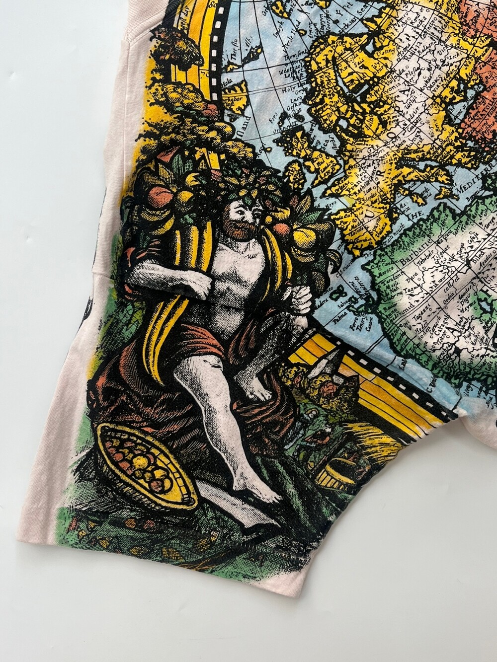 1992년 리퀴드 블루(LIQUID BLUE)의 월드 아틀라스 맵 프린팅이 앞뒤로 배치된 AOP(All Over Printed) 장르의 티셔츠.