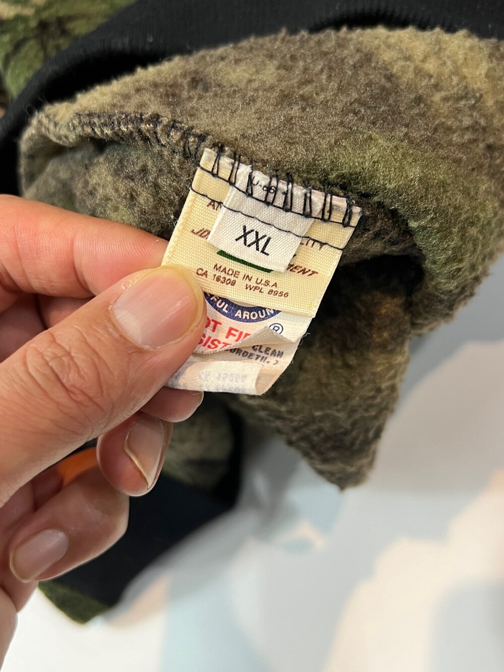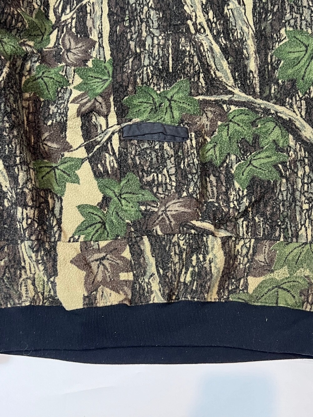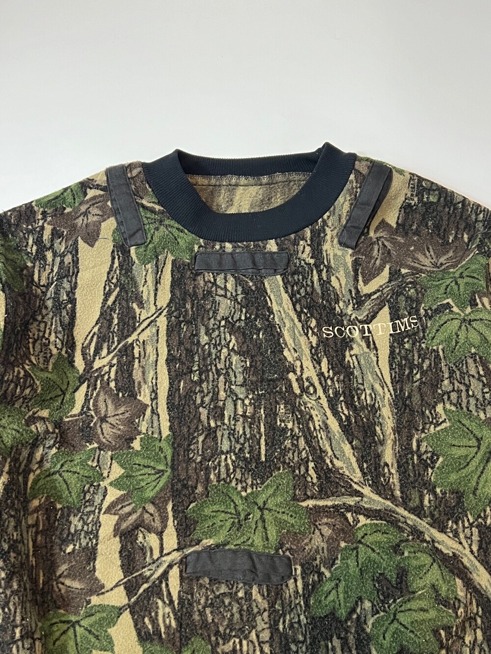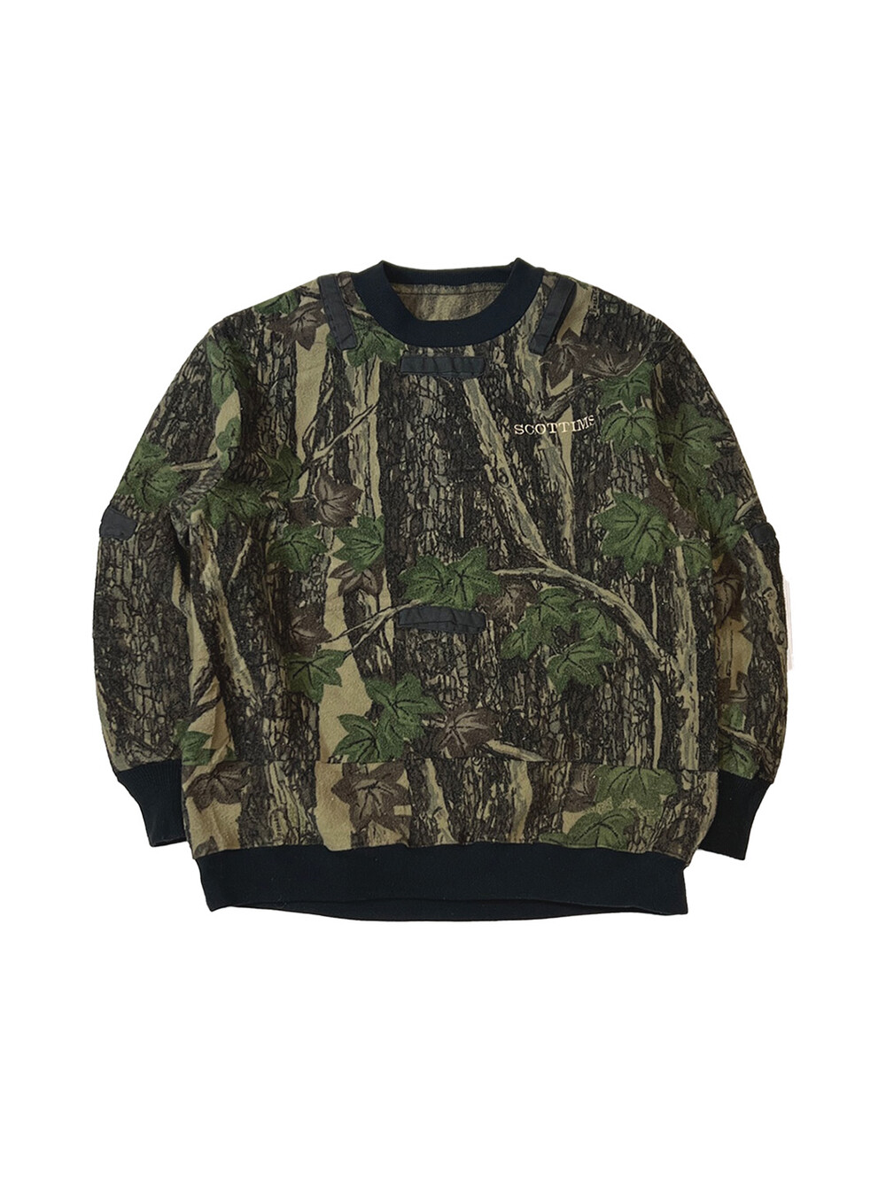 보일드 울과 유사한, 플리스라고 하기에는 다소 거칠고 단단한 질감의 번팅(Bunting) 원단 리얼트리 프린팅 풀오버입니다. 넥라인 주변, 전후면, 소매 및 어깨 부분에 포켓이 배치되어 있는데 충격 보호용 패드를 끼워넣거나 탄창을 보관하는 용도의 주머니로 추정됩니다.
