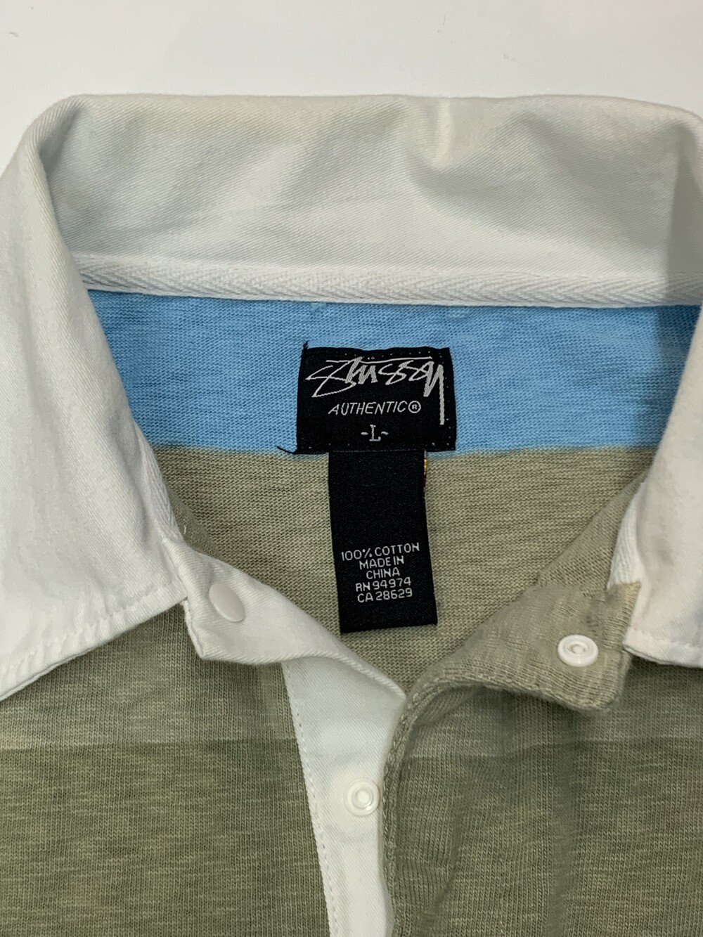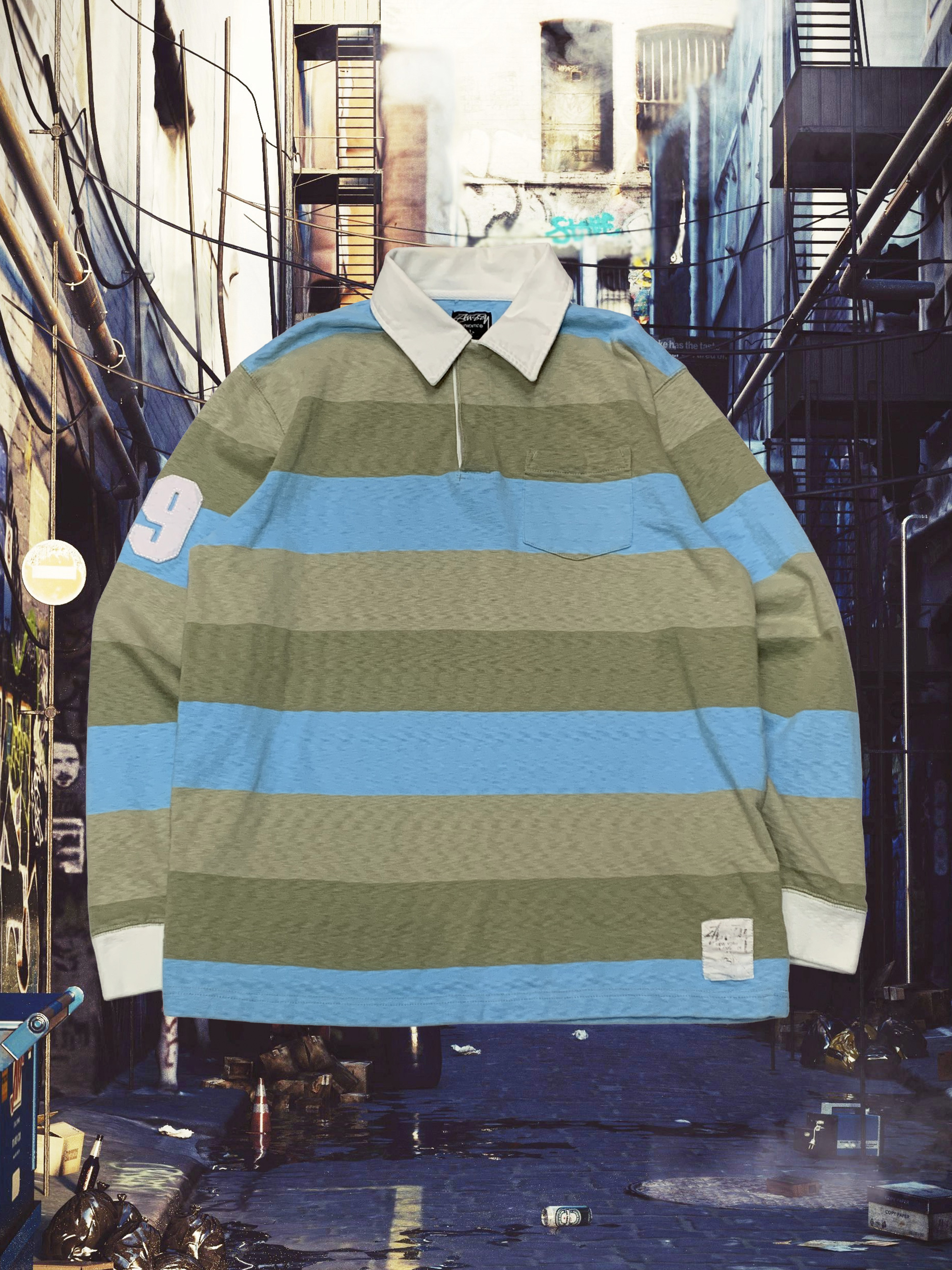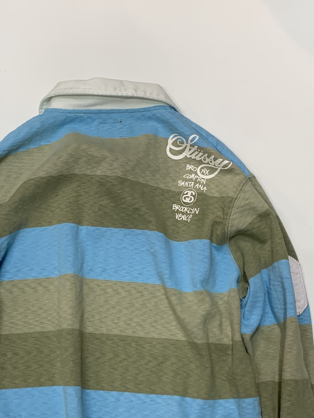 이러한 월드 투어 티셔츠의 구성을 그대로 이어받아, 전면 하단부에는 프린트 패치가, 후면부 상단에는 필기체 프린팅을 배치하여 상반되는 것들끼리 병치하는 컨셉을 그대로 구현하여 출시한 2000년대 스투시의 럭비셔츠입니다. 굵은 스트라이프 배색과 버튼클로징 대신 전면 스냅버튼 클로징으로 캐주얼하게 착용하기 좋을만한 제품입니다.