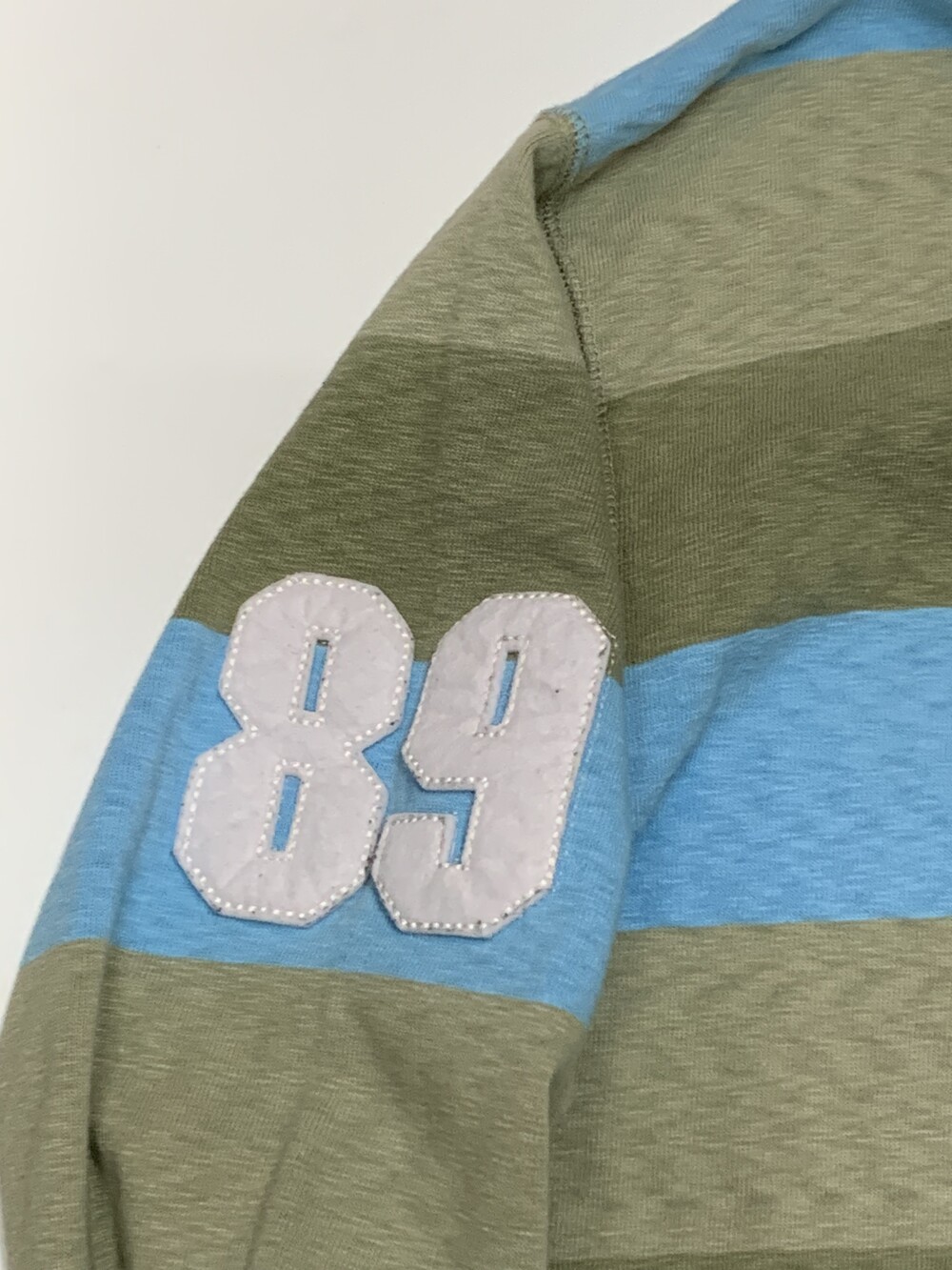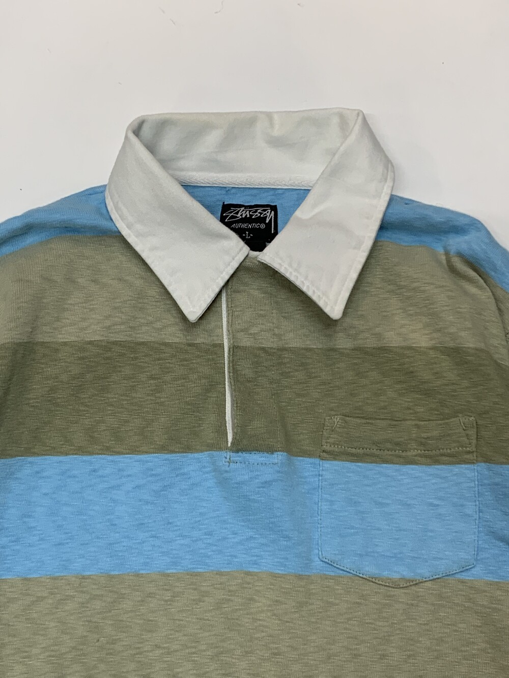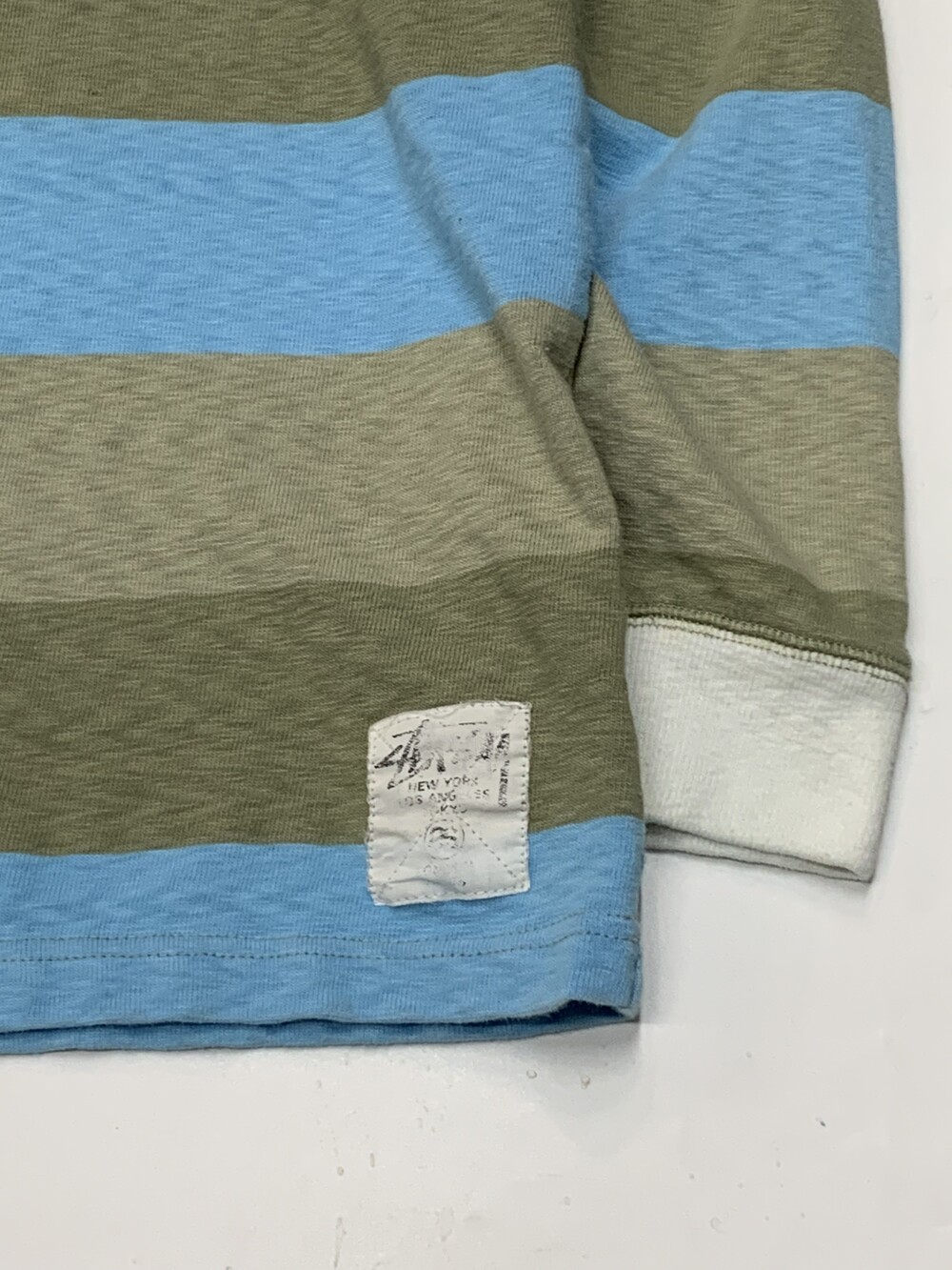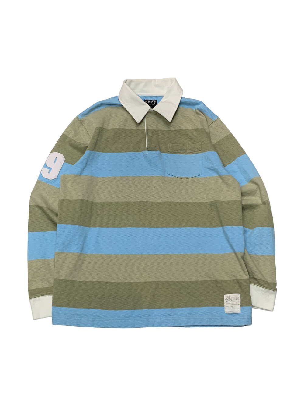 이러한 월드 투어 티셔츠의 구성을 그대로 이어받아, 전면 하단부에는 프린트 패치가, 후면부 상단에는 필기체 프린팅을 배치하여 상반되는 것들끼리 병치하는 컨셉을 그대로 구현하여 출시한 2000년대 스투시의 럭비셔츠입니다. 굵은 스트라이프 배색과 버튼클로징 대신 전면 스냅버튼 클로징으로 캐주얼하게 착용하기 좋을만한 제품입니다.