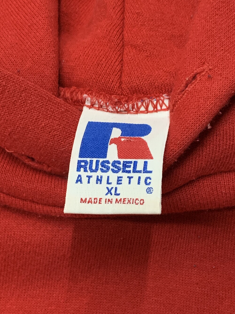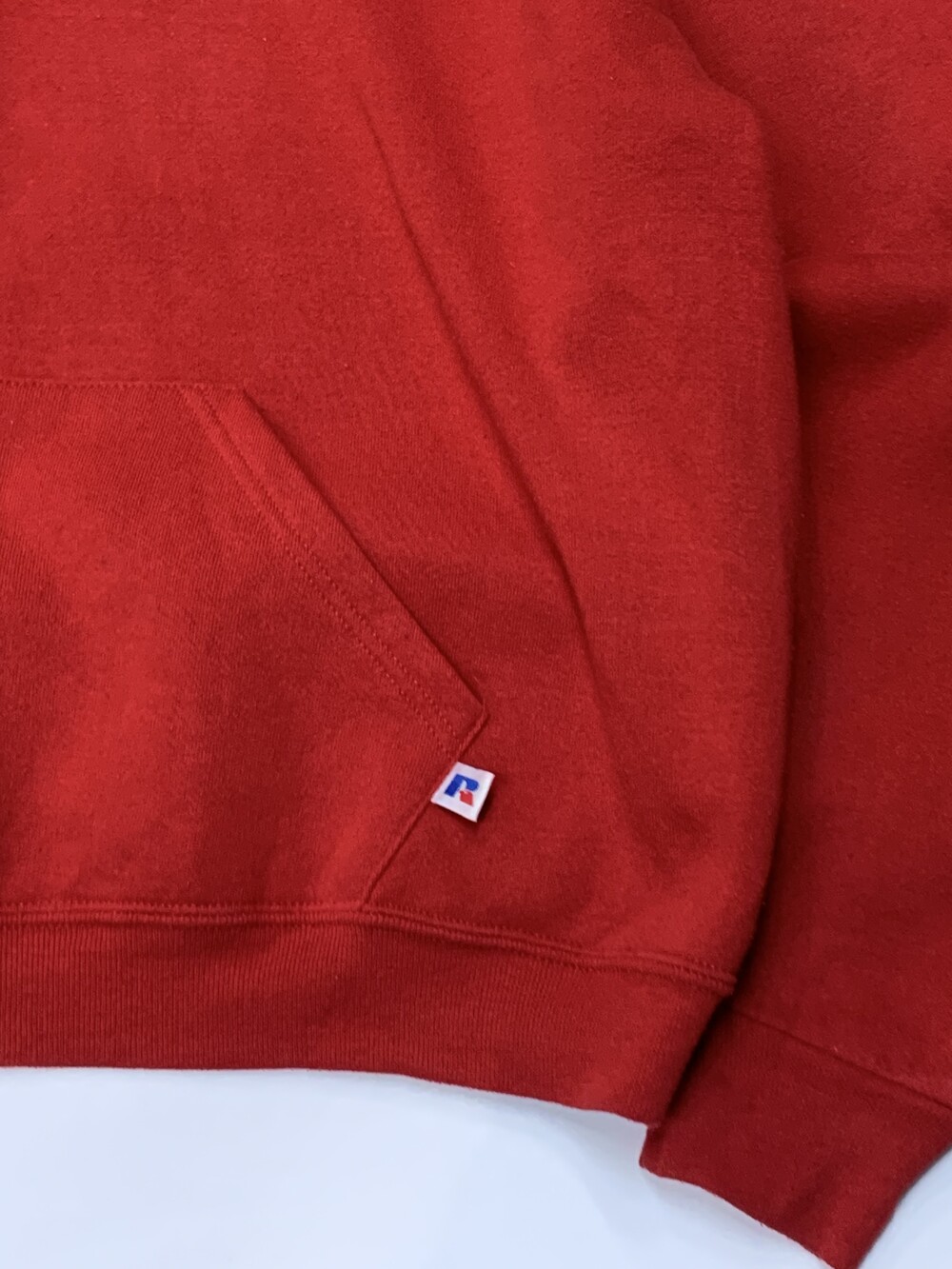 🚩Detail 몸판 옆 부분, 밑단 립(Rib) 부분에 봉제선이 없는 형태를 원통형 관 모양이라는 의미의 튜블러(Tubular) 라고 합니다. 튜블러 타입 스웻류중에서도 수요가 많은 1990년대에서 2000년대 사이에 생산된 러셀 애슬레틱의 스웻 후디입니다. 코튼/폴리 혼방 특유의 원단감, 바람이 새어 들어오는 걸 막고자 크기가 작고 비대칭형 아일렛 배치가 돋보이는 후드, 특유의 벌키한 실루엣이 매력적인 제품입니다. 유스 하키 팀인 Markham Stouffville STARS 자수가 팀컬러인 빨간색 바디 위에 작게 올려져 있습니다.