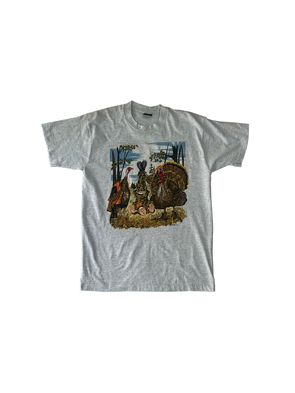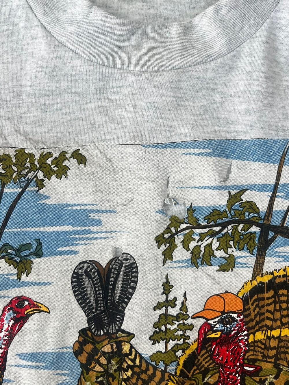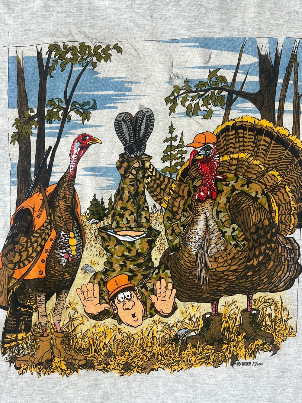 추수감사절의 희생양인 칠면조와 사냥꾼의 입장이 역전된 유쾌한 프린팅이 돋보이는 티셔츠. 칠면조 프린팅을 향해 총이라도 쏜 것인지, 넥라인 뿐만아니라 전면과 후면 모두 데미지가 있는 제품으로 컨디션에 예민한 분들에게는 권장드리지 않습니다.