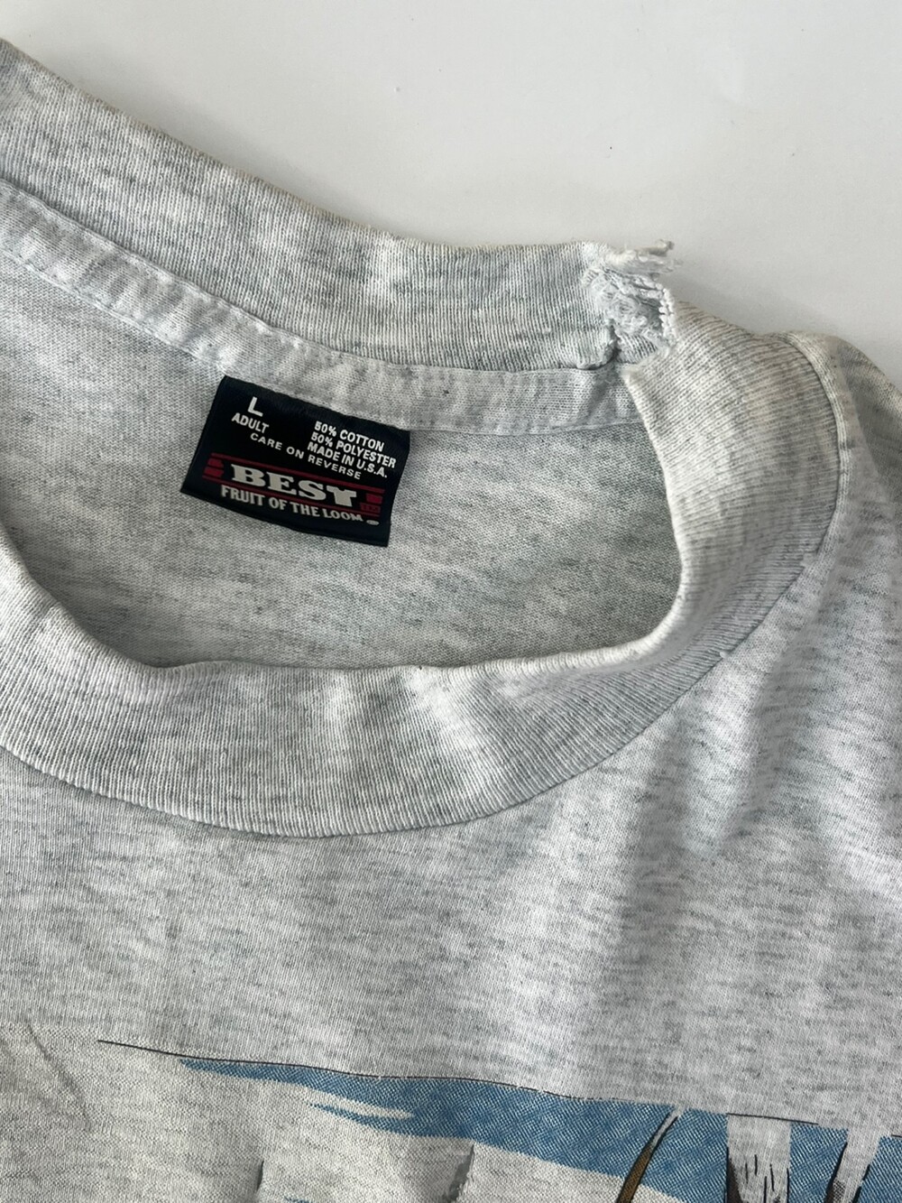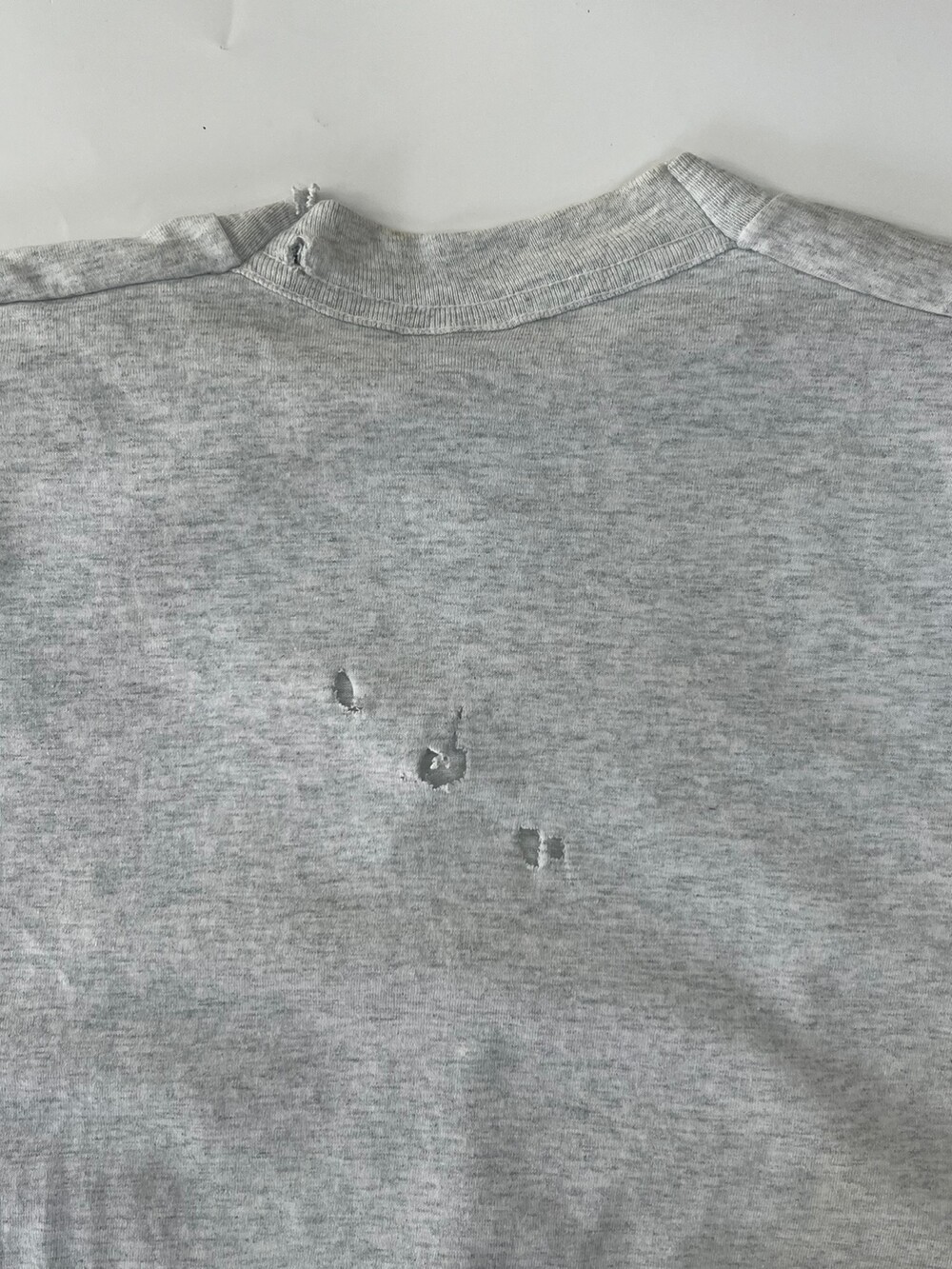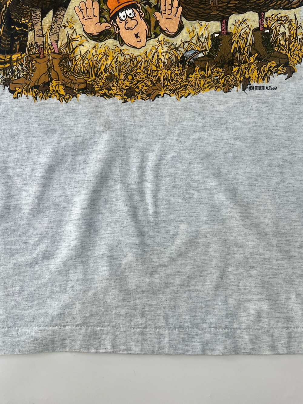 추수감사절의 희생양인 칠면조와 사냥꾼의 입장이 역전된 유쾌한 프린팅이 돋보이는 티셔츠. 칠면조 프린팅을 향해 총이라도 쏜 것인지, 넥라인 뿐만아니라 전면과 후면 모두 데미지가 있는 제품으로 컨디션에 예민한 분들에게는 권장드리지 않습니다.