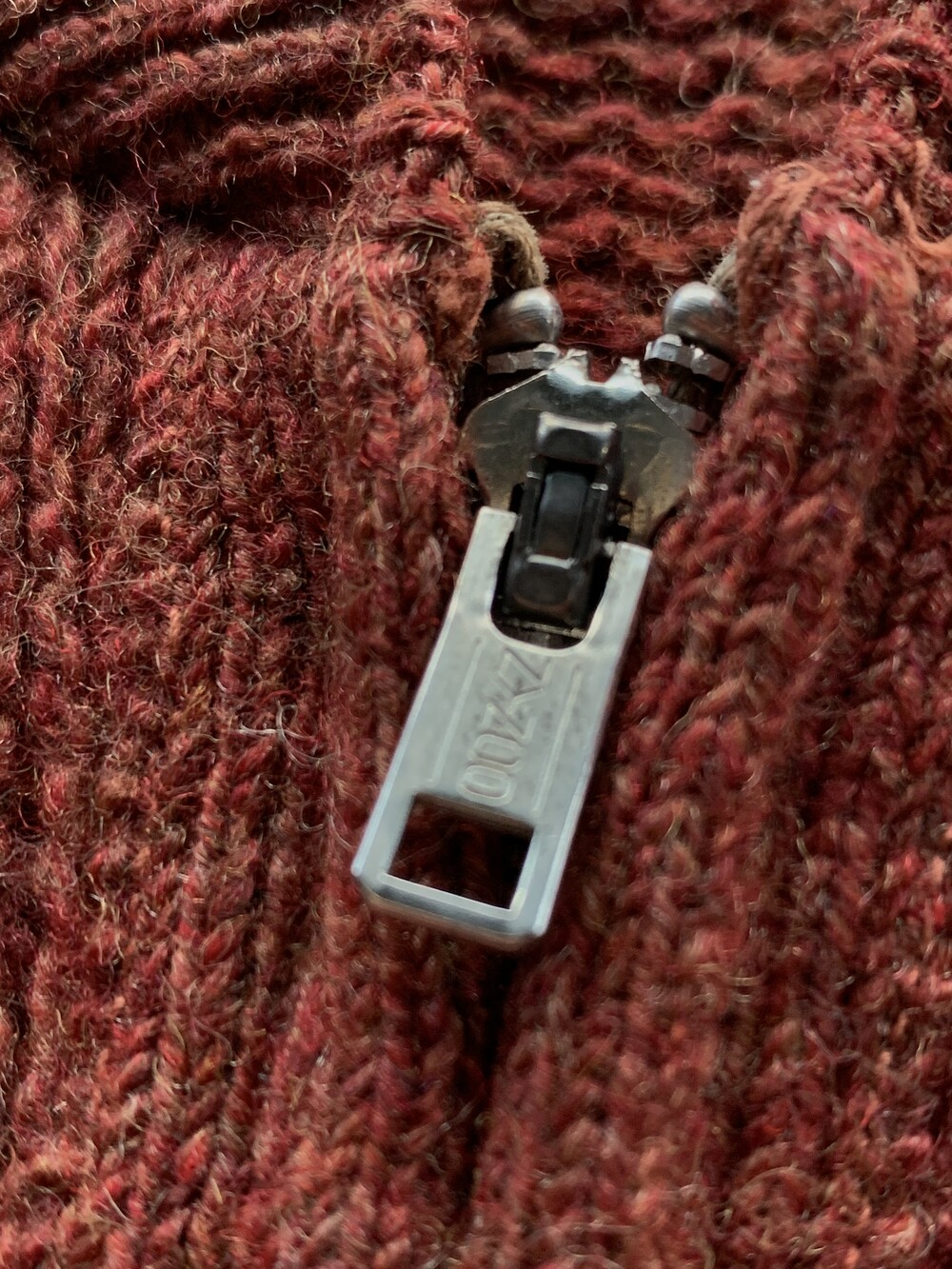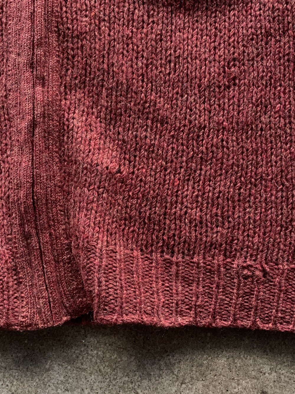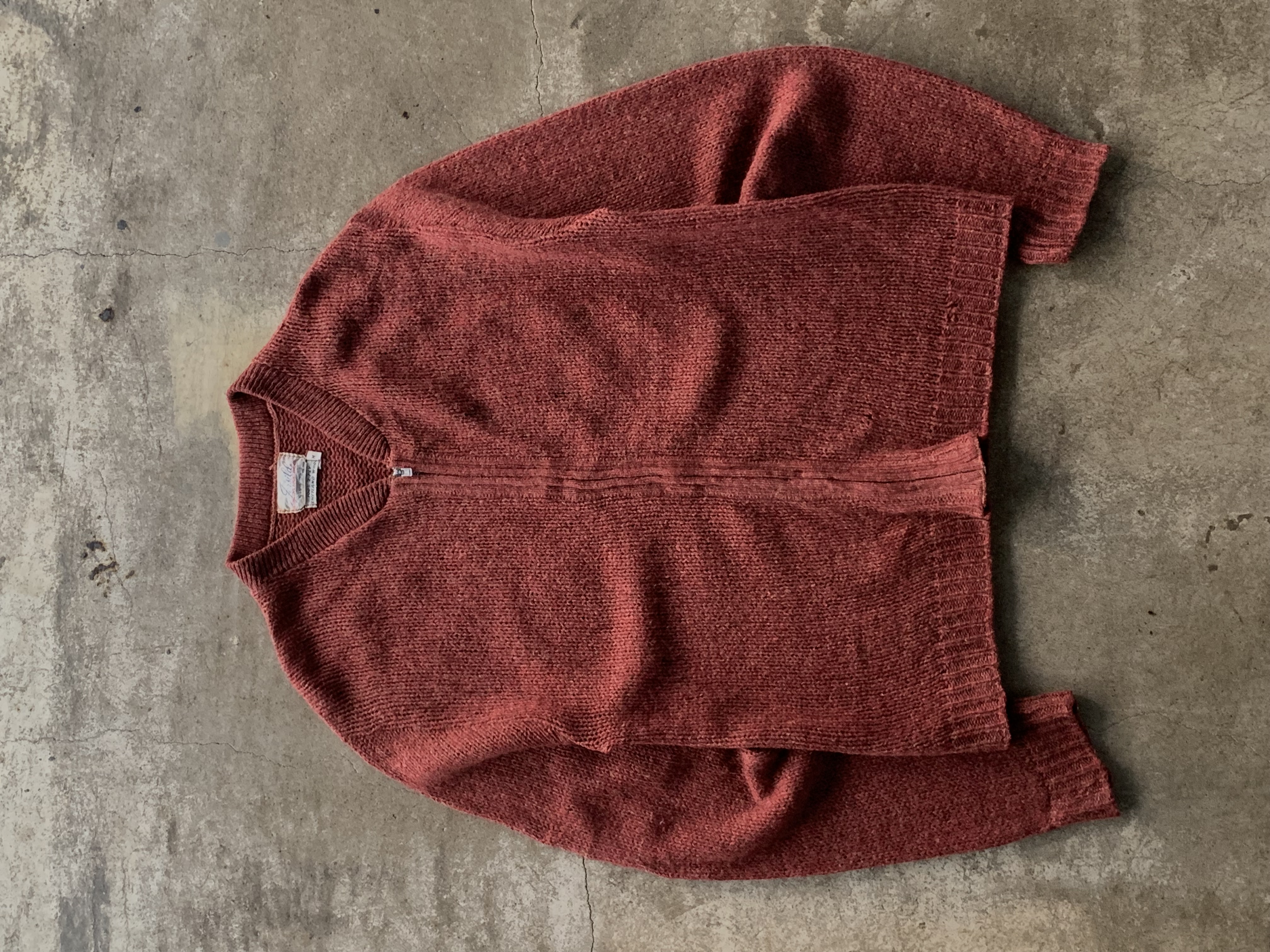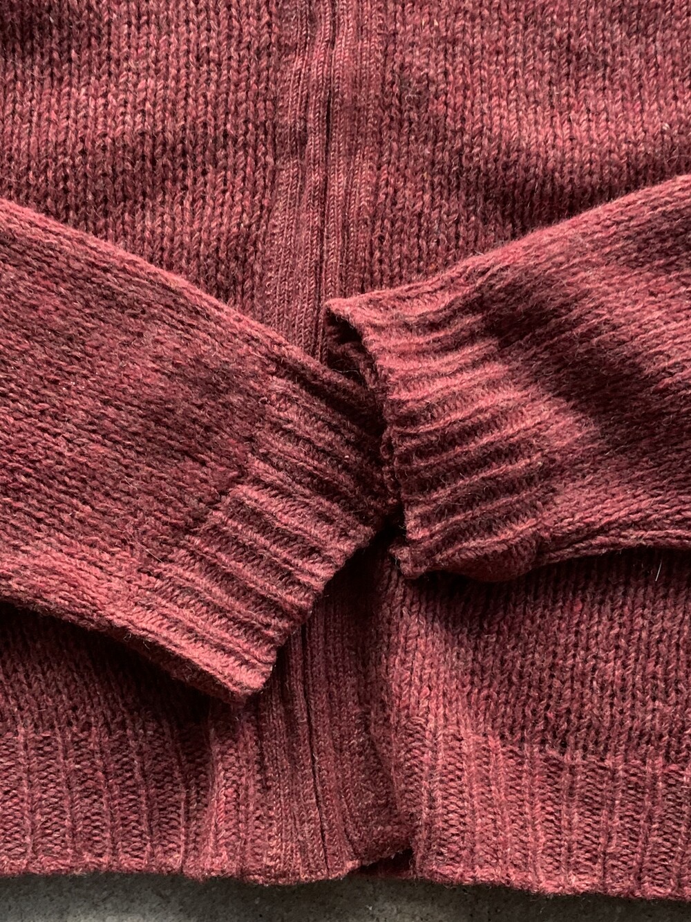아크릴 카디건 정도의 두께감을 보이는 울 소재의 집업 카디건. 두 가지 색상의 실이 섞여 드러나는 오묘한 색상이 매력적인 제품입니다.
