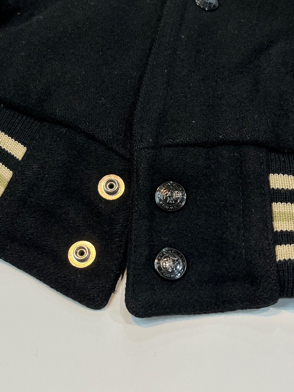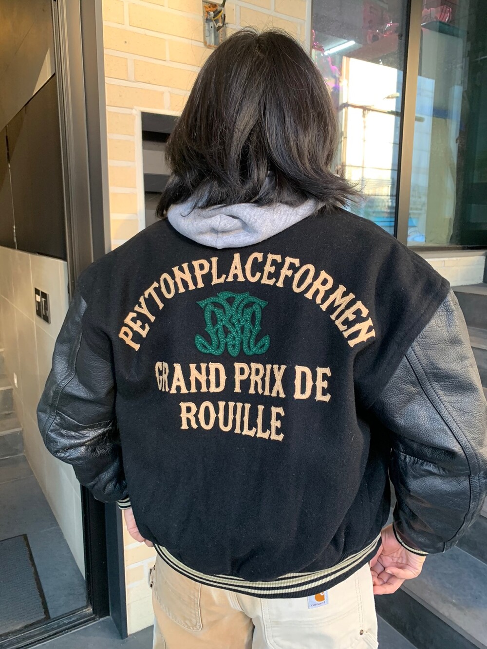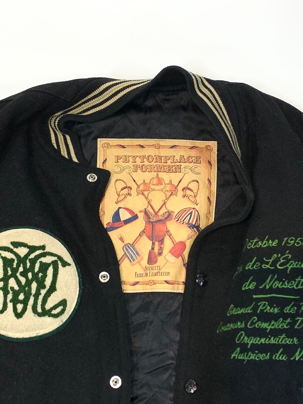 일본의 디자이너 브랜드 페이톤 플레이스 포 맨(PEYTON PLACE FOR MEN, PPFM) 의 1990년대 선보인 울/레더 소재의 바시티 자켓입니다. 블랙 컬러 바디에 카키, 그린 컬러 자수와 패치가 붙는 배색으로 전체적인 색조합에 구애받지 않고 착용할 수 있을만한 제품입니다.