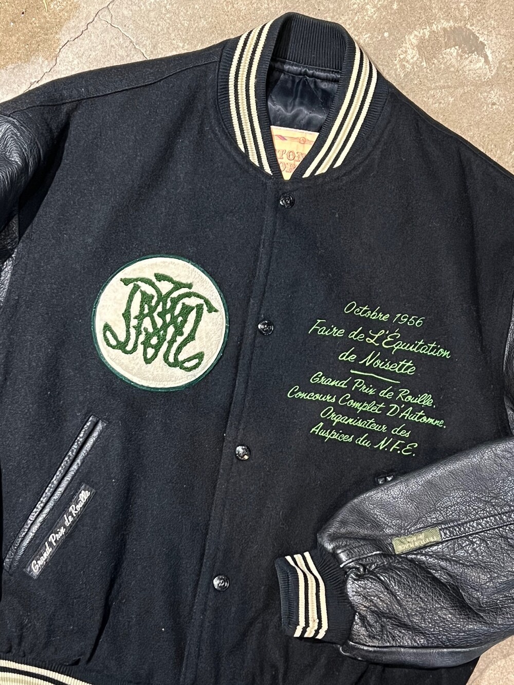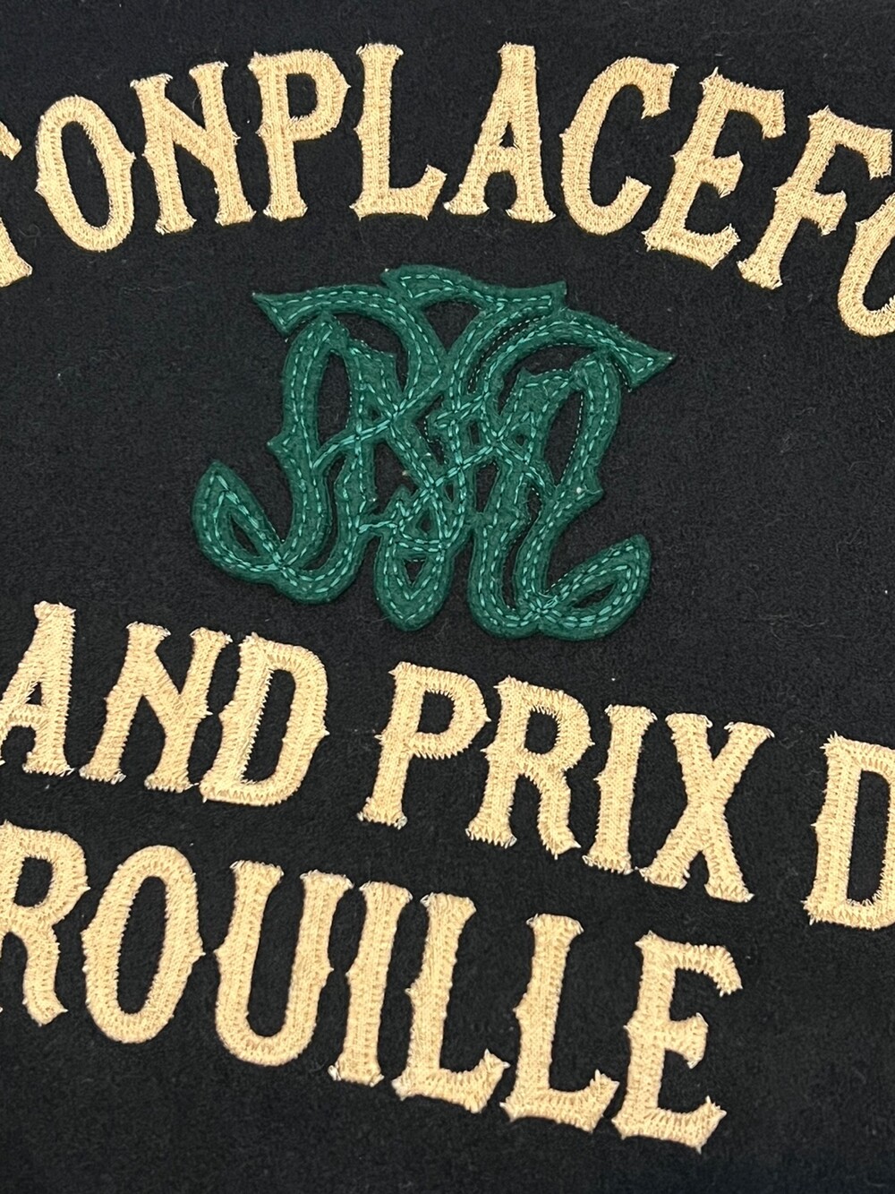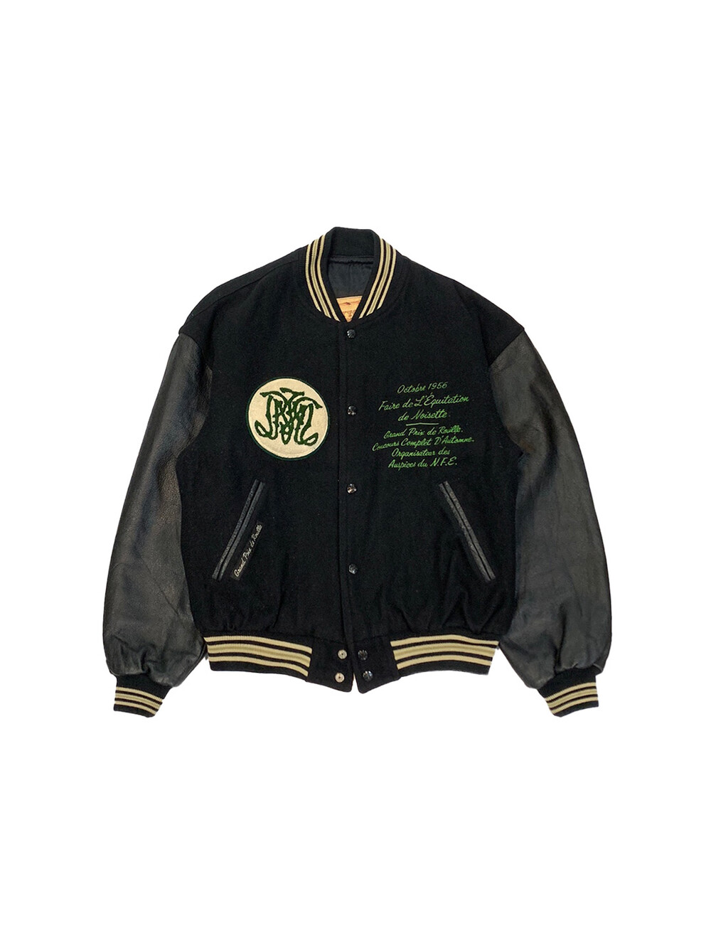 일본의 디자이너 브랜드 페이톤 플레이스 포 맨(PEYTON PLACE FOR MEN, PPFM) 의 1990년대 선보인 울/레더 소재의 바시티 자켓입니다. 블랙 컬러 바디에 카키, 그린 컬러 자수와 패치가 붙는 배색으로 전체적인 색조합에 구애받지 않고 착용할 수 있을만한 제품입니다.