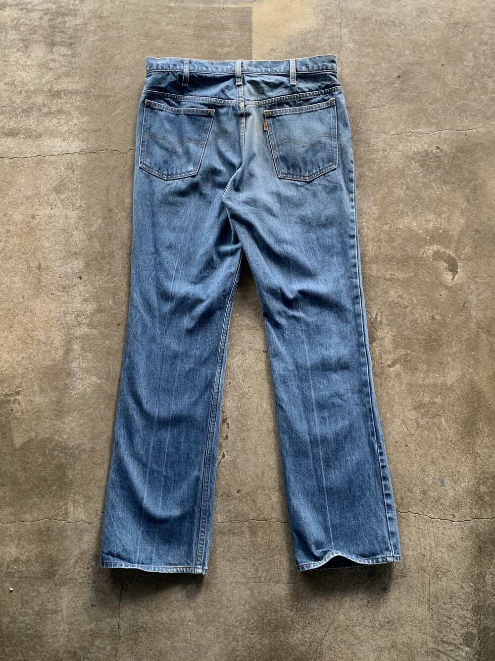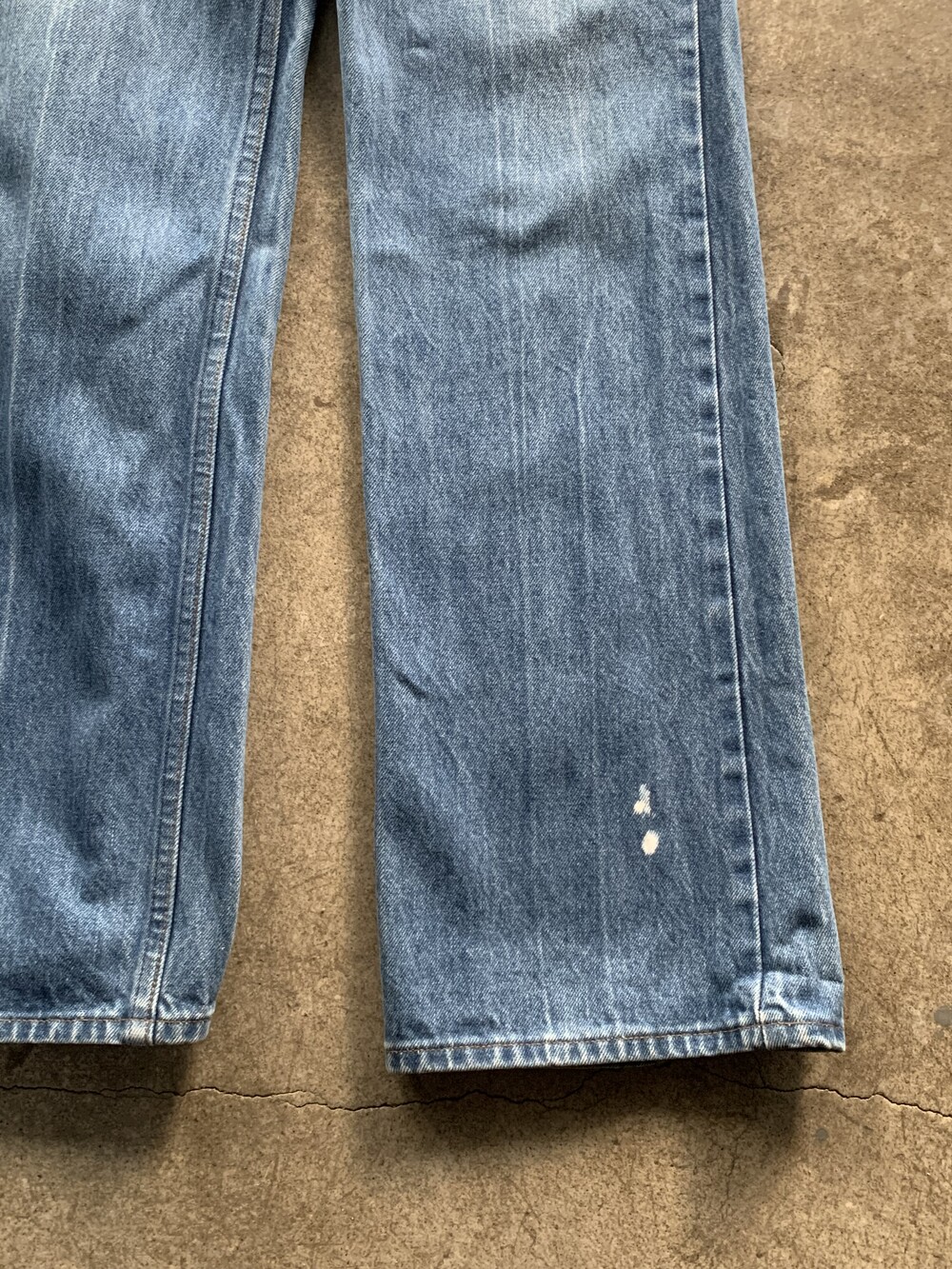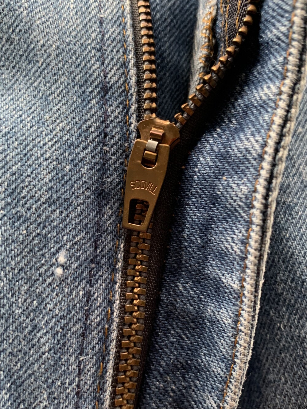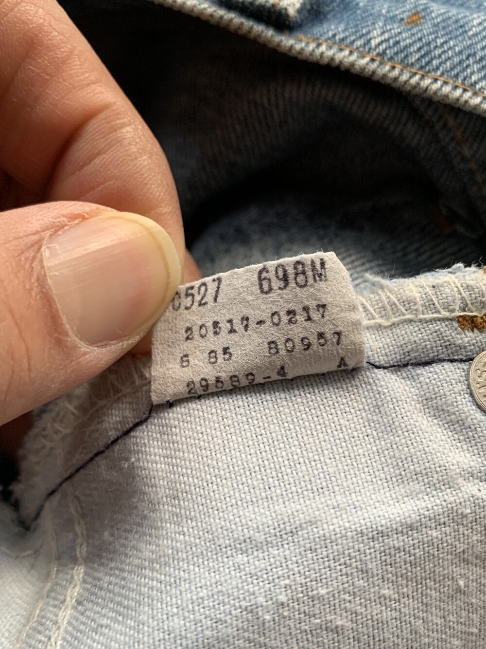 오렌지탭이 붙은 1985년 생산 미국 생산 리바이스 517 데님팬츠입니다. 무릎 너비와 밑단 너비의 대비가 크지 않은 완만한 부츠컷 실루엣이 돋보입니다. 자잘하게 깨지는듯한 페이딩 양상이나 스코빌(Scovill) 지퍼 등 1980년대 중반 생산 개체에서 확인할 수 있는 요소들이 더러 있습니다. 부츠컷다운 슬림한 비례감이 돋보이는 제품으로 정사이즈 기준 31인치 전후로 착용하는 분들에게 권장드립니다.