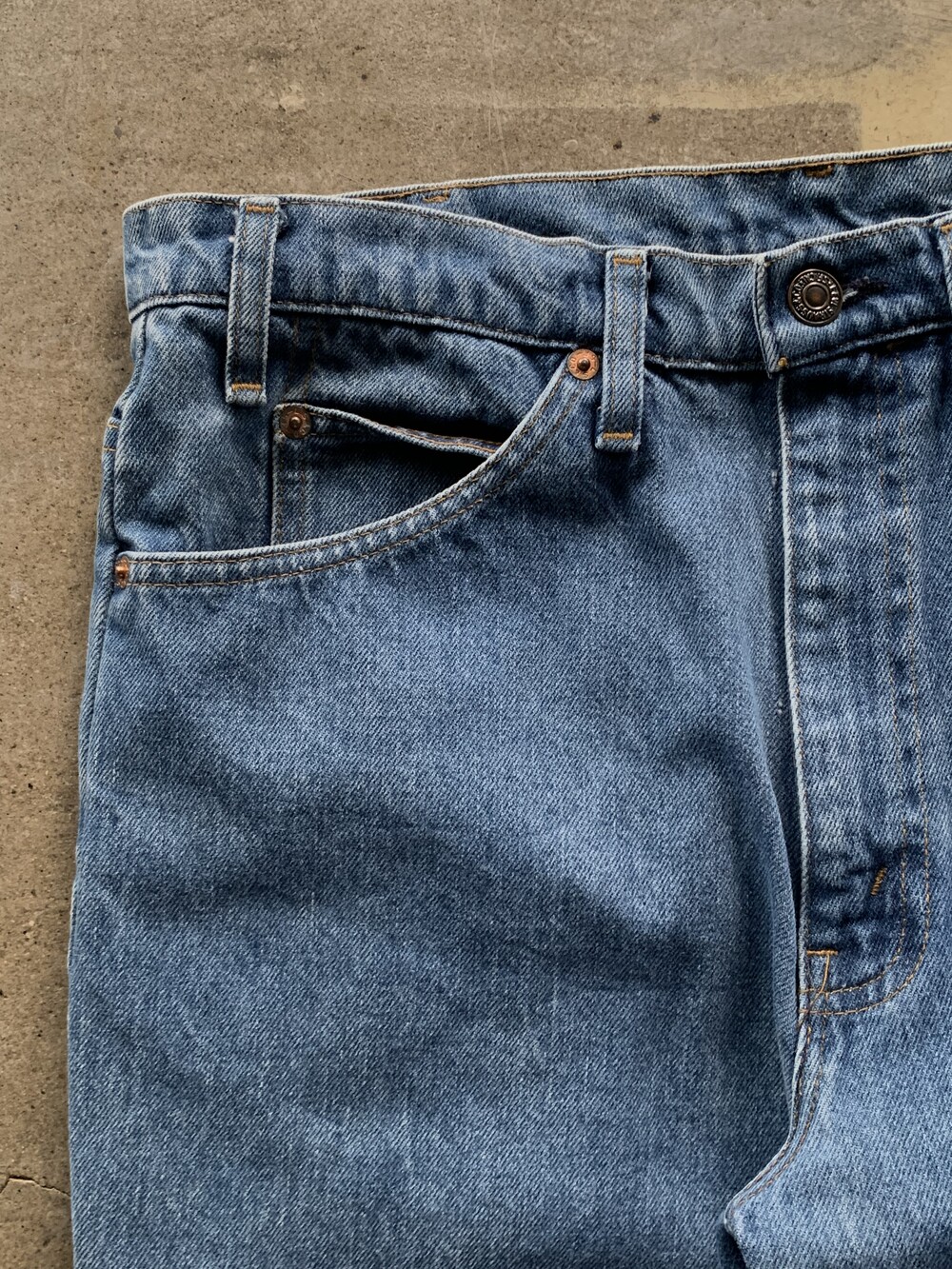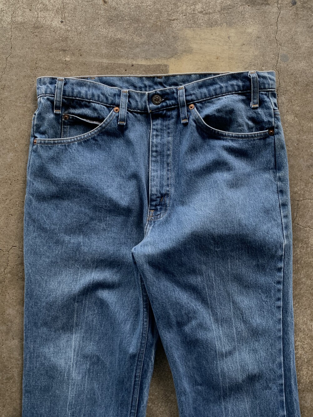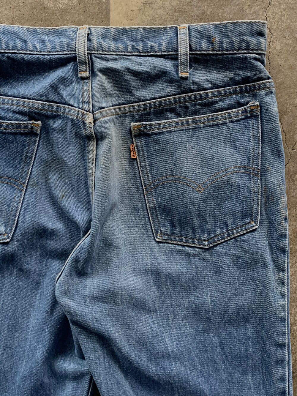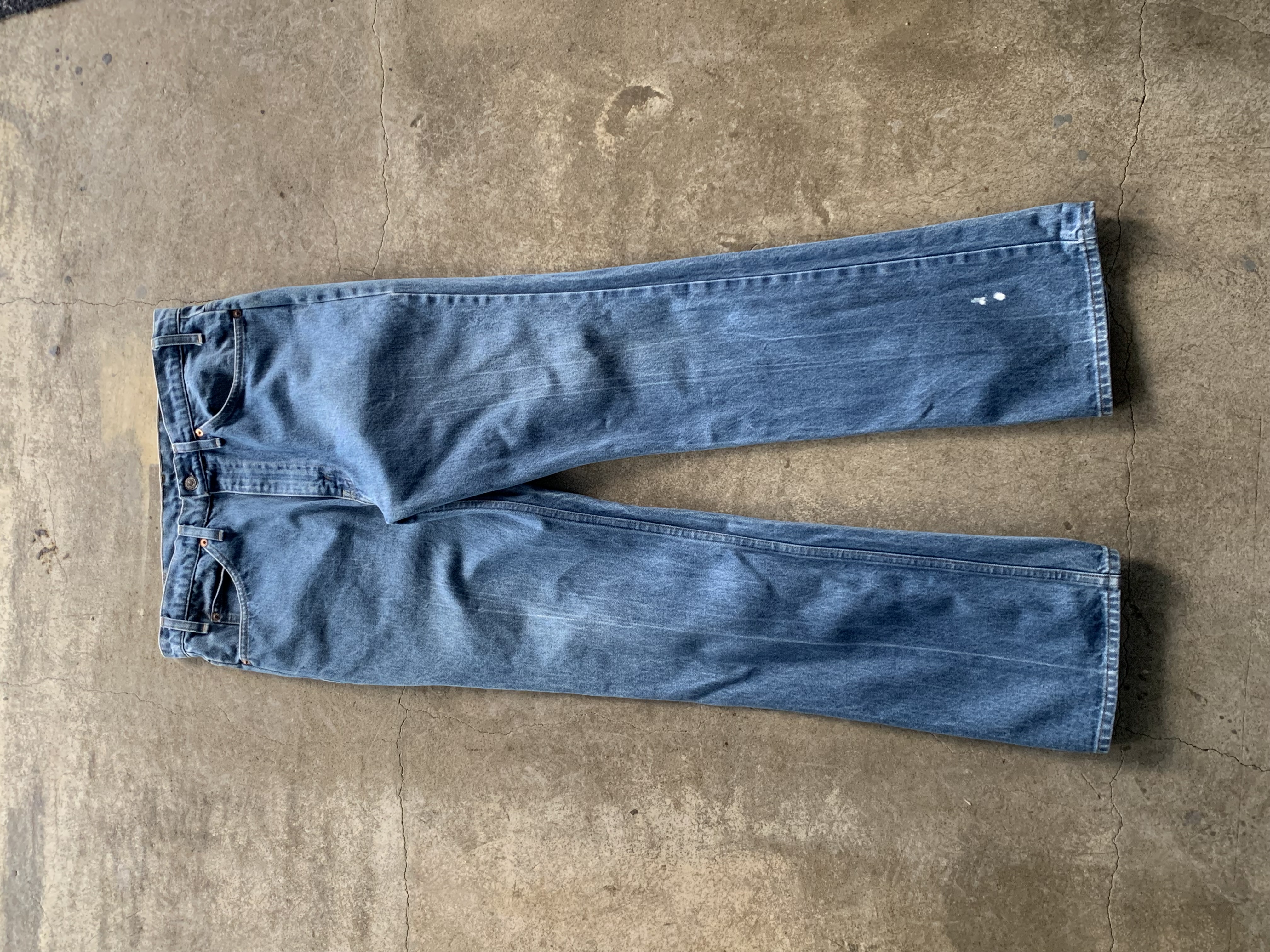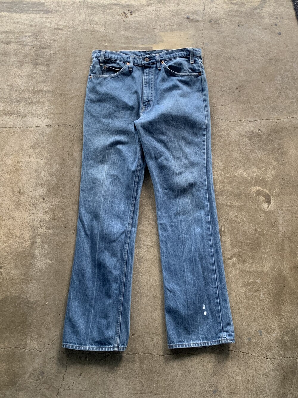 오렌지탭이 붙은 1985년 생산 미국 생산 리바이스 517 데님팬츠입니다. 무릎 너비와 밑단 너비의 대비가 크지 않은 완만한 부츠컷 실루엣이 돋보입니다. 자잘하게 깨지는듯한 페이딩 양상이나 스코빌(Scovill) 지퍼 등 1980년대 중반 생산 개체에서 확인할 수 있는 요소들이 더러 있습니다. 부츠컷다운 슬림한 비례감이 돋보이는 제품으로 정사이즈 기준 31인치 전후로 착용하는 분들에게 권장드립니다.