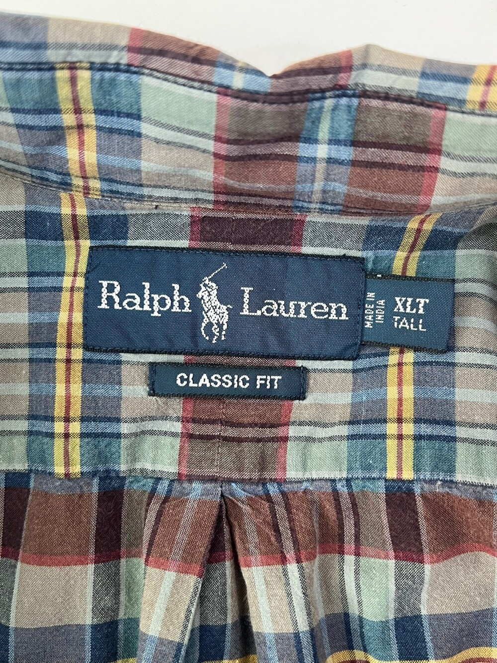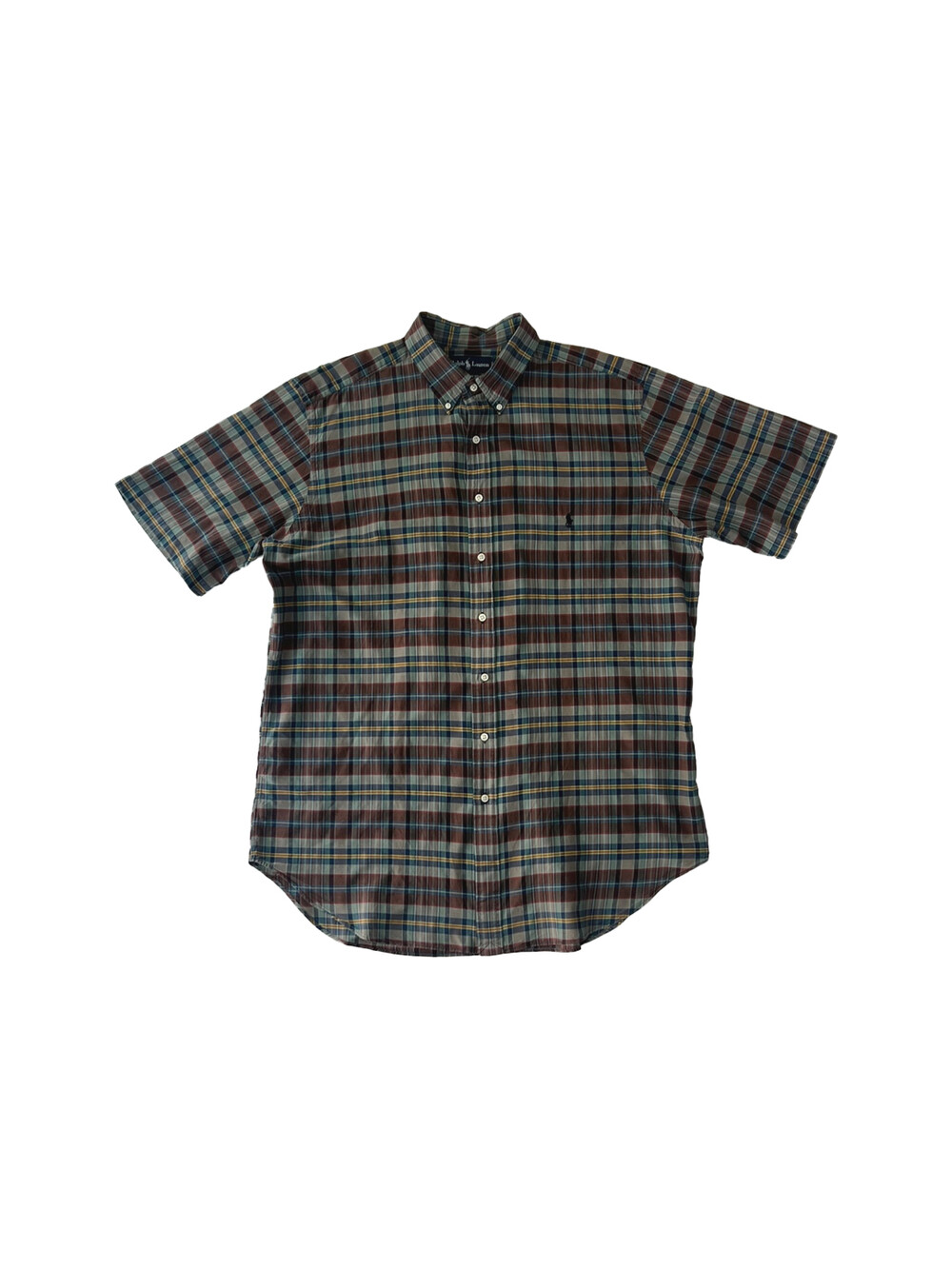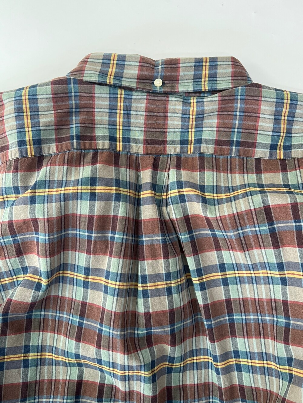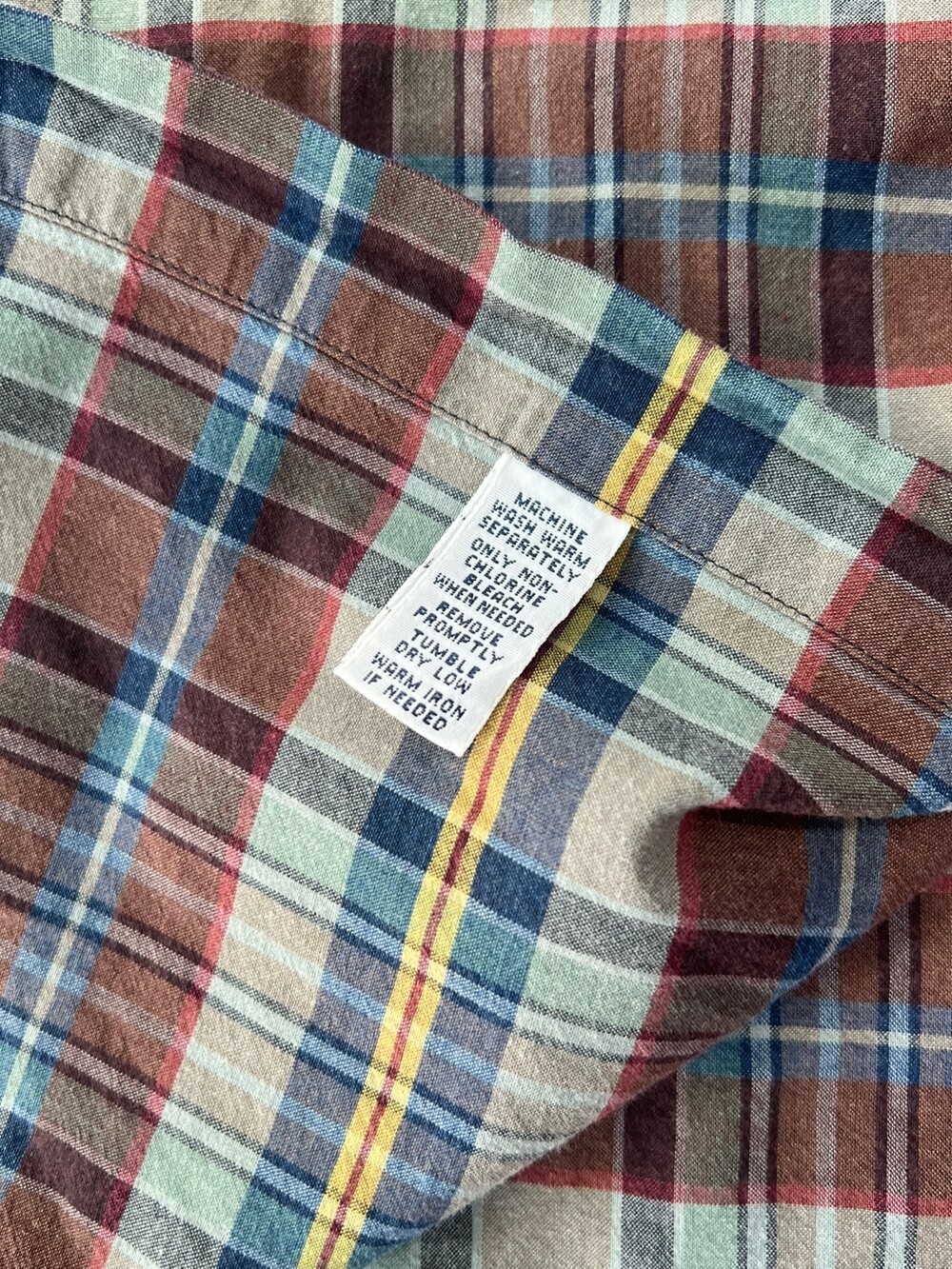 MADE IN INDIA 에서 추정할 수 있듯이 코튼 100% 의 평직으로 짜여진 마드라스 코튼 원단의 반팔 셔츠입니다. 마드라스 체크 특유의 희끄무레한 색감과 브라운과 블루 컬러 조합의 체크 배색이 매력적입니다. 얇고 가벼운 소재로 여름철에 활용하기 좋은 제품입니다.