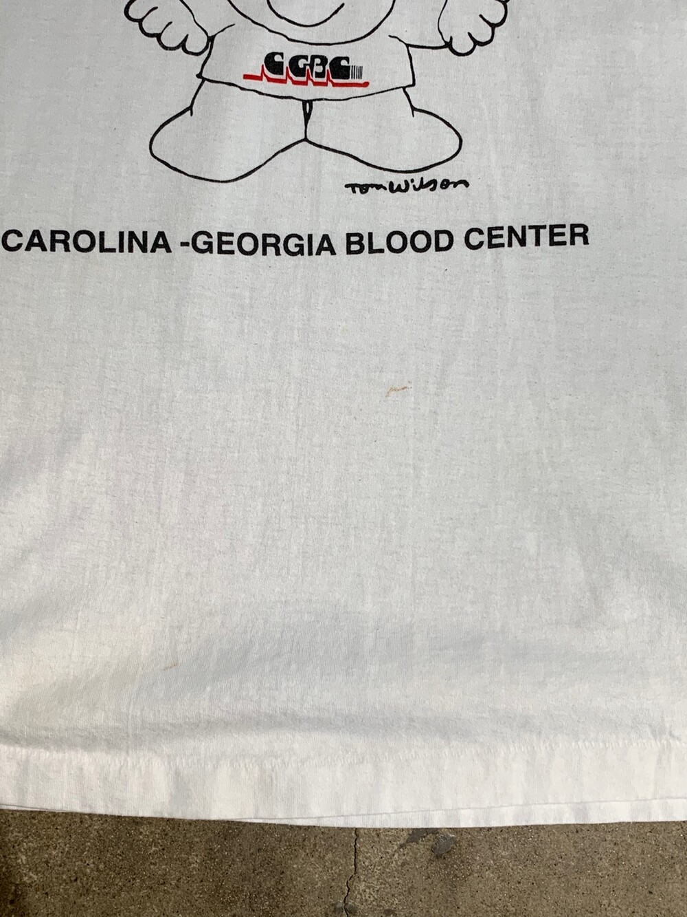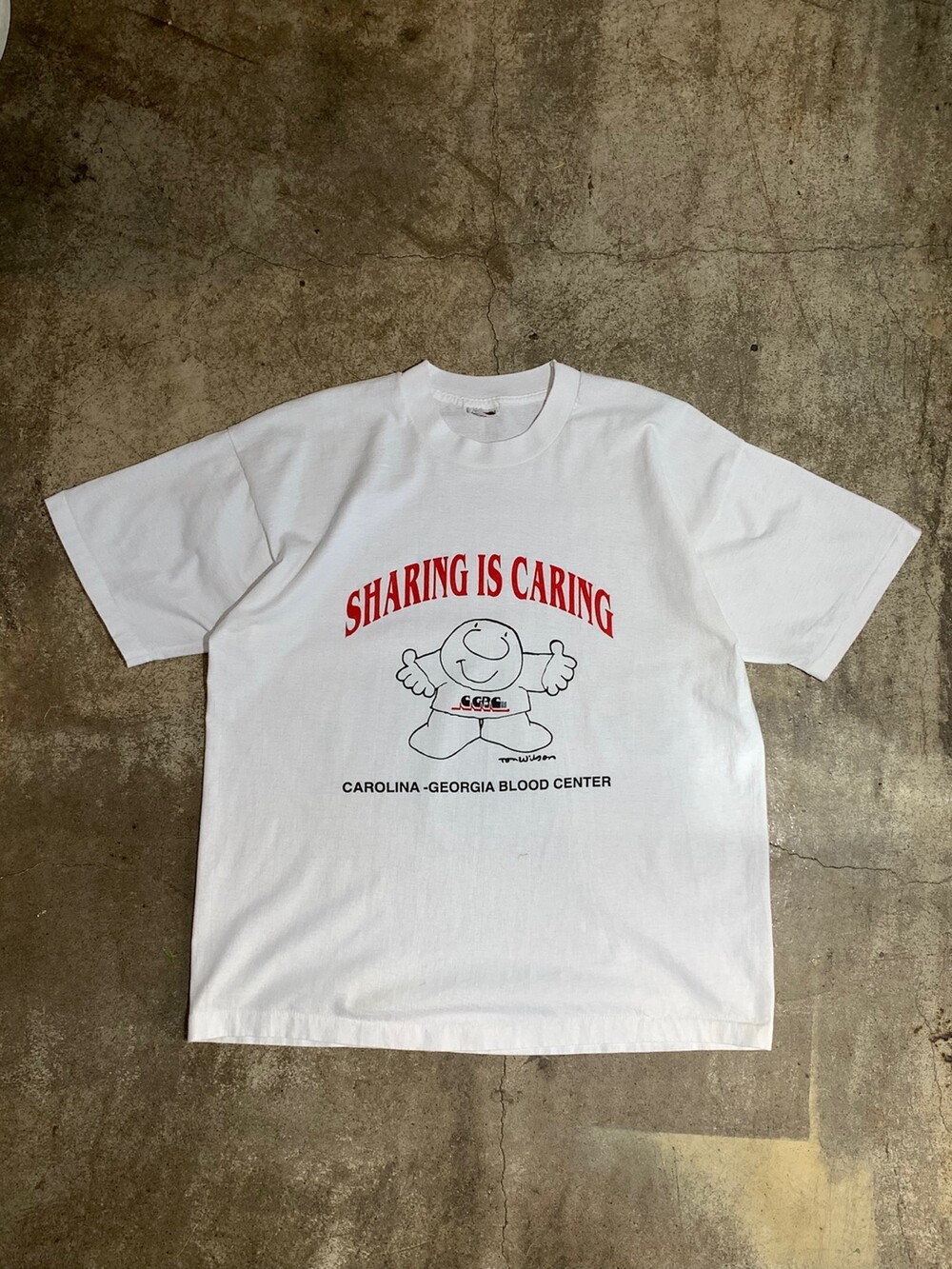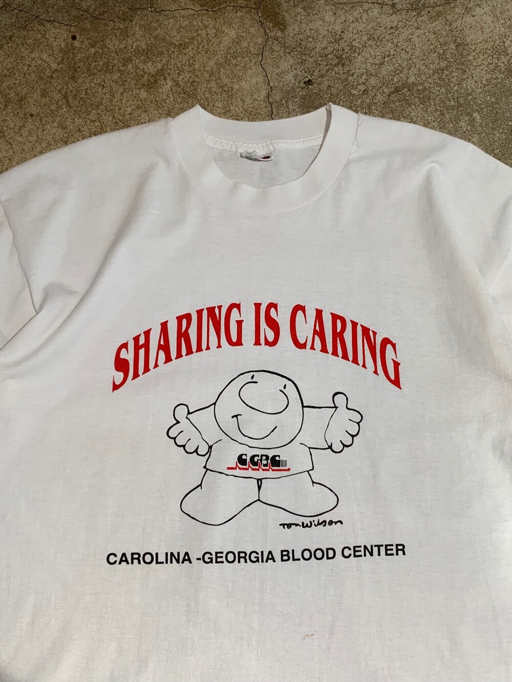 캐롤라이나 - 조지아 적십자사 주관으로 SHARING IS CARING 이라는 슬로건 아래 헌혈의 중요성을 강조하고 권유하는 프로모션 프린팅이 올려진 티셔츠.