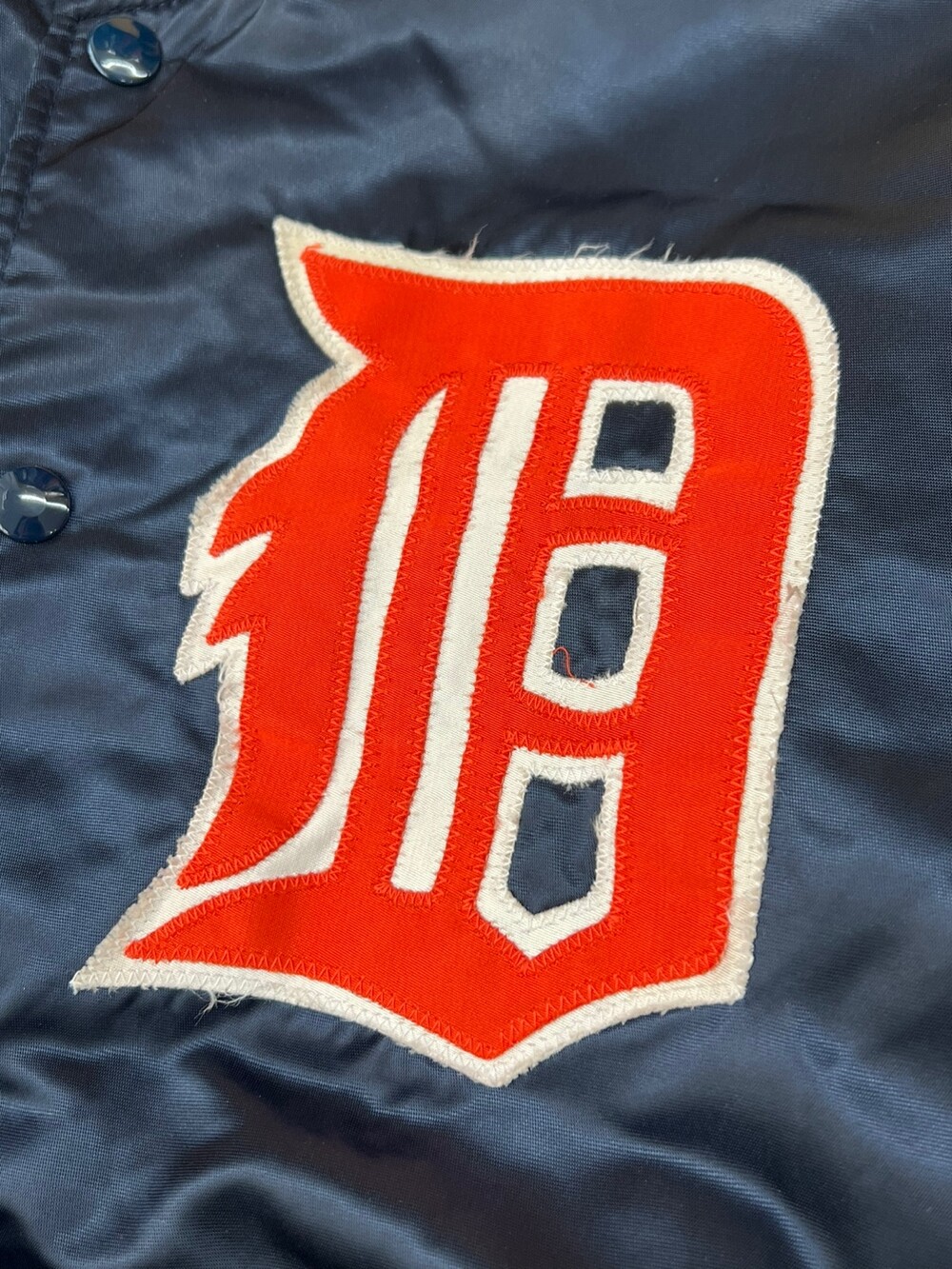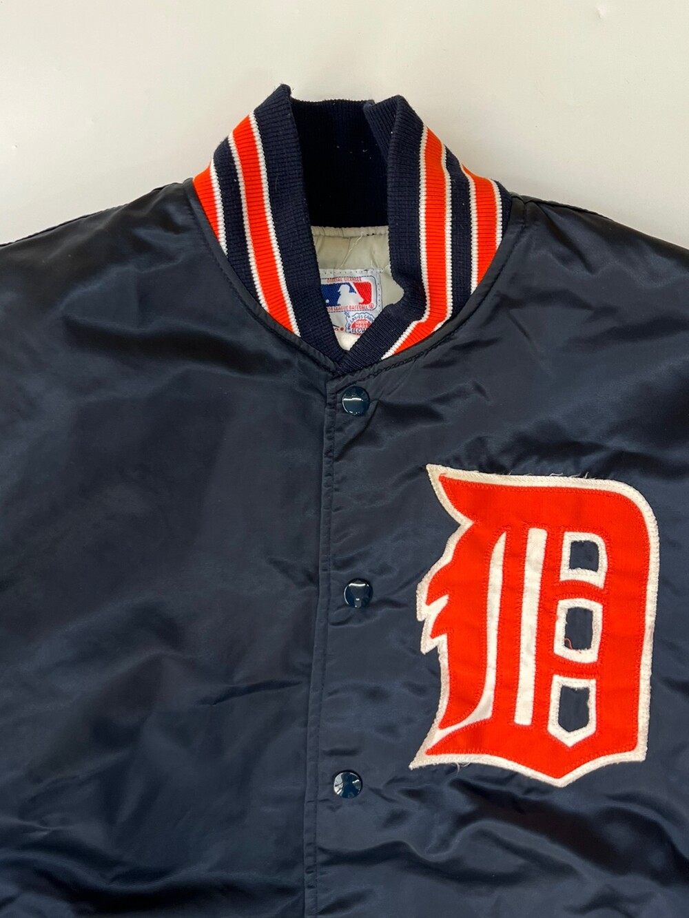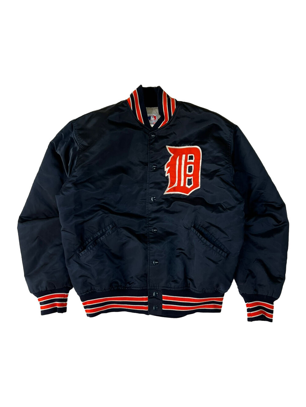 펠코(Felco)의 스타디움 자켓은 동일 연식의 스타터(Starter) 제품에 비해 소매나 밑단 립 너비가 여유로워 정사이즈로 입어도 좋지만, 오버사이징 했을 때 소매나 밑단 실루엣이 자연스럽게 떨어져 스타터의 팀 자켓에 비해 사이즈 범용성이 좋은 제품입니다. 메이저리그 참가하는 아메리칸 리그 중부지구 소속 디트로이트 타이거스(Detroit Tigers)를 상징하는 컬러인 네이비 베이스 위에 오렌지 컬러 로고와 스트라이프가 포인트가 되는, 애슬래틱한 무드의 배색이 돋보이는 제품입니다.